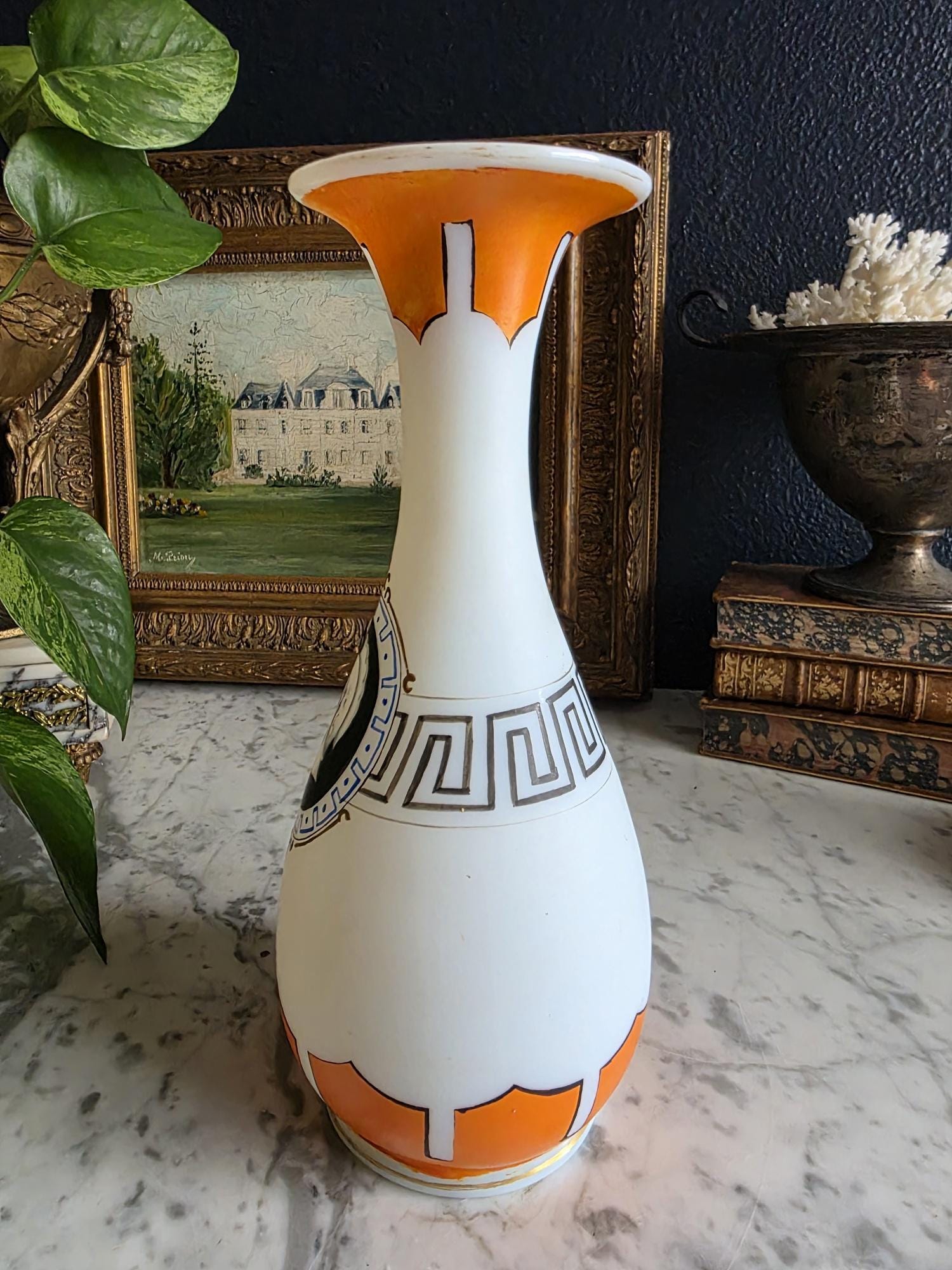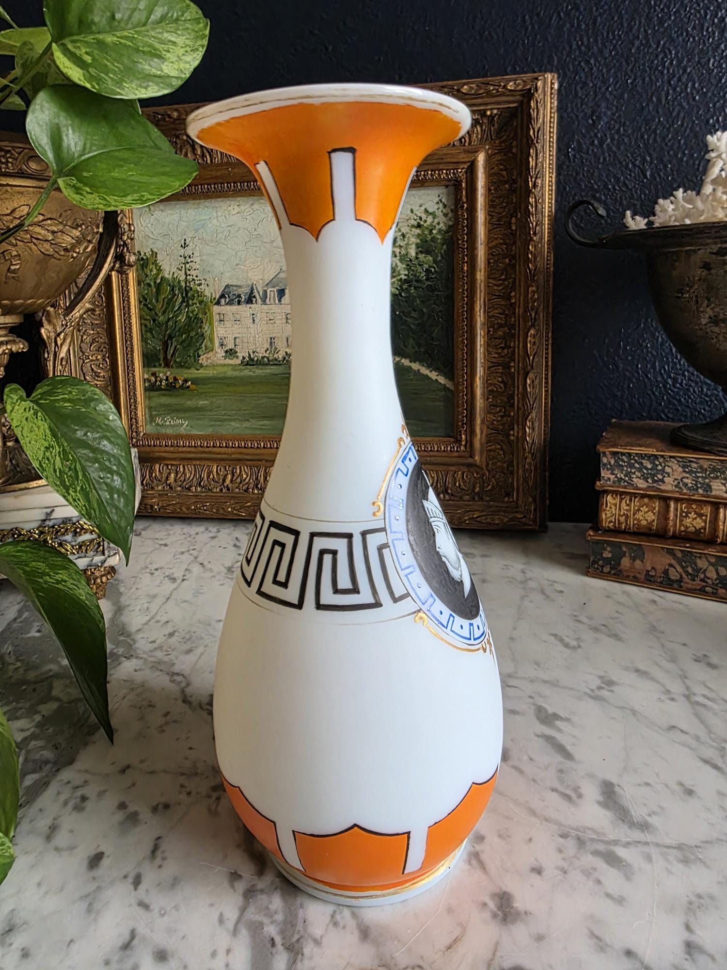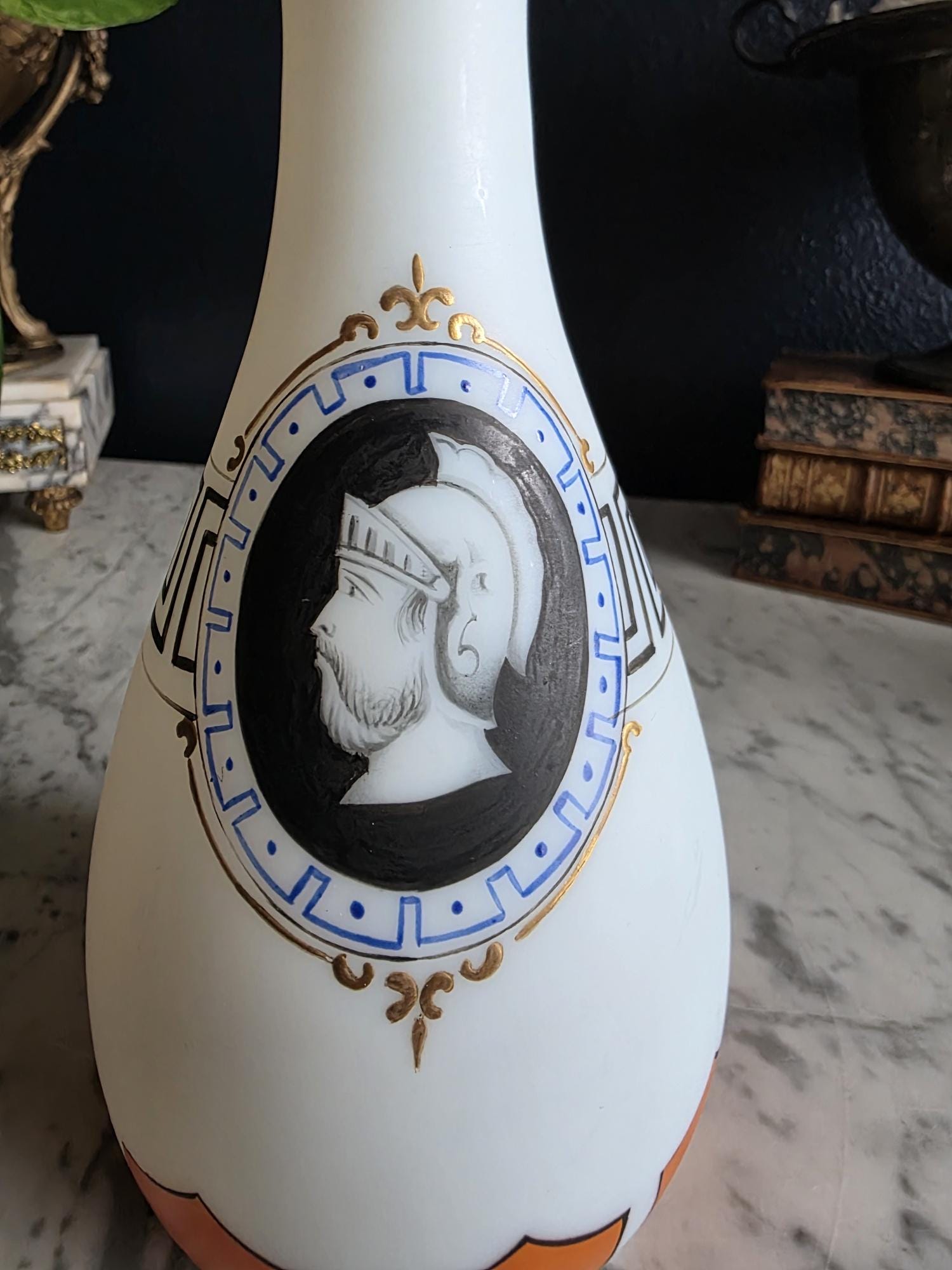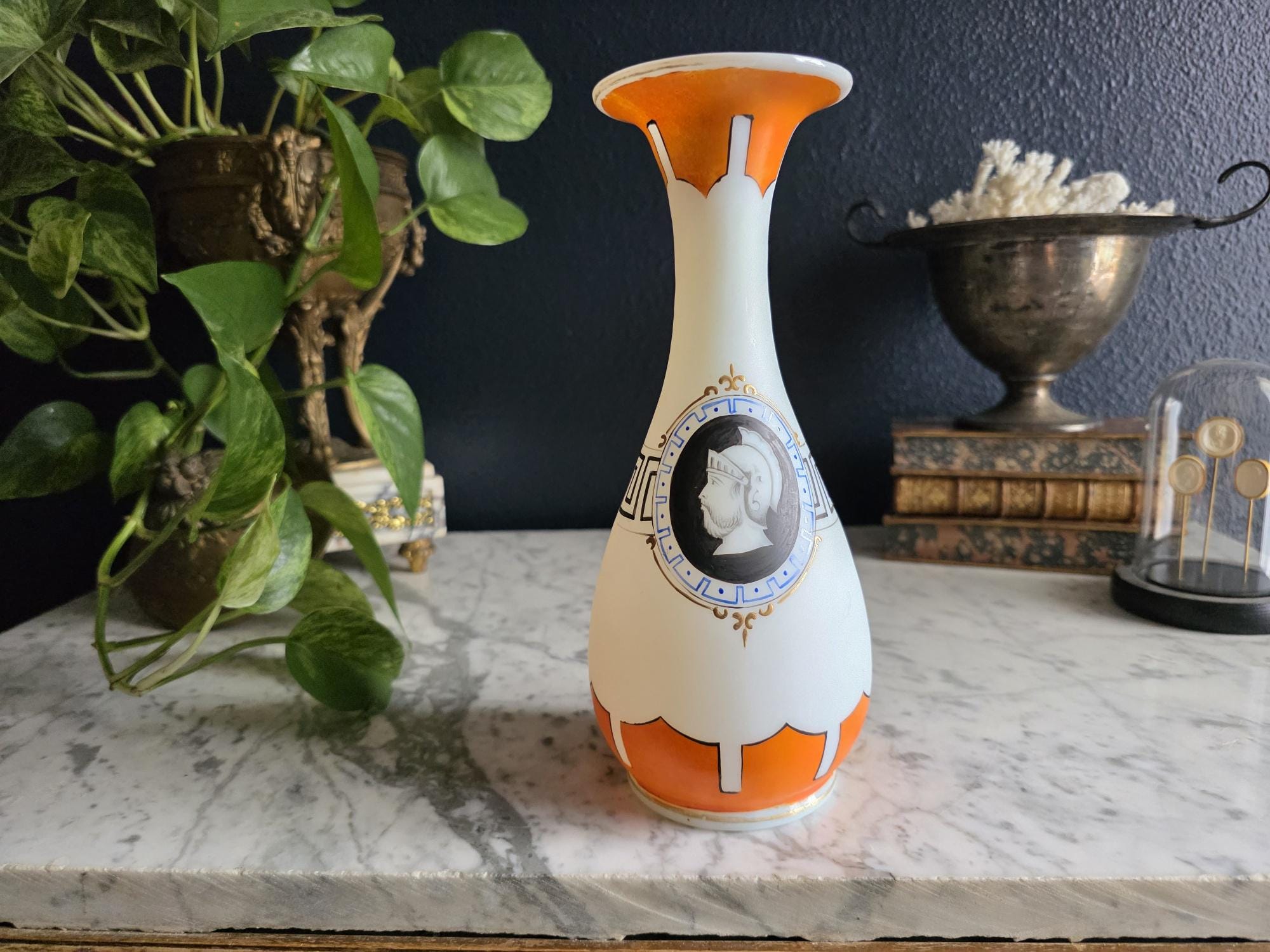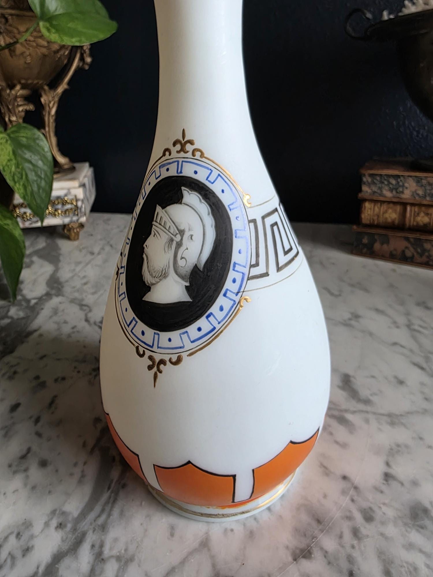 Presenting a striking 1860s hand-blown vessel, beautifully exhibiting the Neoclassical Revival style popular during the era. This exceptional piece of Victorian Opaline Bristol Glass features a classic silhouette with a flared trumpet neck and a bulbous lower body, vividly adorned with hand-painted orange geometric accents at the rim and base. A stunning central cartouche displays a finely detailed grisaille profile of a helmeted classical warrior, framed by a patterned blue border with delicate gilt flourishes. This focal point is anchored by a bold, hand-painted black Greek key band circling the neck, giving the piece a distinct Etruscan influence. The semi-opaque glass itself possesses the characteristic milky translucence prized by collectors, and the underside displays a rough pontil scar—a definitive mark of mid-19th-century artisanal glassblowing. Standing out as a highly desirable example among Antique Bristol Glass Portrait Vases, its exquisite enamel work, material quality, and striking historical themes make this English vessel a superb Neoclassical collector's piece. The guilt details around the rim of the vase and body have worn overtime and is now missing in some places.