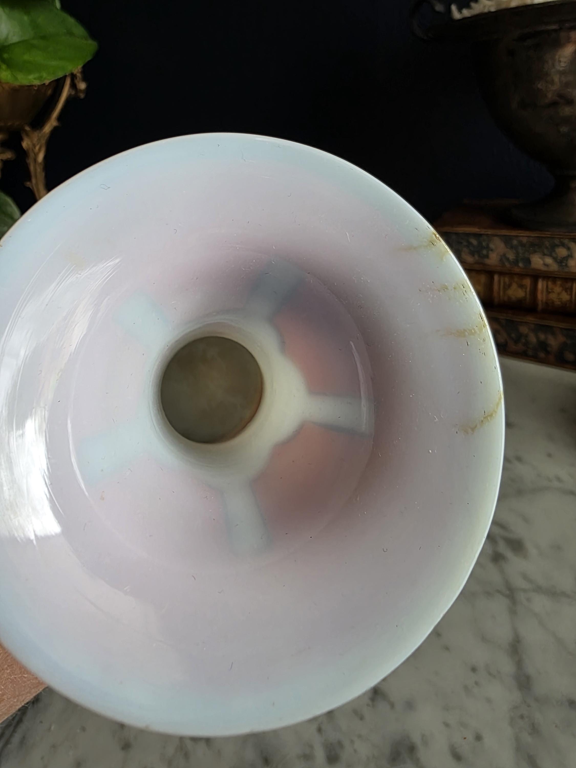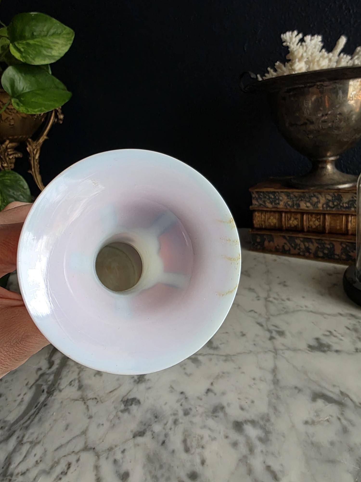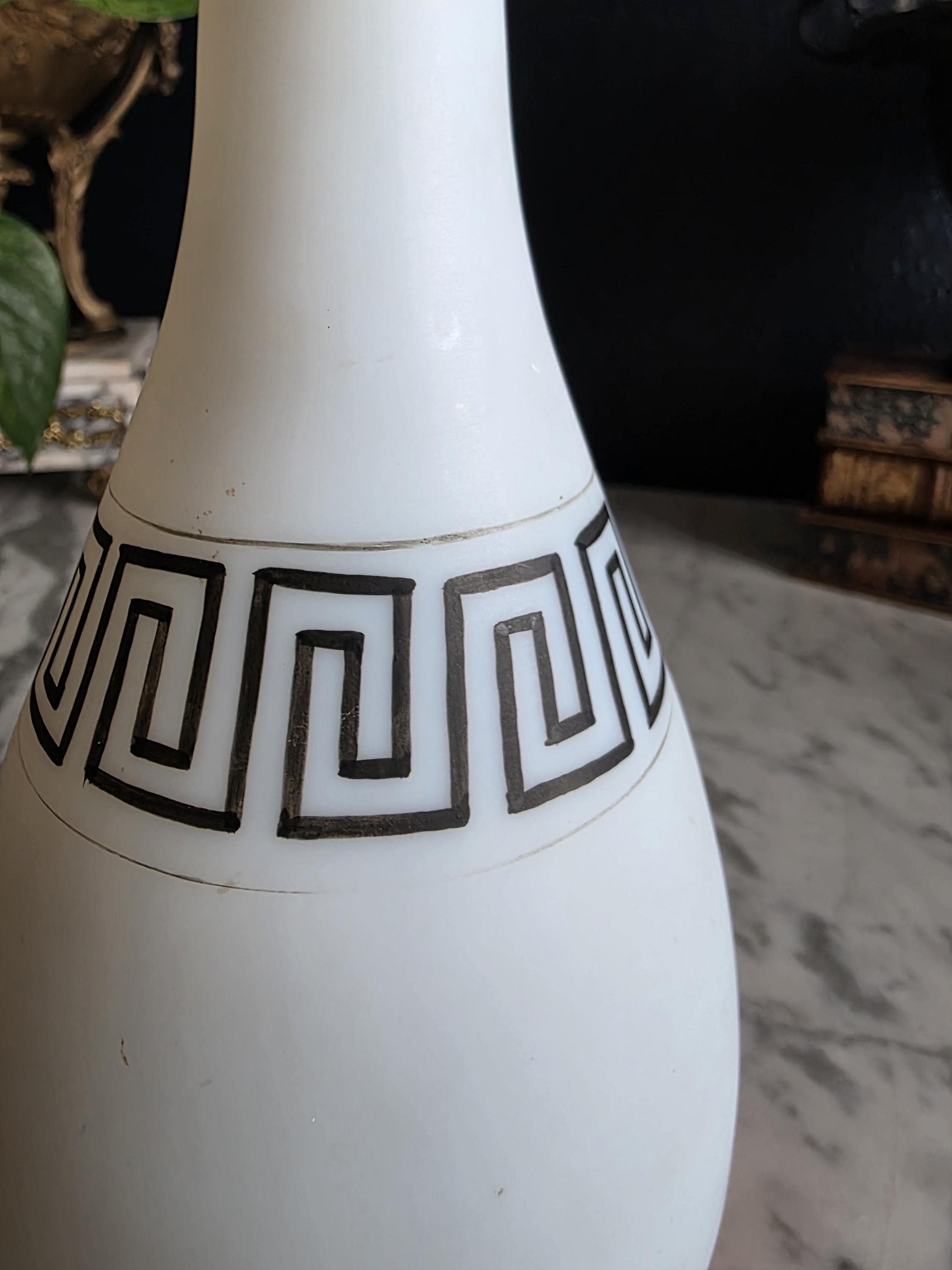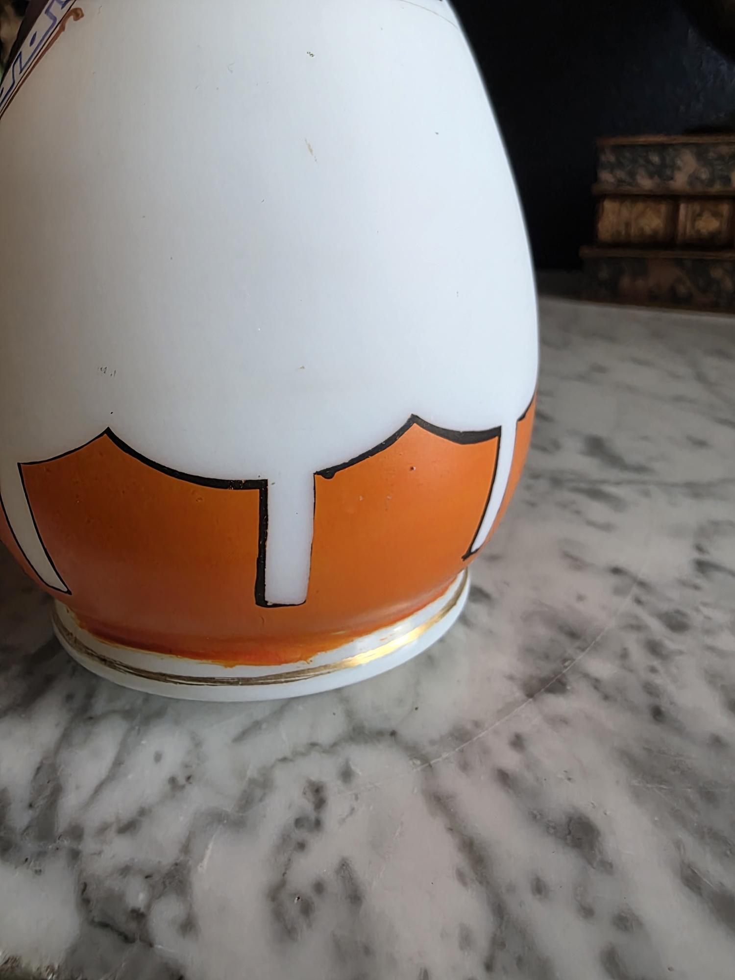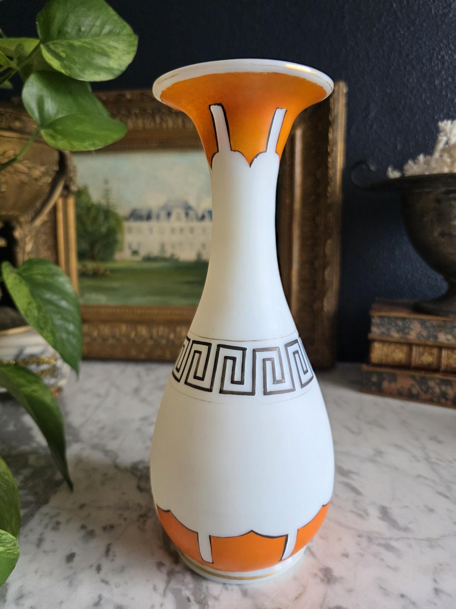 Presenting a striking 1860s hand-blown vessel, beautifully exhibiting the Neoclassical Revival style popular during the era. This exceptional piece of Victorian Opaline Bristol Glass features a classic silhouette with a flared trumpet neck and a bulbous lower body, vividly adorned with hand-painted orange geometric accents at the rim and base. A stunning central cartouche displays a finely detailed grisaille profile of a helmeted classical warrior, framed by a patterned blue border with delicate gilt flourishes. This focal point is anchored by a bold, hand-painted black Greek key band circling the neck, giving the piece a distinct Etruscan influence. The semi-opaque glass itself possesses the characteristic milky translucence prized by collectors, and the underside displays a rough pontil scar—a definitive mark of mid-19th-century artisanal glassblowing. Standing out as a highly desirable example among Antique Bristol Glass Portrait Vases, its exquisite enamel work, material quality, and striking historical themes make this English vessel a superb Neoclassical collector's piece. The guilt details around the rim of the vase and body have worn overtime and is now missing in some places.