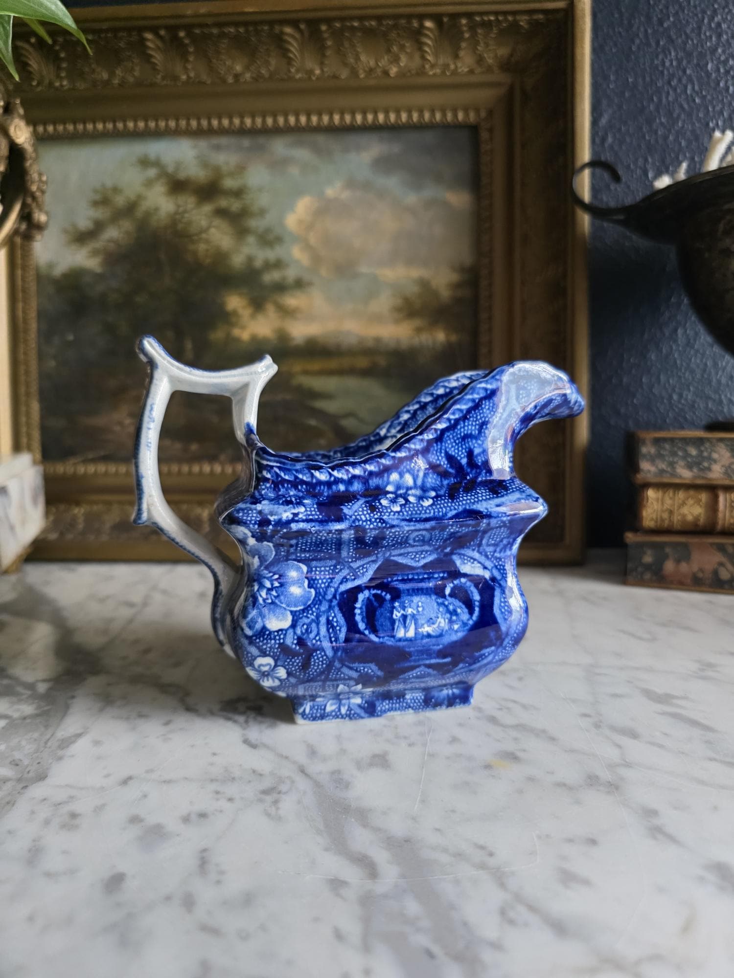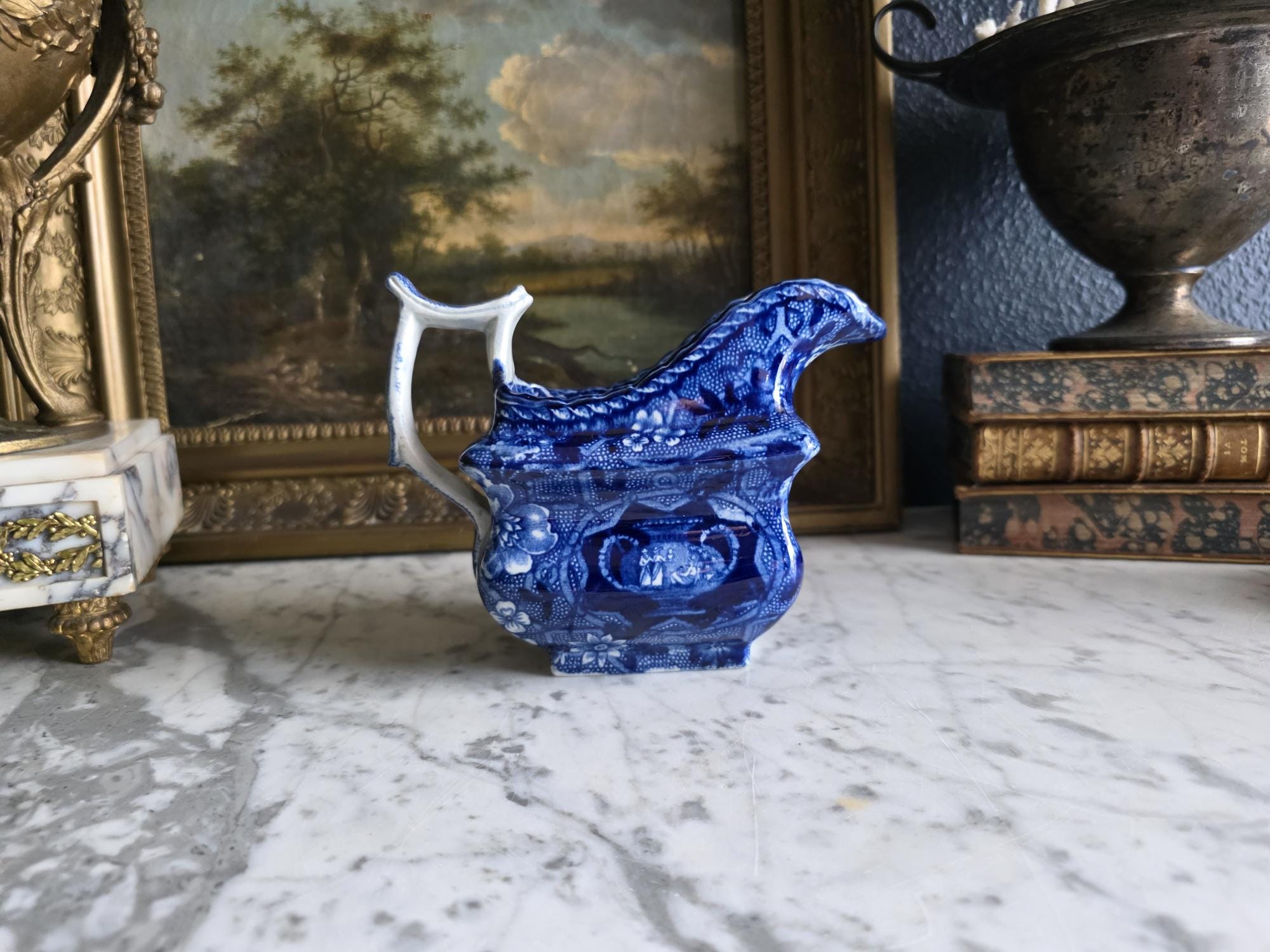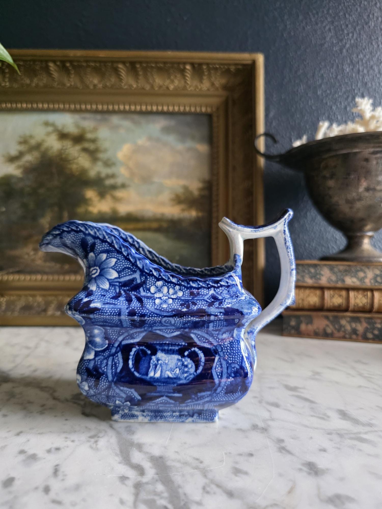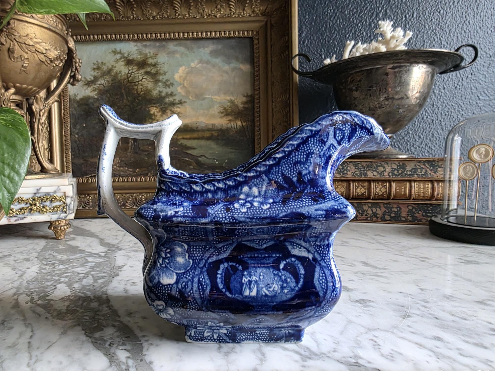 Presenting a stunning piece of early 19th-century English ceramics, this circa 1830 Staffordshire creamer pitcher showcases the deep, mesmerizing ink-blue hues characteristic of early Flow Blue cobalt transferware. The pitcher features an elegant, exaggerated sweeping spout and a highly articulated handle complete with a pronounced thumb rest, capturing the striking, dramatic silhouettes of the late Georgian to early Victorian eras. Its intricate transfer-printed pattern is a visual feast, boasting a dense, lace-like floral background that perfectly frames a classical romantic cartouche. The intense color pooling and slight, characteristic blurring of the glaze create a striking atmospheric presence, making it an exceptional styling piece. Bearing a small underglaze blue mark on the base, the piece exhibits beautiful, heavy crazing throughout the thick glaze, serving as a testament to its nearly two centuries of age. It remains in wonderful antique condition, with the interior showing expected signs of historical use and minor, age-appropriate wear along the extremities that only enhances its authentic, time-worn character. This creamer is in beautiful antique condition with no chips, cracks, breaks, or noticeable staining.