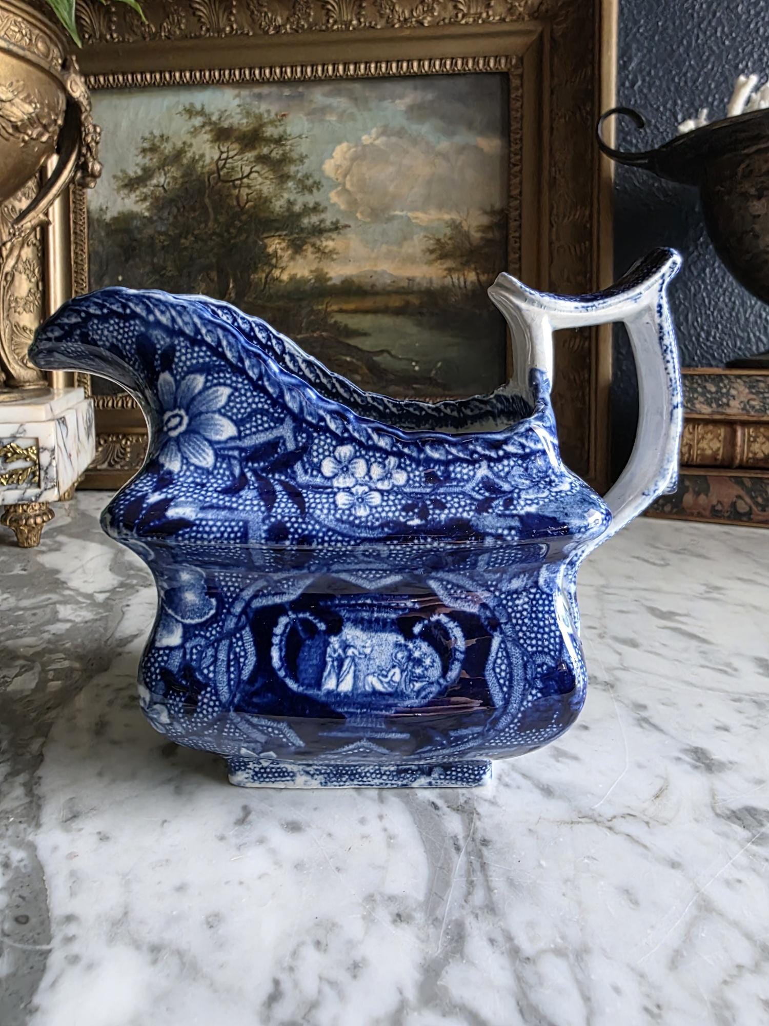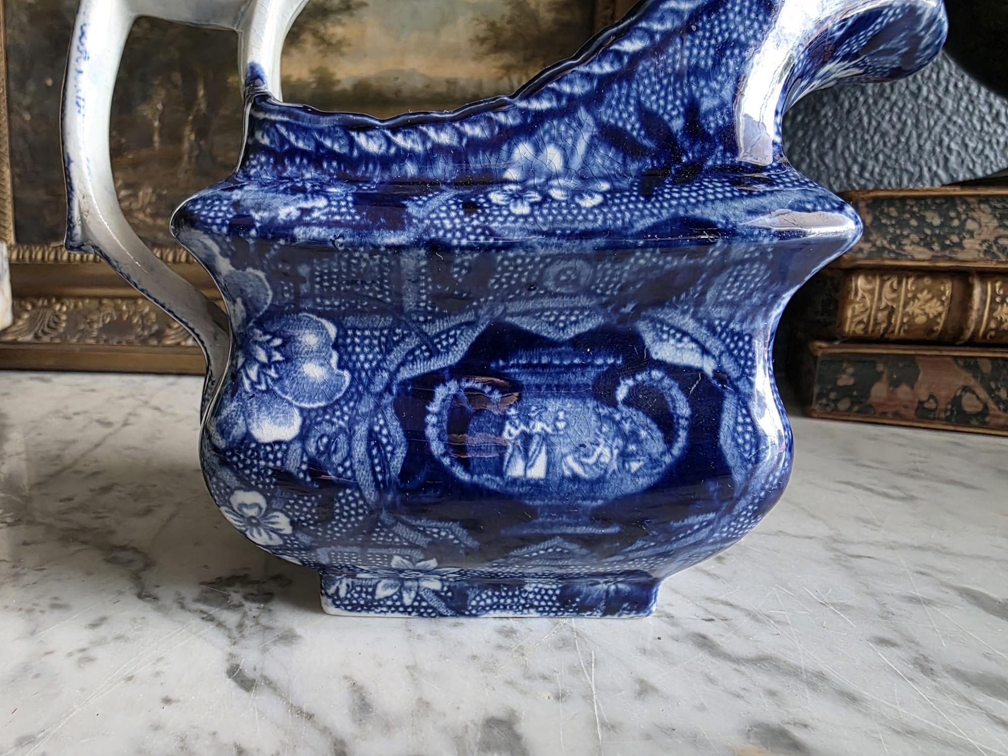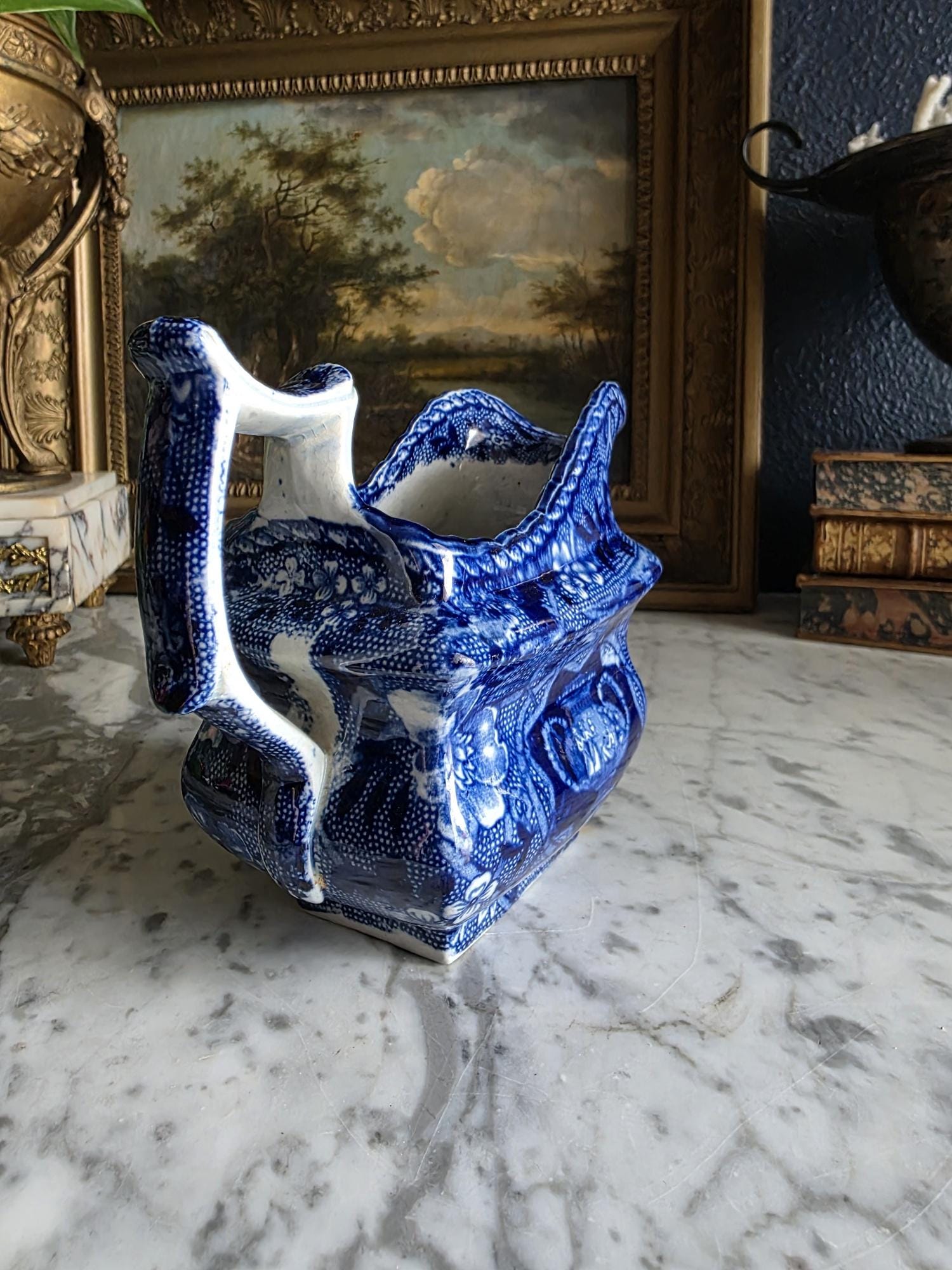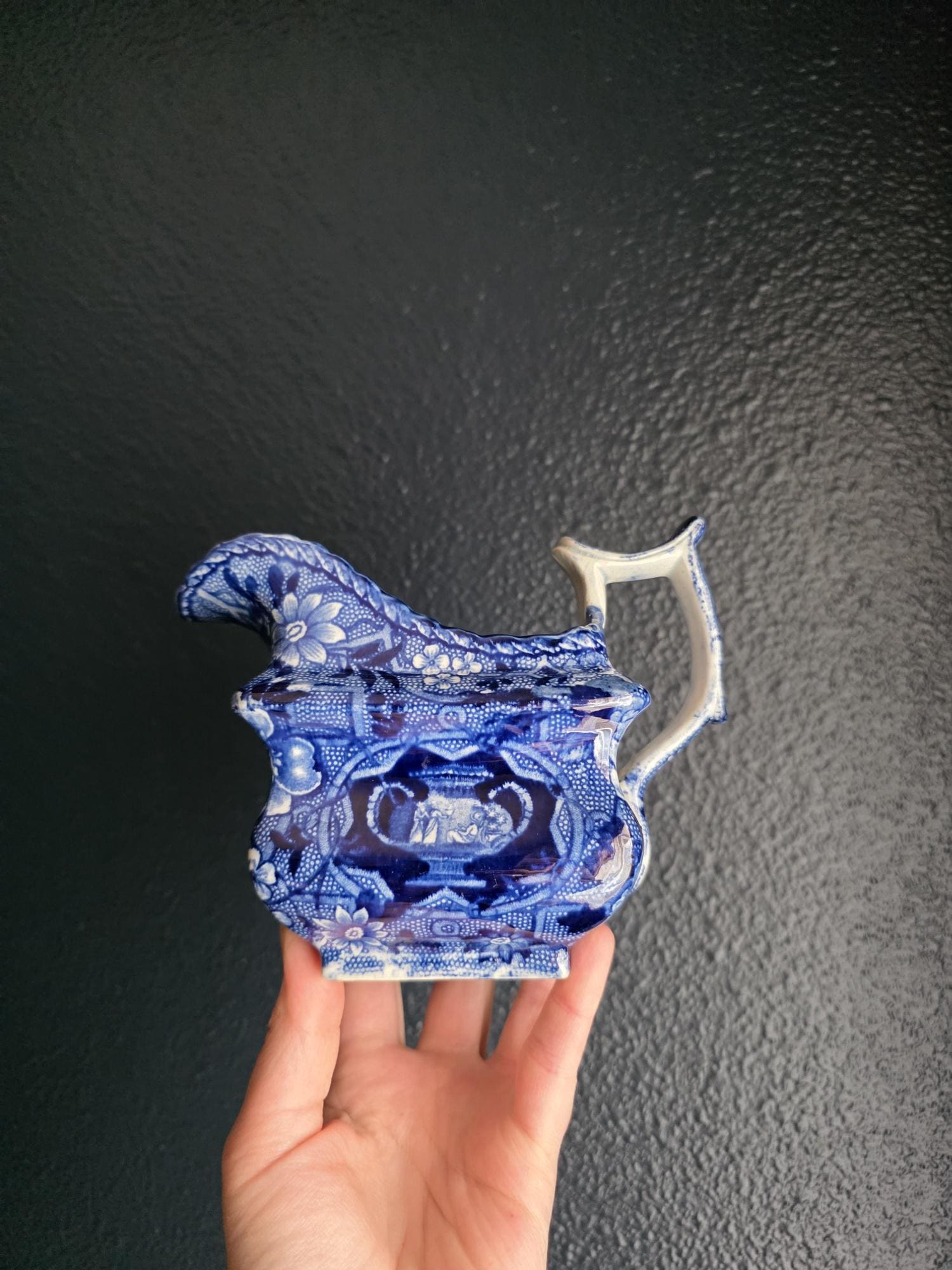 Presenting a stunning piece of early 19th-century English ceramics, this circa 1830 Staffordshire creamer pitcher showcases the deep, mesmerizing ink-blue hues characteristic of early Flow Blue cobalt transferware. The pitcher features an elegant, exaggerated sweeping spout and a highly articulated handle complete with a pronounced thumb rest, capturing the striking, dramatic silhouettes of the late Georgian to early Victorian eras. Its intricate transfer-printed pattern is a visual feast, boasting a dense, lace-like floral background that perfectly frames a classical romantic cartouche. The intense color pooling and slight, characteristic blurring of the glaze create a striking atmospheric presence, making it an exceptional styling piece. Bearing a small underglaze blue mark on the base, the piece exhibits beautiful, heavy crazing throughout the thick glaze, serving as a testament to its nearly two centuries of age. It remains in wonderful antique condition, with the interior showing expected signs of historical use and minor, age-appropriate wear along the extremities that only enhances its authentic, time-worn character. This creamer is in beautiful antique condition with no chips, cracks, breaks, or noticeable staining.