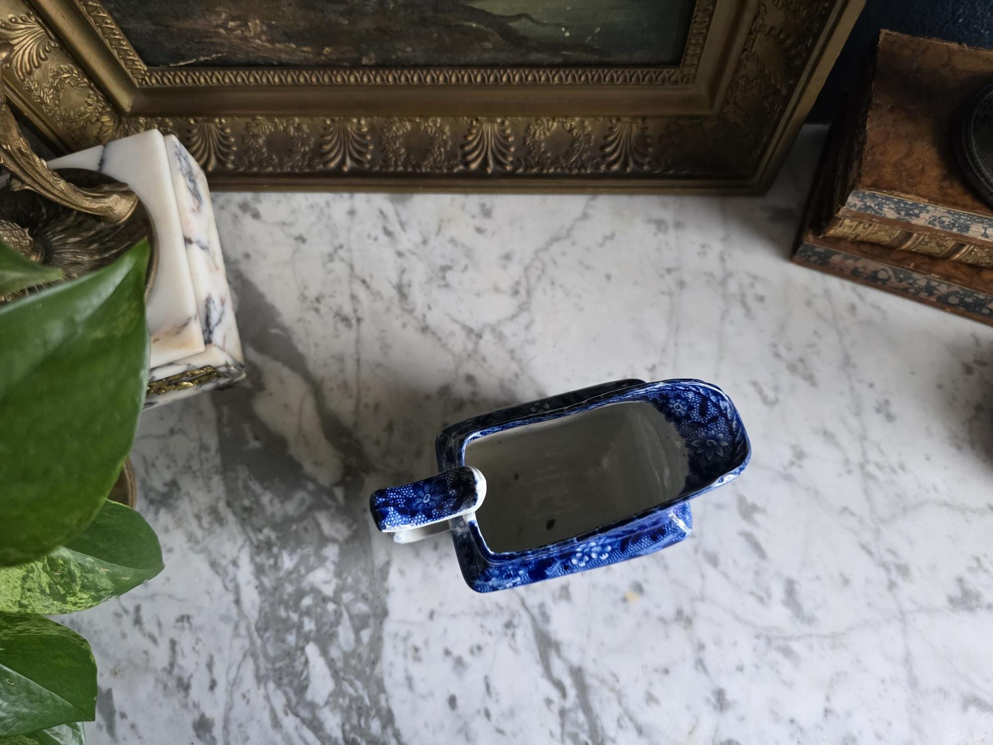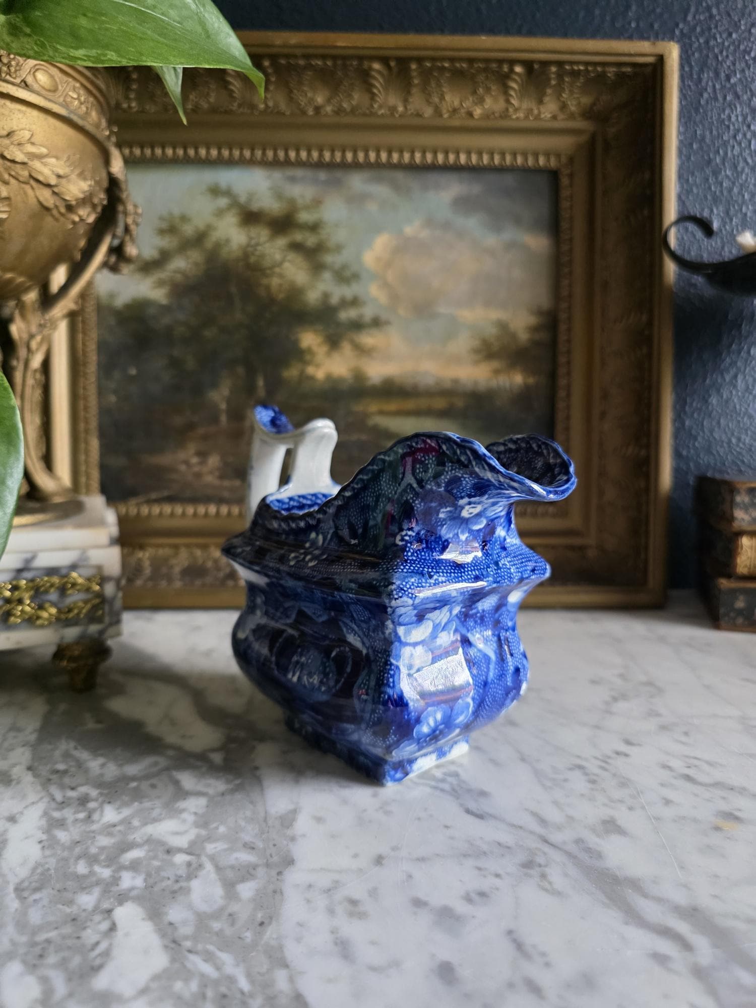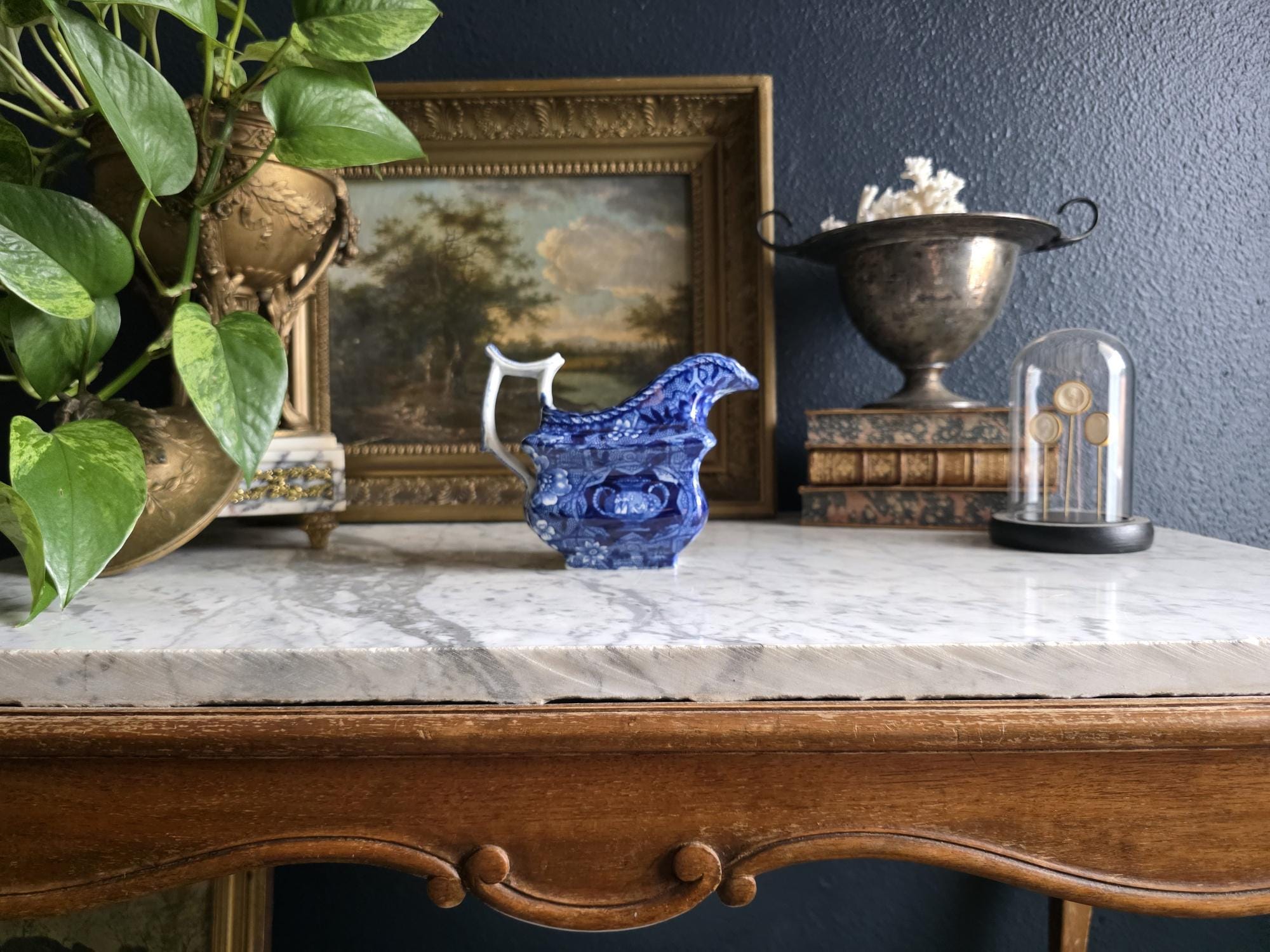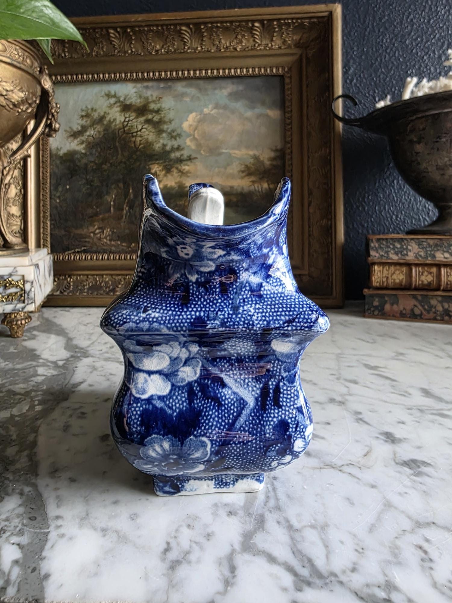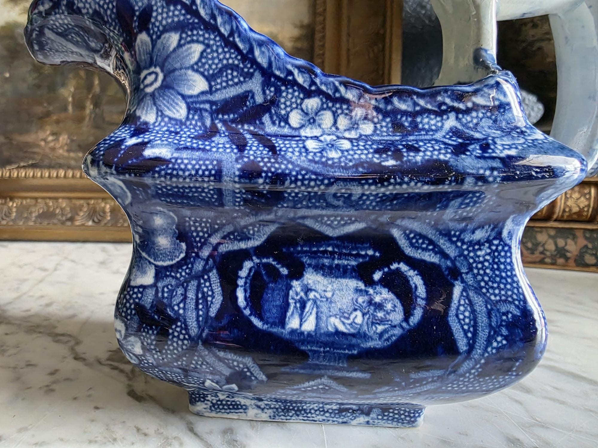 Presenting a stunning piece of early 19th-century English ceramics, this circa 1830 Staffordshire creamer pitcher showcases the deep, mesmerizing ink-blue hues characteristic of early Flow Blue cobalt transferware. The pitcher features an elegant, exaggerated sweeping spout and a highly articulated handle complete with a pronounced thumb rest, capturing the striking, dramatic silhouettes of the late Georgian to early Victorian eras. Its intricate transfer-printed pattern is a visual feast, boasting a dense, lace-like floral background that perfectly frames a classical romantic cartouche. The intense color pooling and slight, characteristic blurring of the glaze create a striking atmospheric presence, making it an exceptional styling piece. Bearing a small underglaze blue mark on the base, the piece exhibits beautiful, heavy crazing throughout the thick glaze, serving as a testament to its nearly two centuries of age. It remains in wonderful antique condition, with the interior showing expected signs of historical use and minor, age-appropriate wear along the extremities that only enhances its authentic, time-worn character. This creamer is in beautiful antique condition with no chips, cracks, breaks, or noticeable staining.