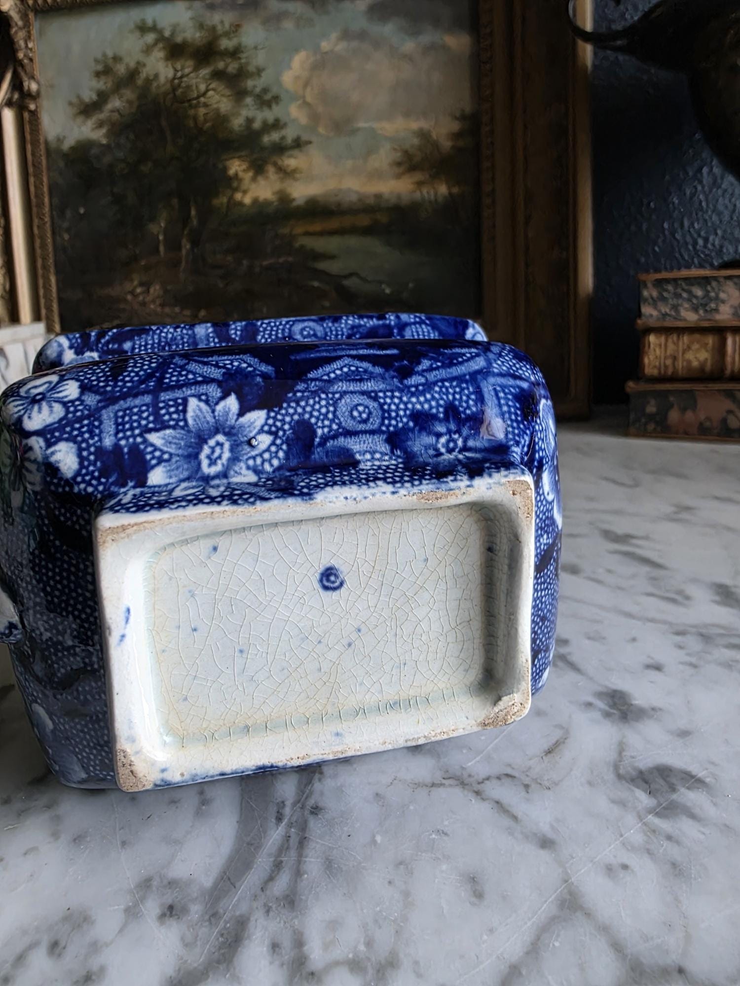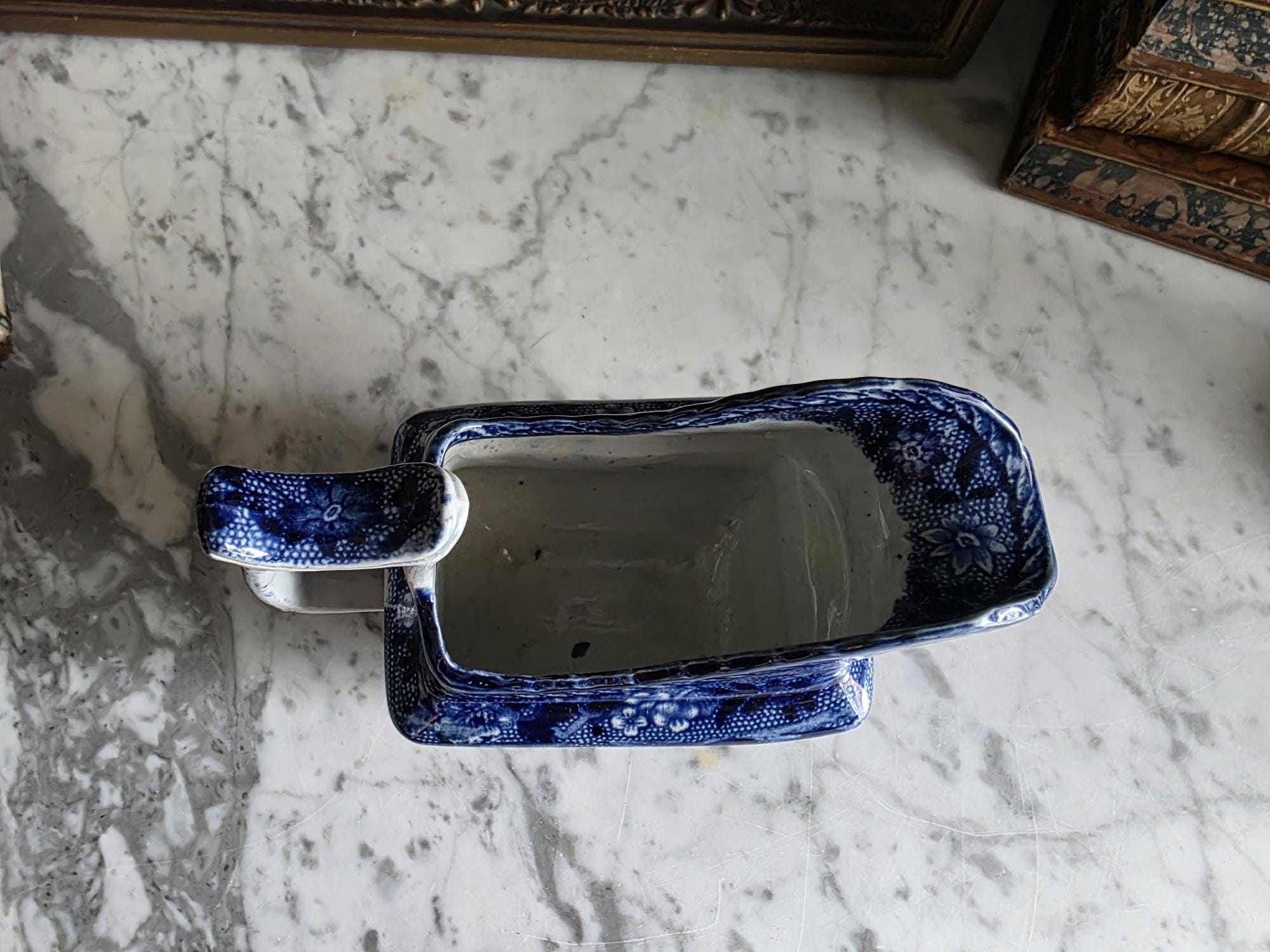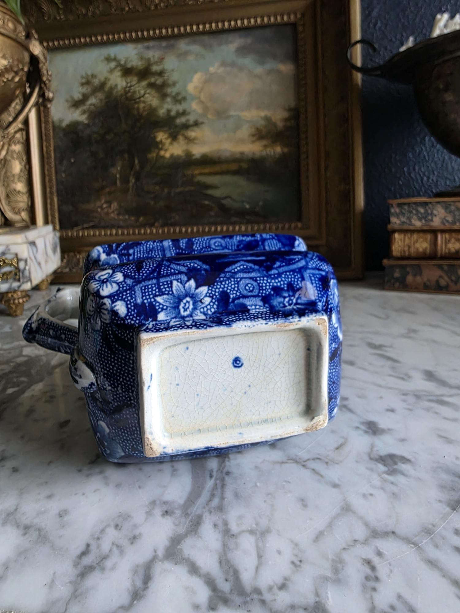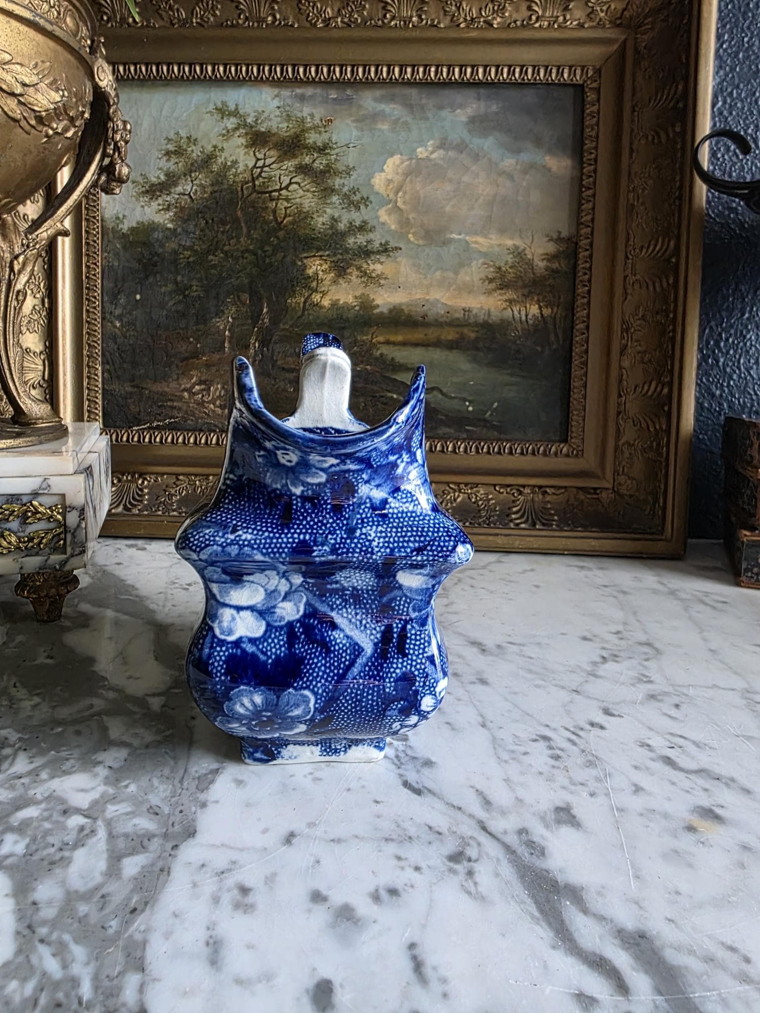 Presenting a stunning piece of early 19th-century English ceramics, this circa 1830 Staffordshire creamer pitcher showcases the deep, mesmerizing ink-blue hues characteristic of early Flow Blue cobalt transferware. The pitcher features an elegant, exaggerated sweeping spout and a highly articulated handle complete with a pronounced thumb rest, capturing the striking, dramatic silhouettes of the late Georgian to early Victorian eras. Its intricate transfer-printed pattern is a visual feast, boasting a dense, lace-like floral background that perfectly frames a classical romantic cartouche. The intense color pooling and slight, characteristic blurring of the glaze create a striking atmospheric presence, making it an exceptional styling piece. Bearing a small underglaze blue mark on the base, the piece exhibits beautiful, heavy crazing throughout the thick glaze, serving as a testament to its nearly two centuries of age. It remains in wonderful antique condition, with the interior showing expected signs of historical use and minor, age-appropriate wear along the extremities that only enhances its authentic, time-worn character. This creamer is in beautiful antique condition with no chips, cracks, breaks, or noticeable staining.