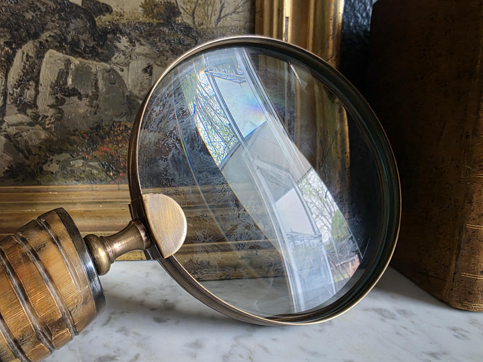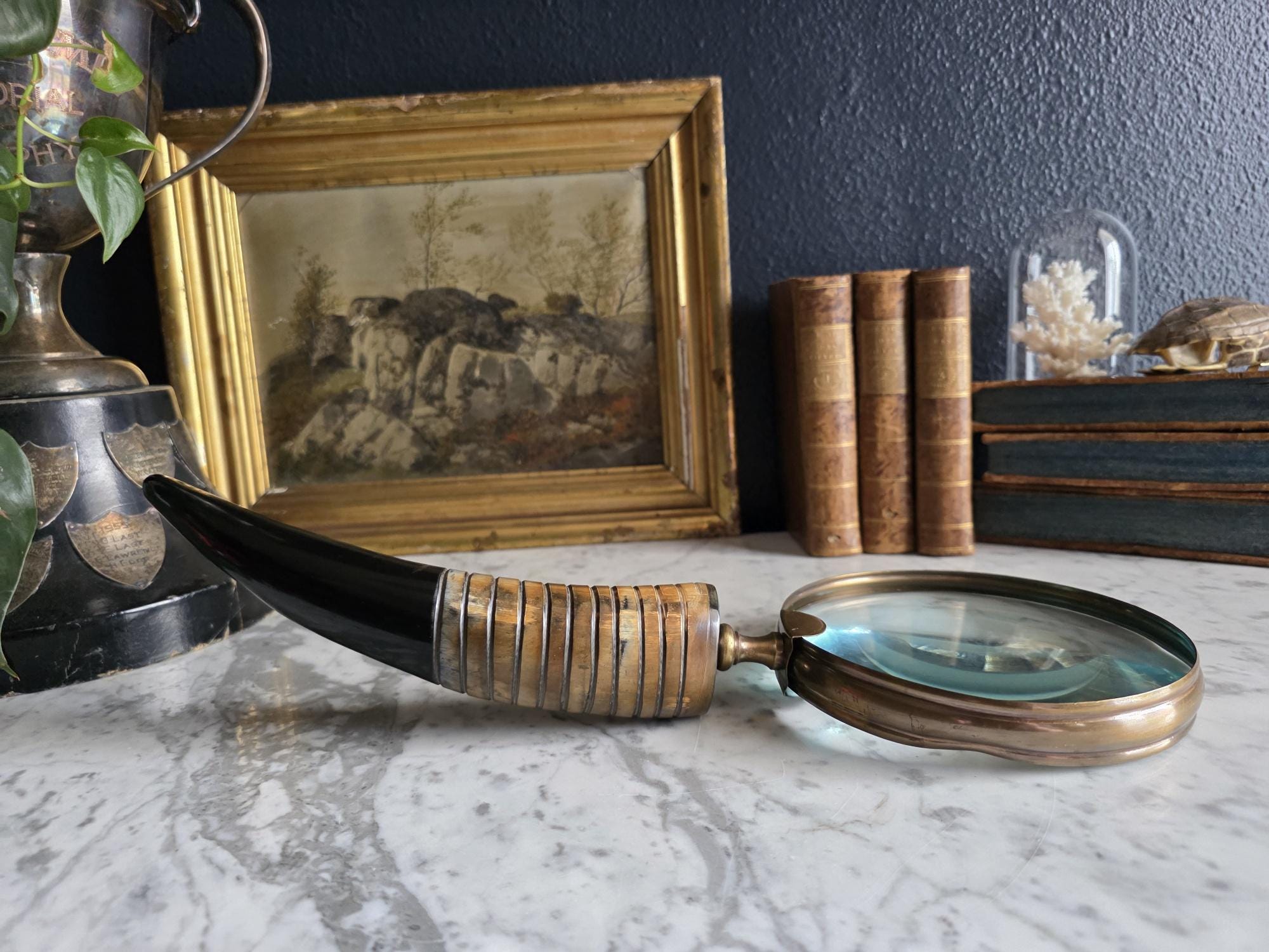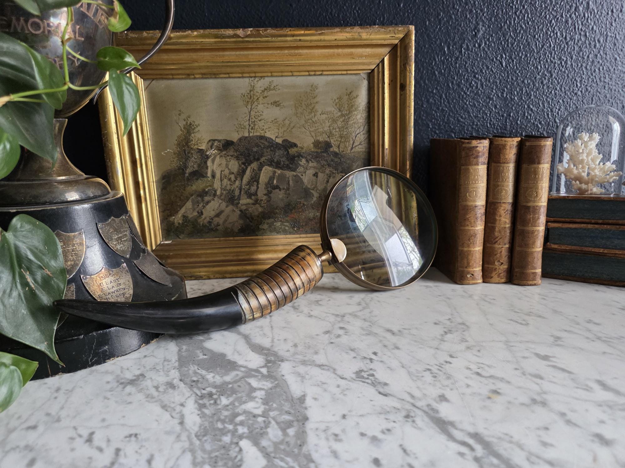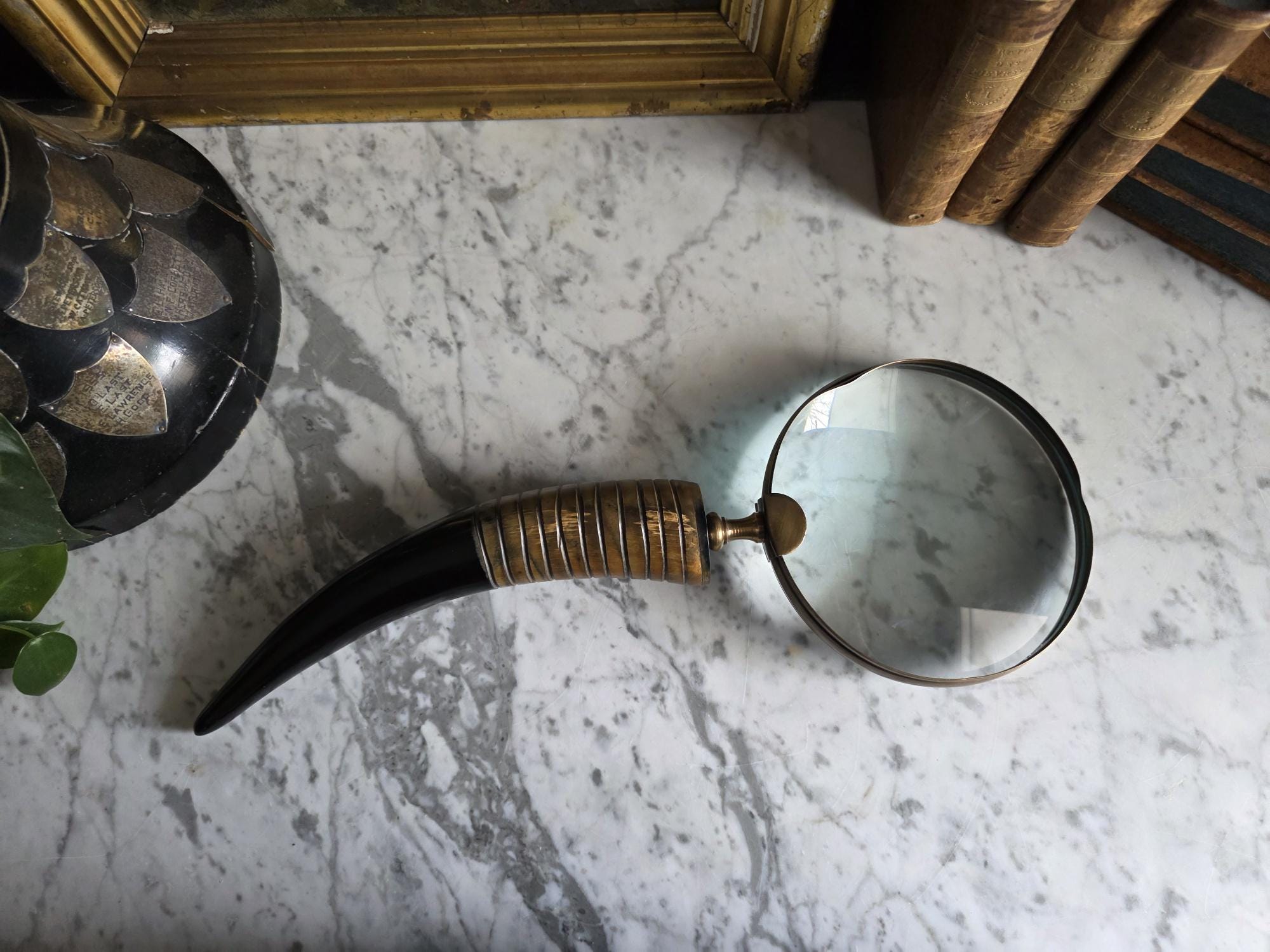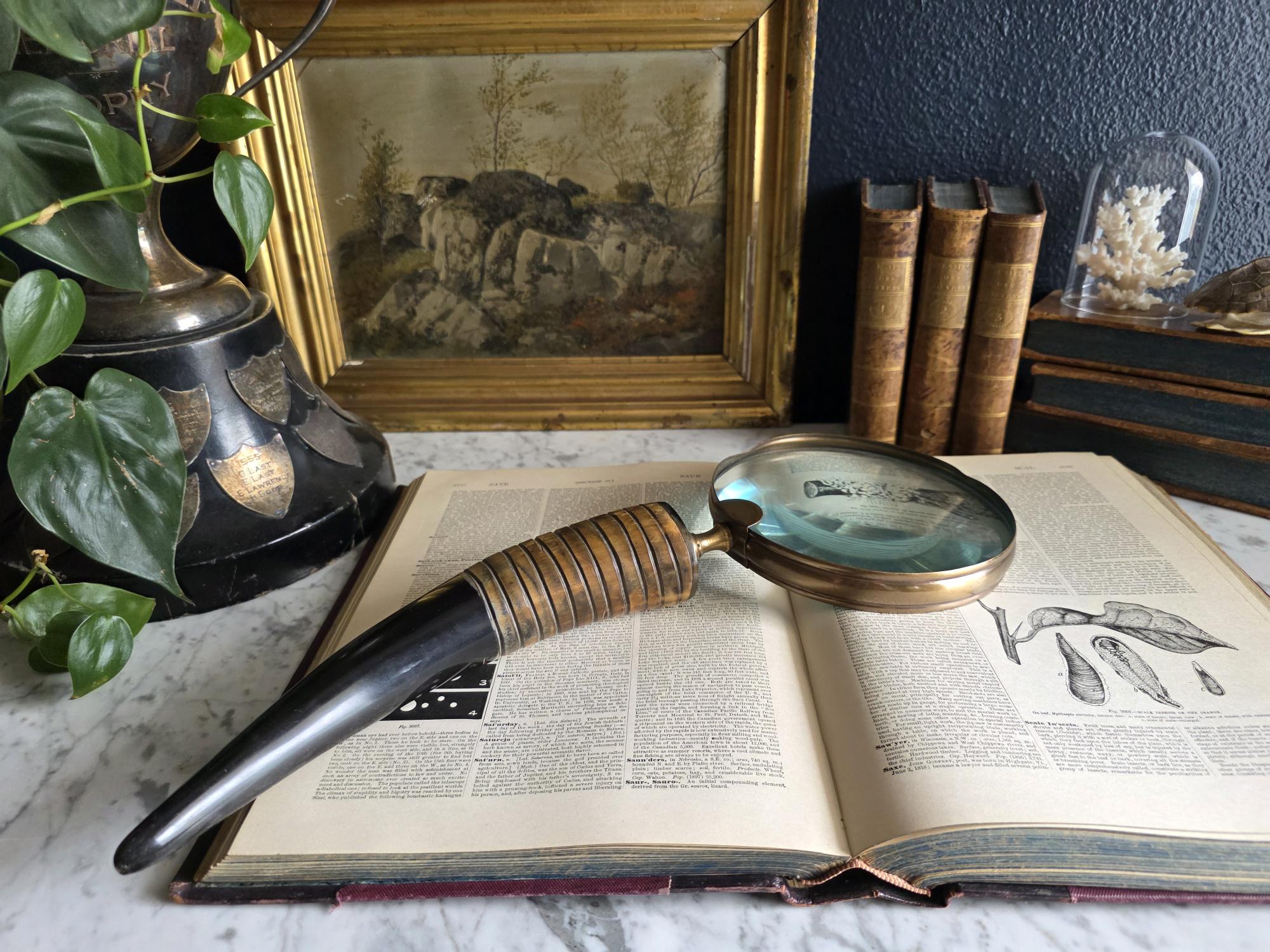 Channel the atmosphere of a dimly lit, scholarly study with this oversized vintage magnifying glass. A quintessential piece for any dark academia or moody vintage aesthetic, this substantial desk accessory features a striking faux horn and resin handle with deeply grooved, banded detailing that mimics the look of turned wood and natural materials. The oversized glass magnifies beautifully, making it perfect for poring over antique texts, examining botanical prints, or simply serving as a weighty, textural focal point resting atop a stack of leather-bound books. Please note that this piece wears its history with pride, exhibiting two distinct bends or dents in the bronze-toned framing on one side (please review the photos carefully). These honest imperfections only add to its storied, timeworn character, making it a perfectly imperfect addition to a curated library or explorer's desk.