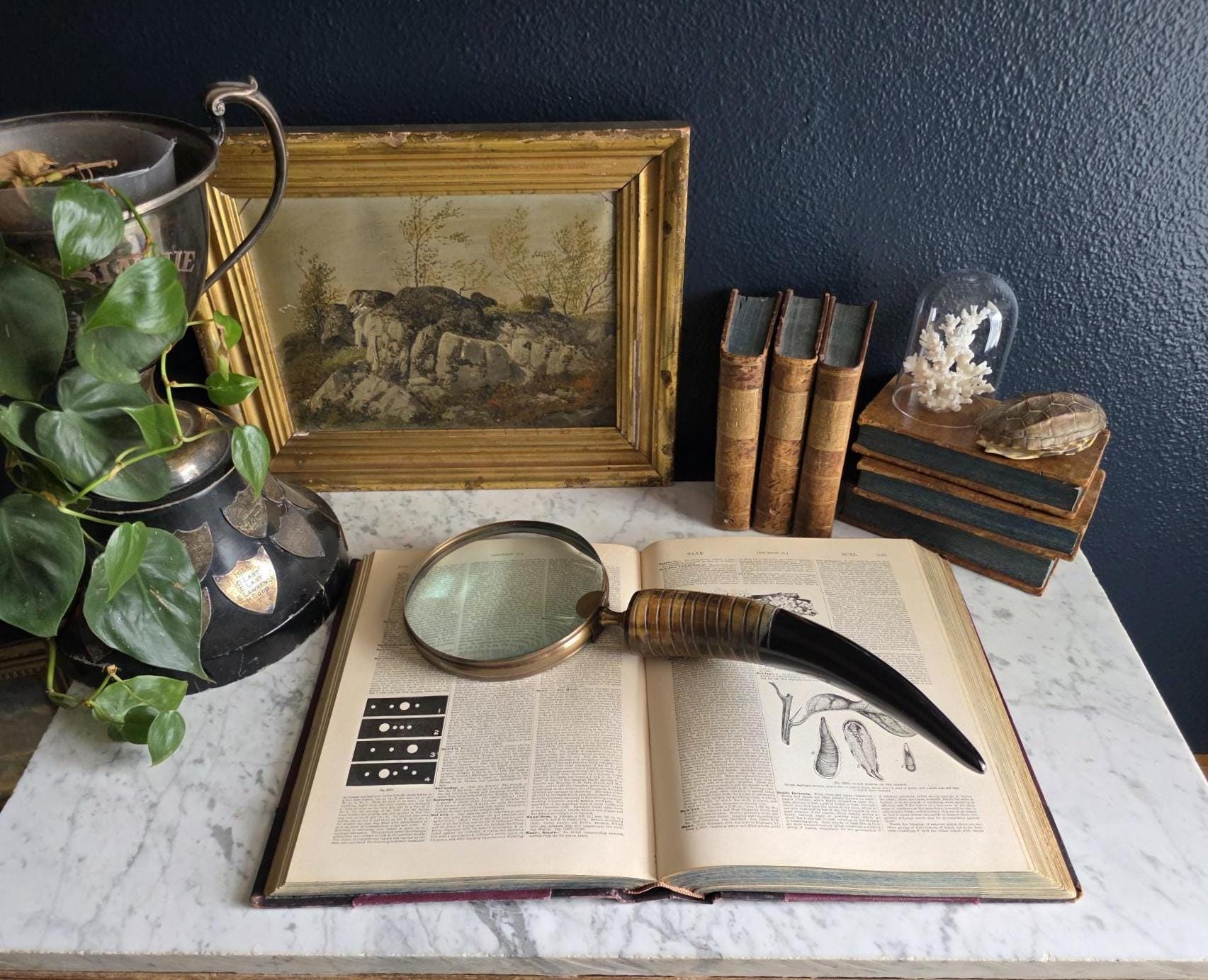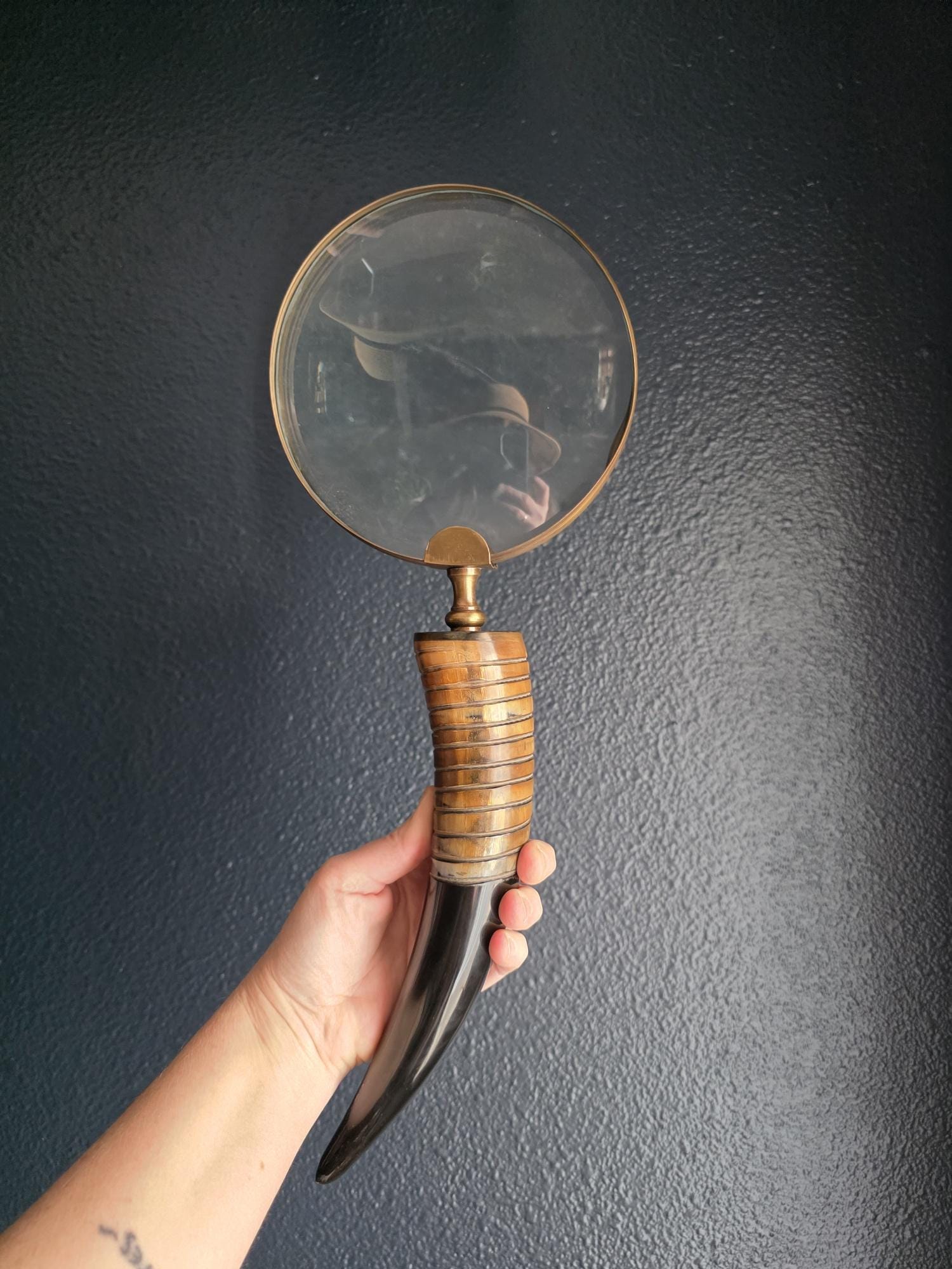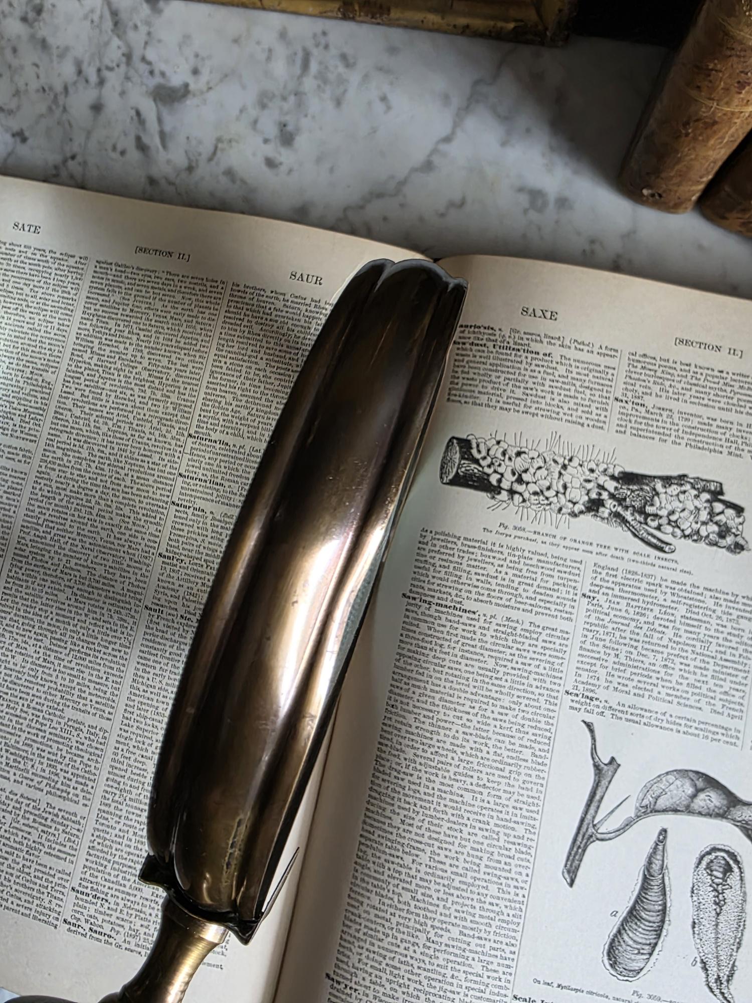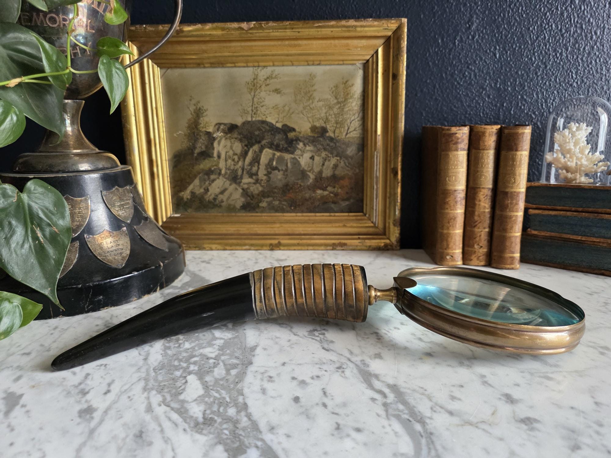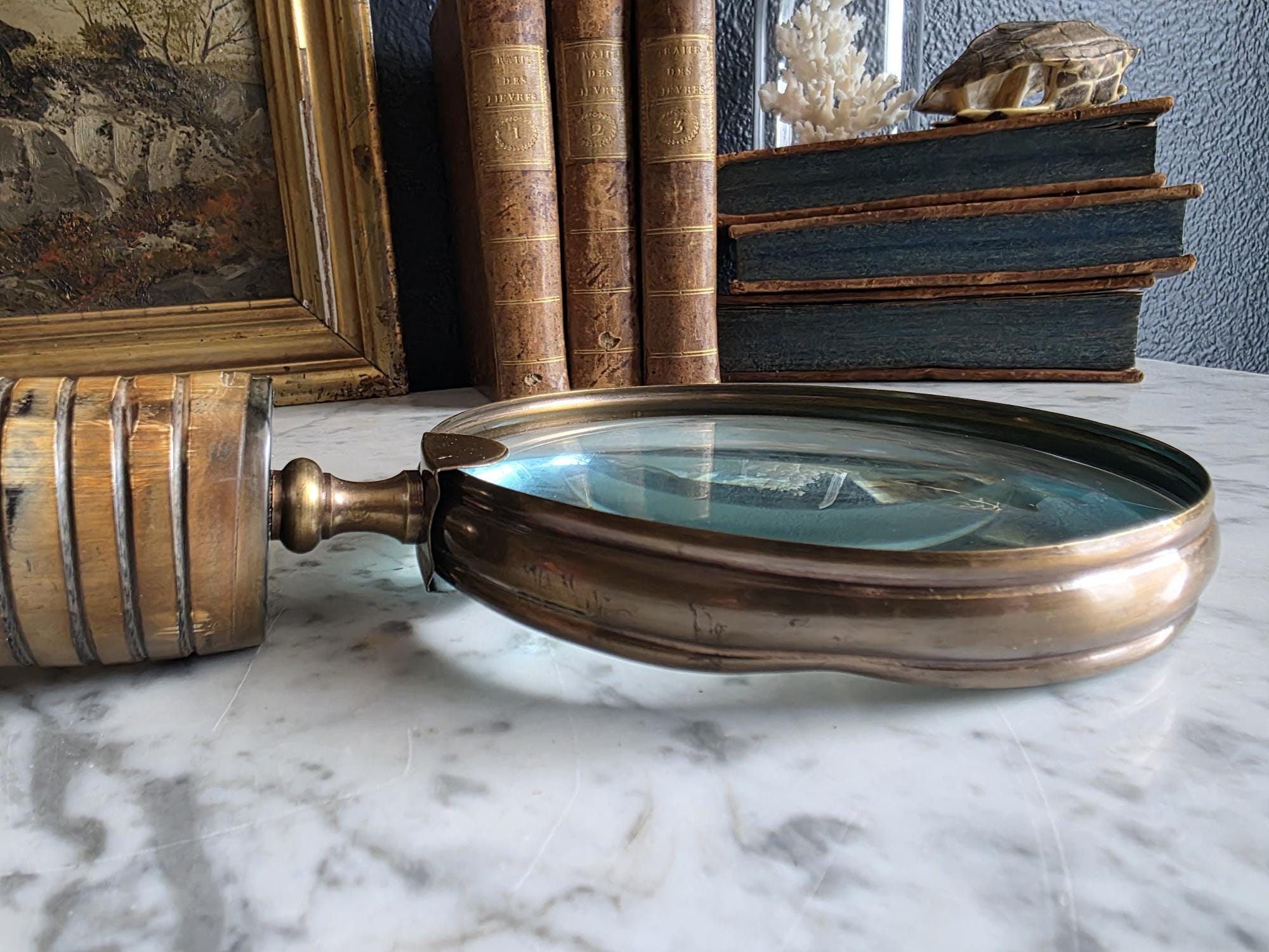 Channel the atmosphere of a dimly lit, scholarly study with this oversized vintage magnifying glass. A quintessential piece for any dark academia or moody vintage aesthetic, this substantial desk accessory features a striking faux horn and resin handle with deeply grooved, banded detailing that mimics the look of turned wood and natural materials. The oversized glass magnifies beautifully, making it perfect for poring over antique texts, examining botanical prints, or simply serving as a weighty, textural focal point resting atop a stack of leather-bound books. Please note that this piece wears its history with pride, exhibiting two distinct bends or dents in the bronze-toned framing on one side (please review the photos carefully). These honest imperfections only add to its storied, timeworn character, making it a perfectly imperfect addition to a curated library or explorer's desk.
