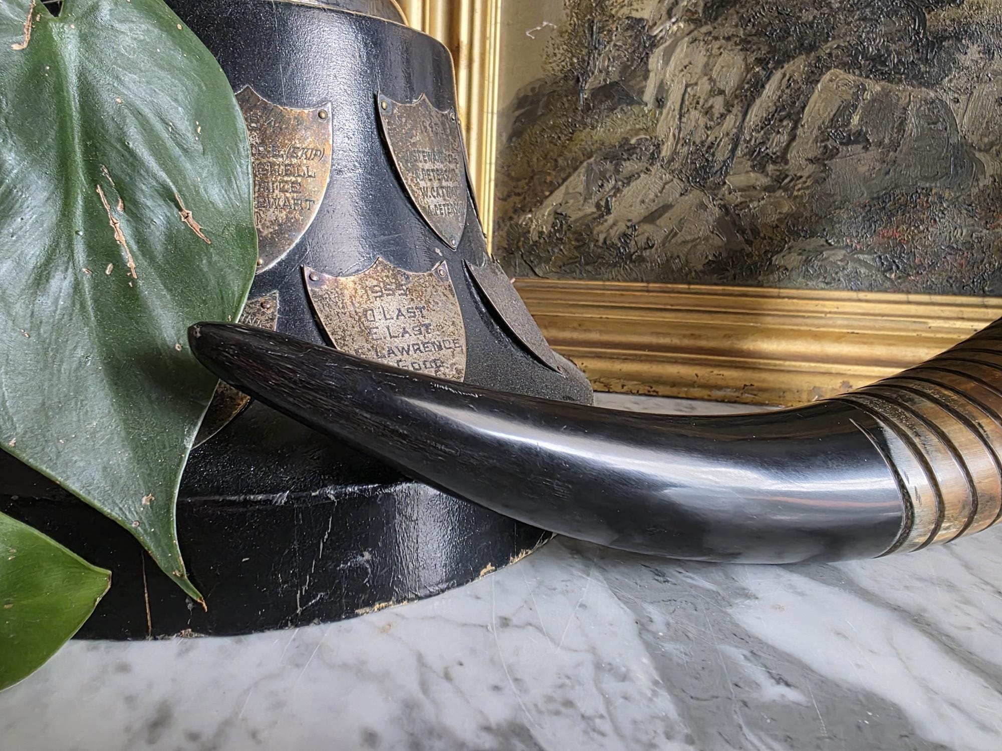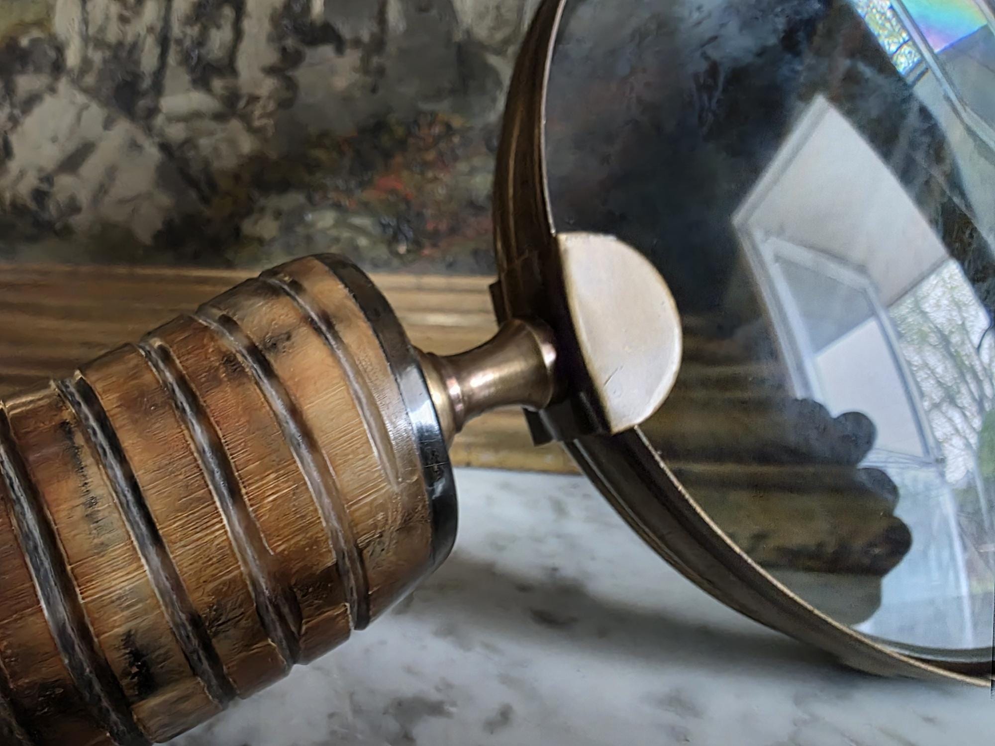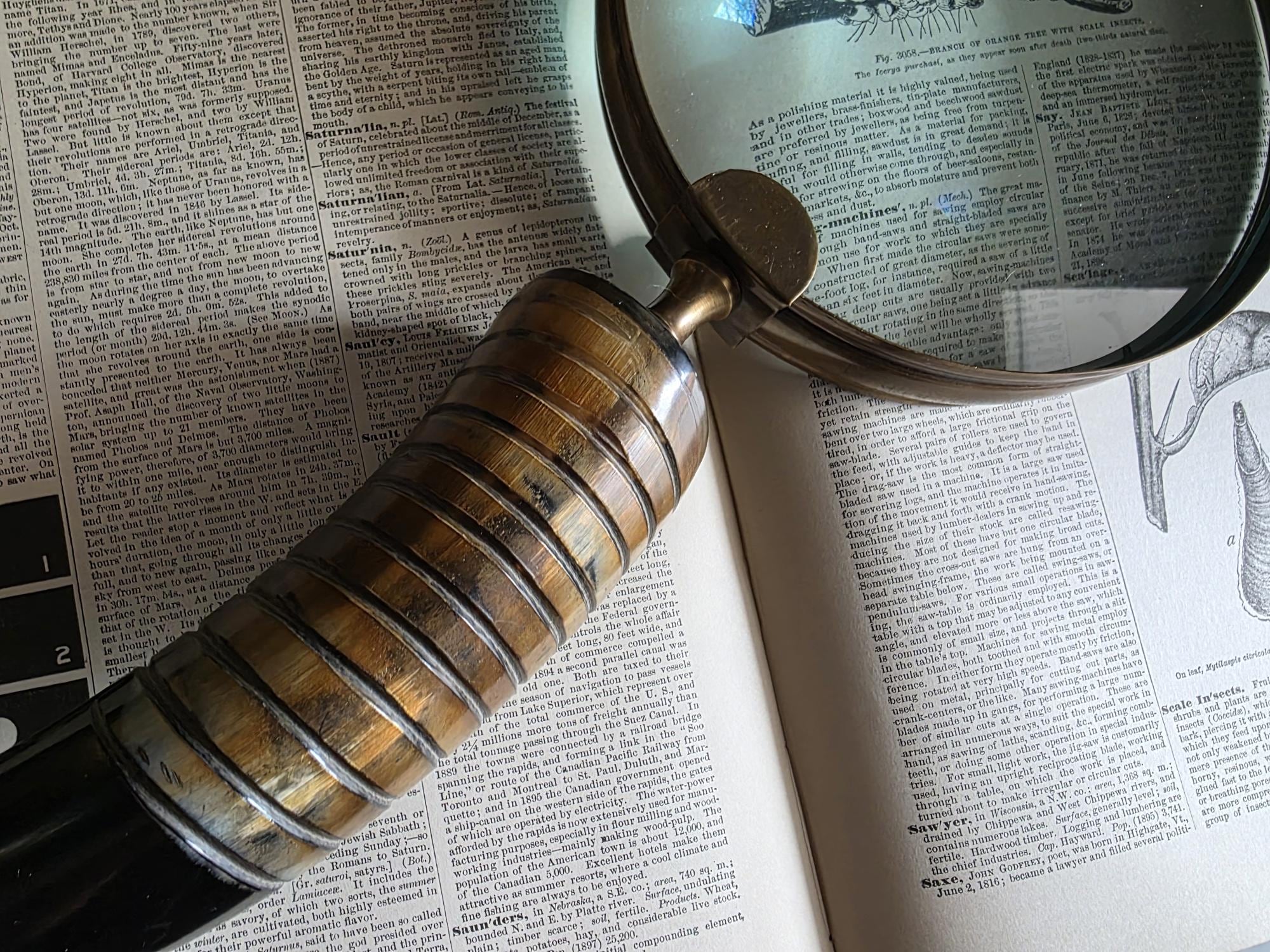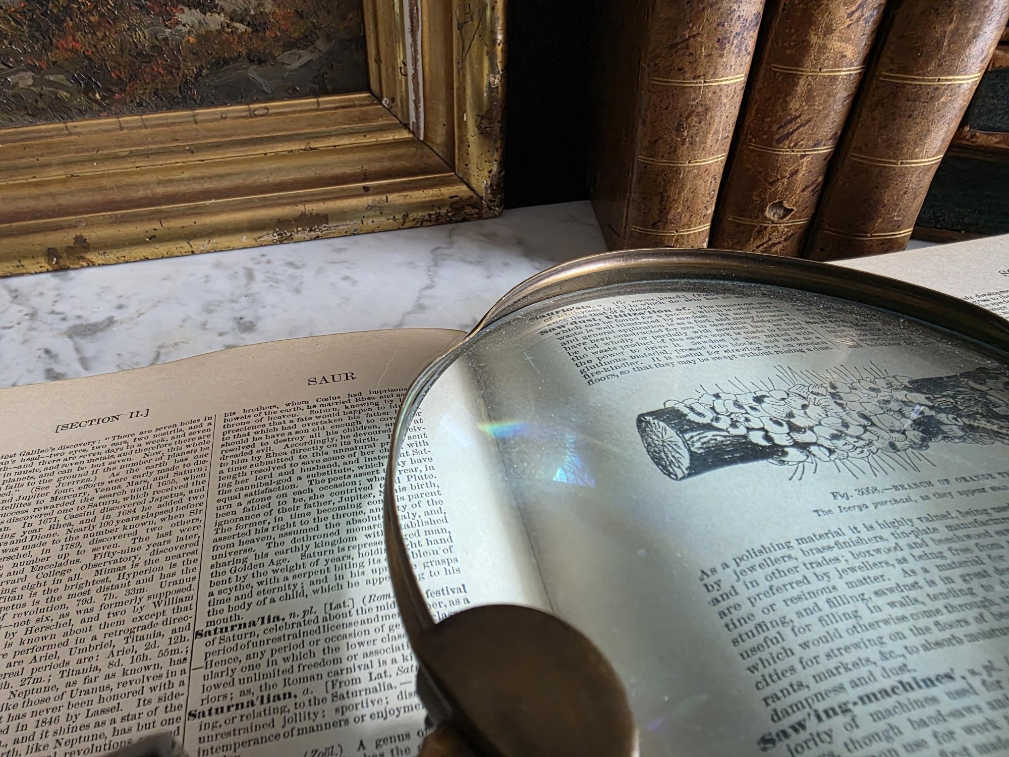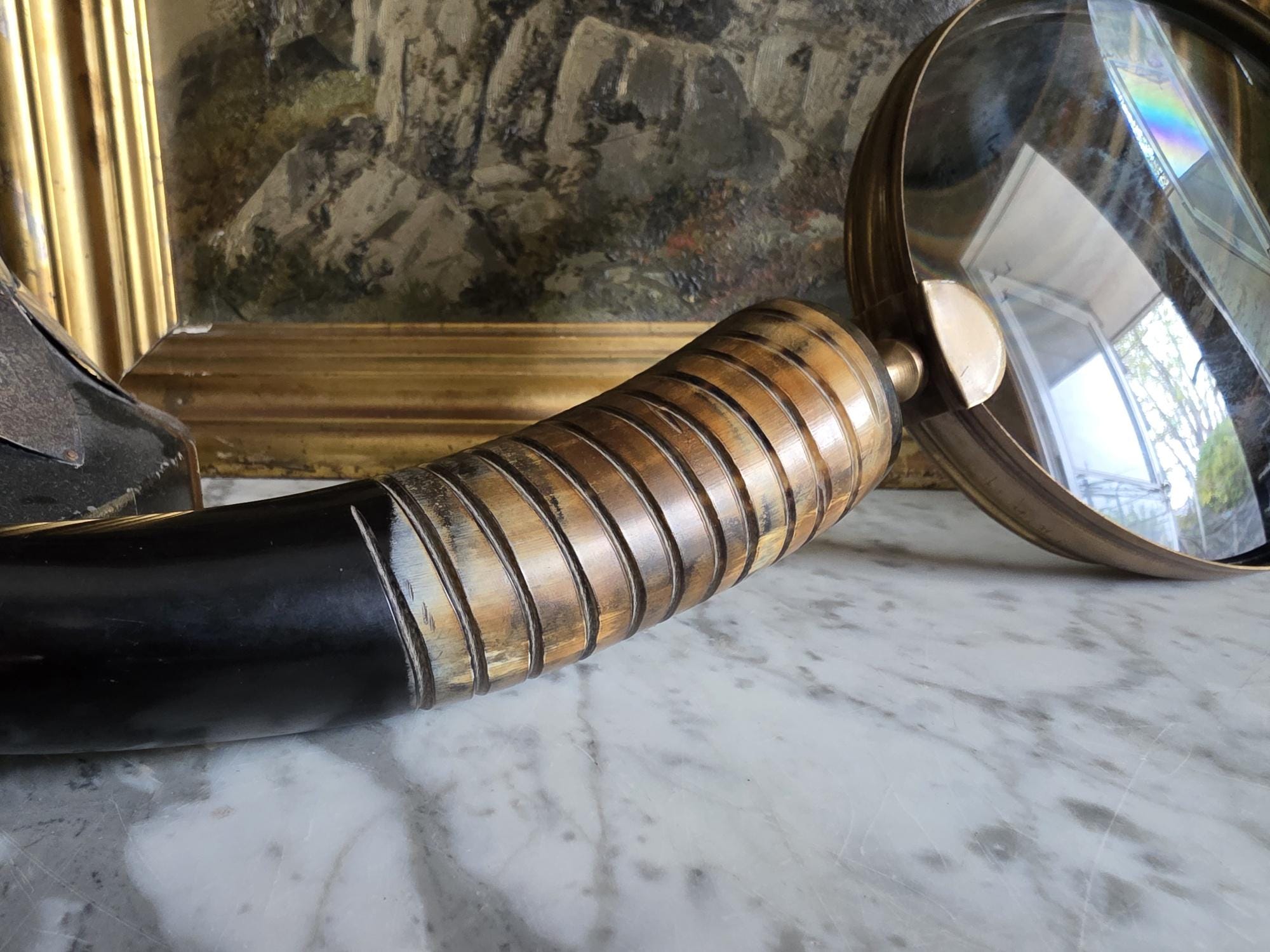 Channel the atmosphere of a dimly lit, scholarly study with this oversized vintage magnifying glass. A quintessential piece for any dark academia or moody vintage aesthetic, this substantial desk accessory features a striking faux horn and resin handle with deeply grooved, banded detailing that mimics the look of turned wood and natural materials. The oversized glass magnifies beautifully, making it perfect for poring over antique texts, examining botanical prints, or simply serving as a weighty, textural focal point resting atop a stack of leather-bound books. Please note that this piece wears its history with pride, exhibiting two distinct bends or dents in the bronze-toned framing on one side (please review the photos carefully). These honest imperfections only add to its storied, timeworn character, making it a perfectly imperfect addition to a curated library or explorer's desk.
