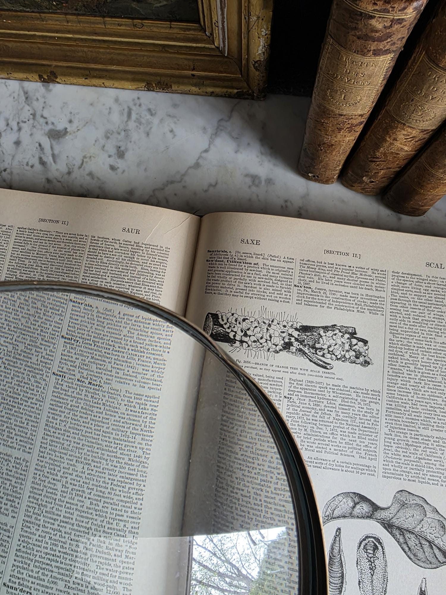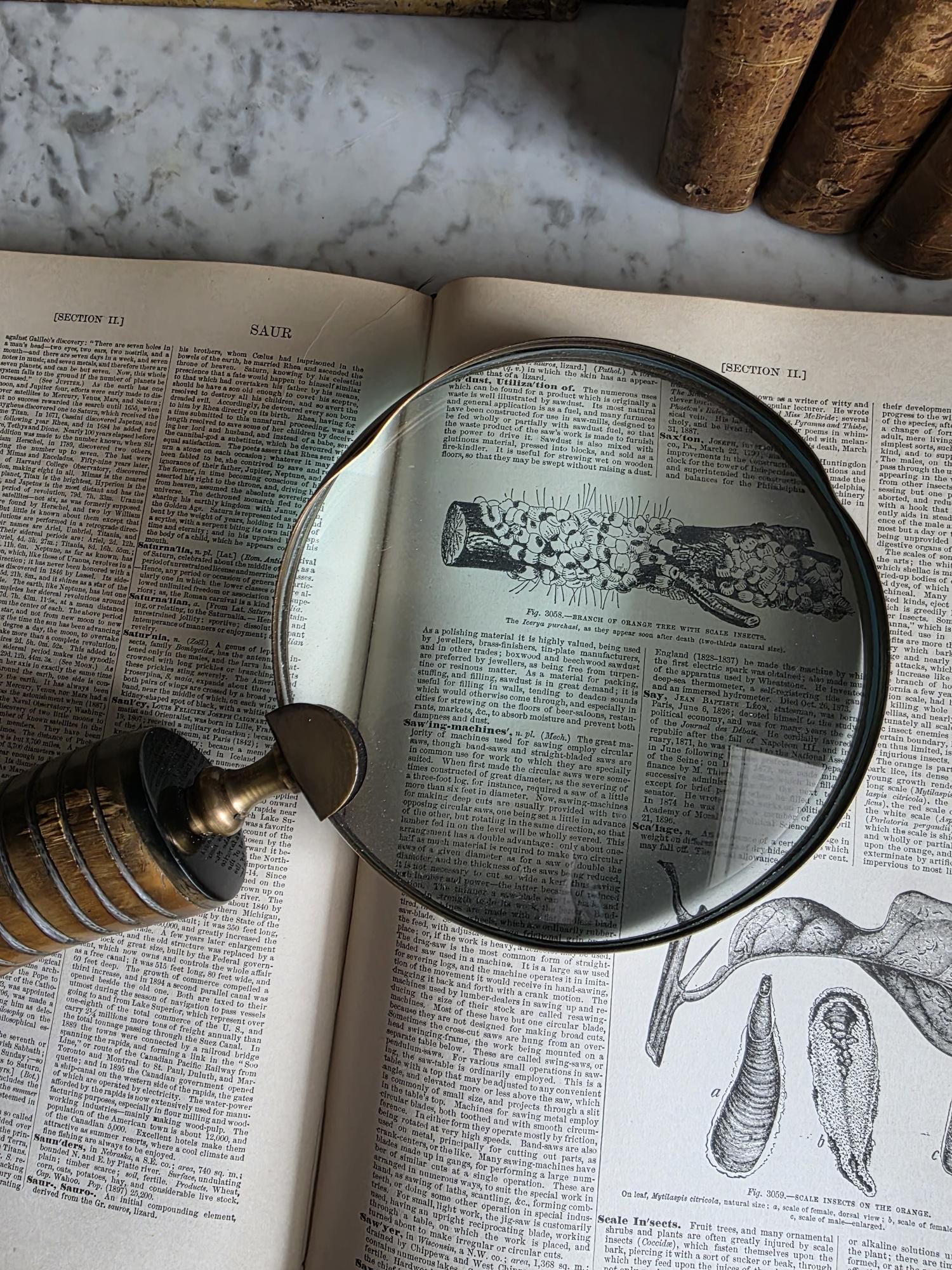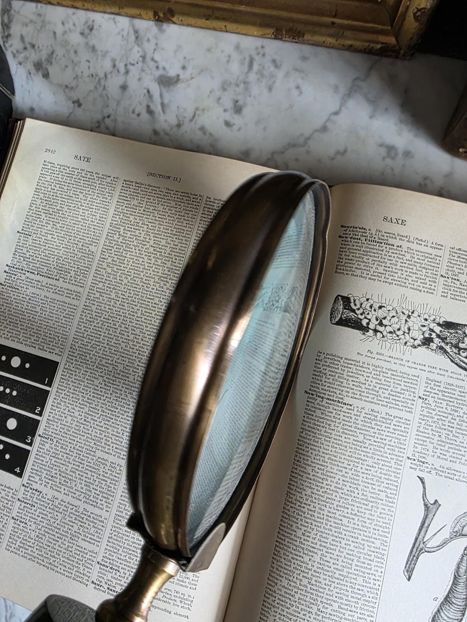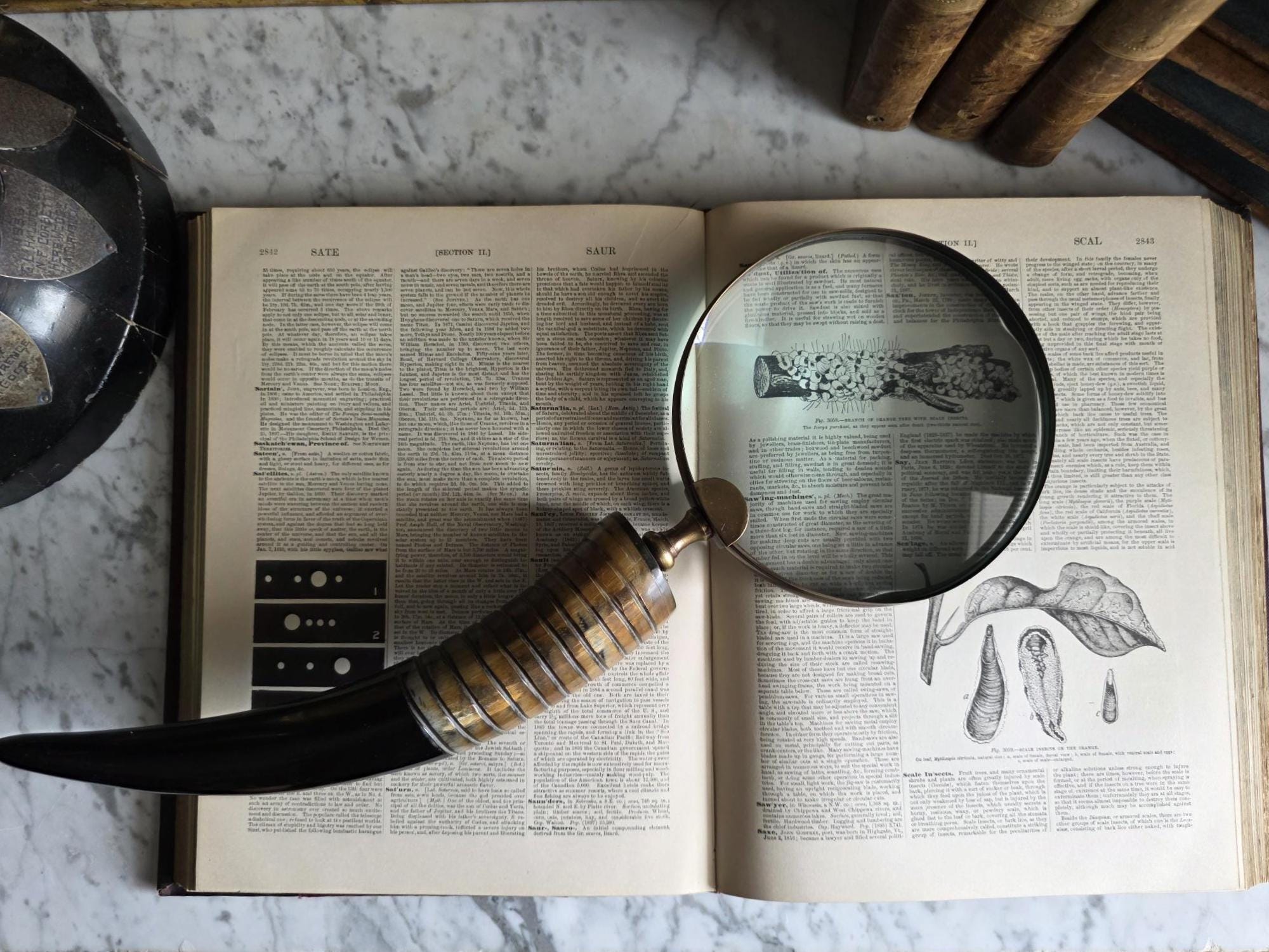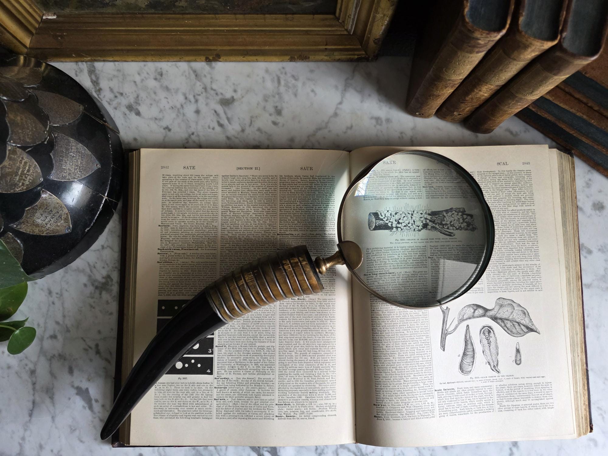 Channel the atmosphere of a dimly lit, scholarly study with this oversized vintage magnifying glass. A quintessential piece for any dark academia or moody vintage aesthetic, this substantial desk accessory features a striking faux horn and resin handle with deeply grooved, banded detailing that mimics the look of turned wood and natural materials. The oversized glass magnifies beautifully, making it perfect for poring over antique texts, examining botanical prints, or simply serving as a weighty, textural focal point resting atop a stack of leather-bound books. Please note that this piece wears its history with pride, exhibiting two distinct bends or dents in the bronze-toned framing on one side (please review the photos carefully). These honest imperfections only add to its storied, timeworn character, making it a perfectly imperfect addition to a curated library or explorer's desk.