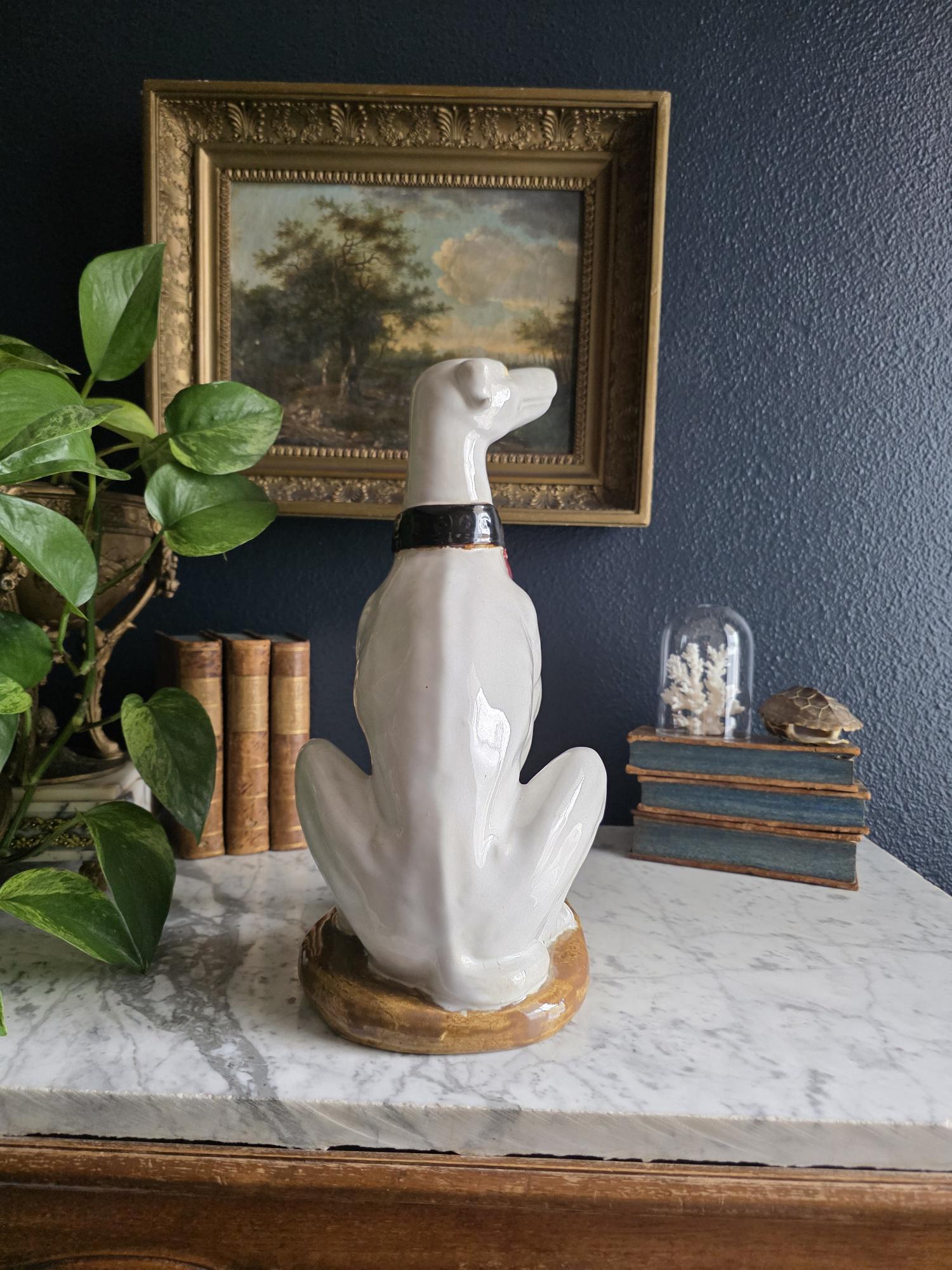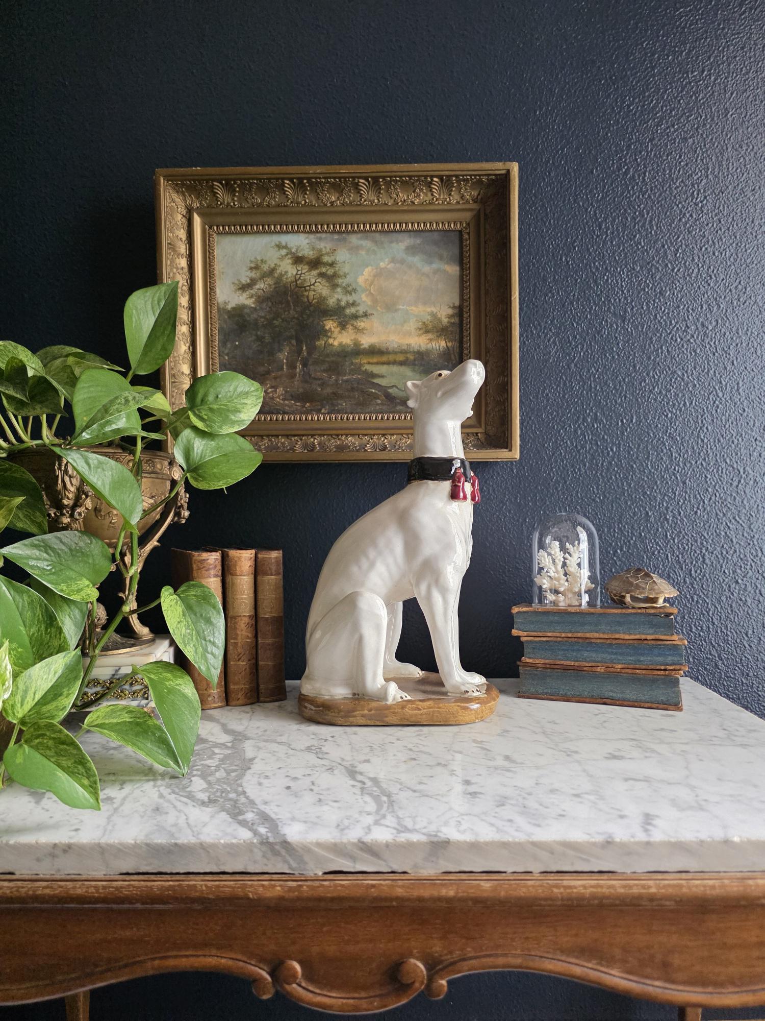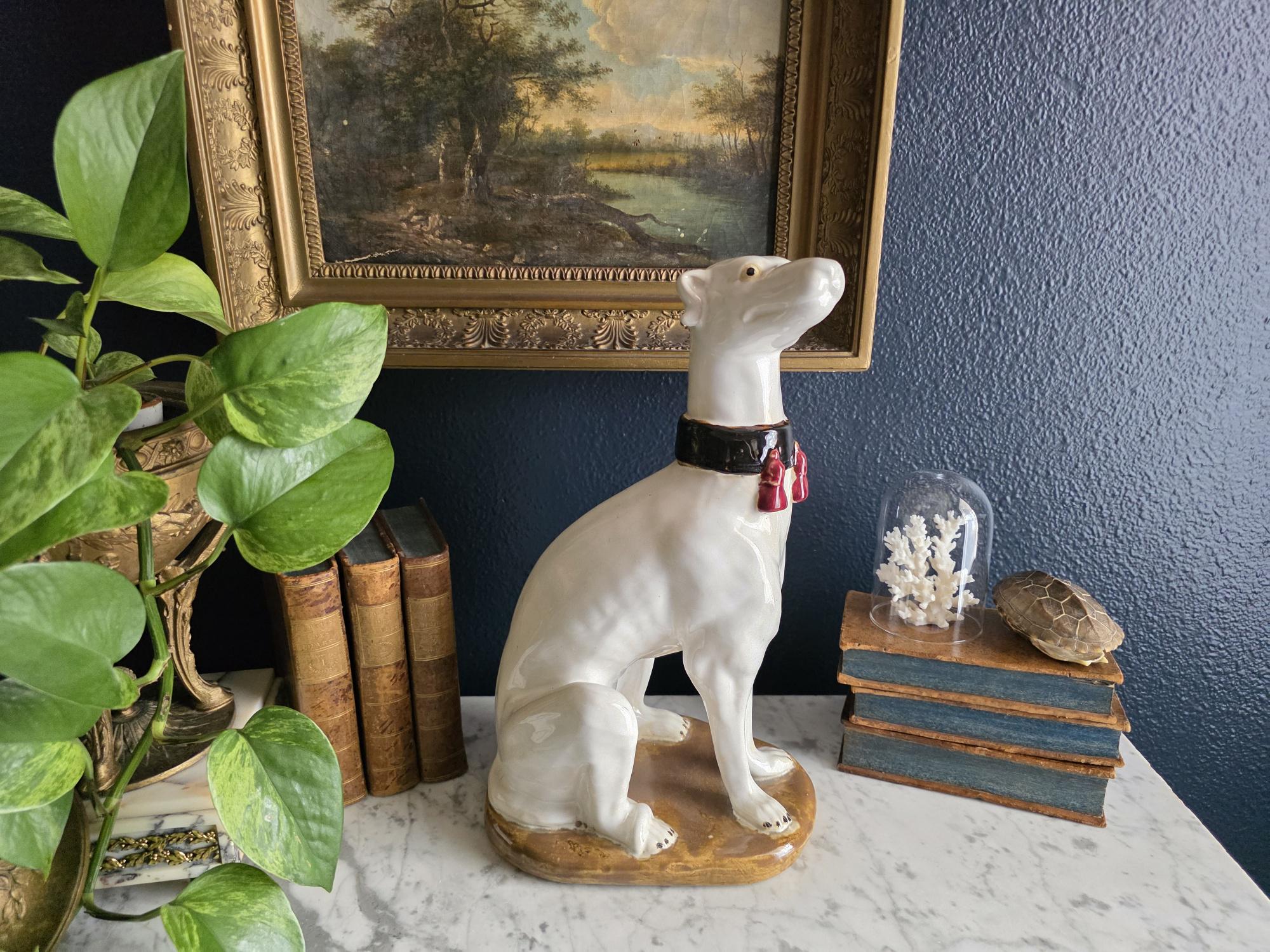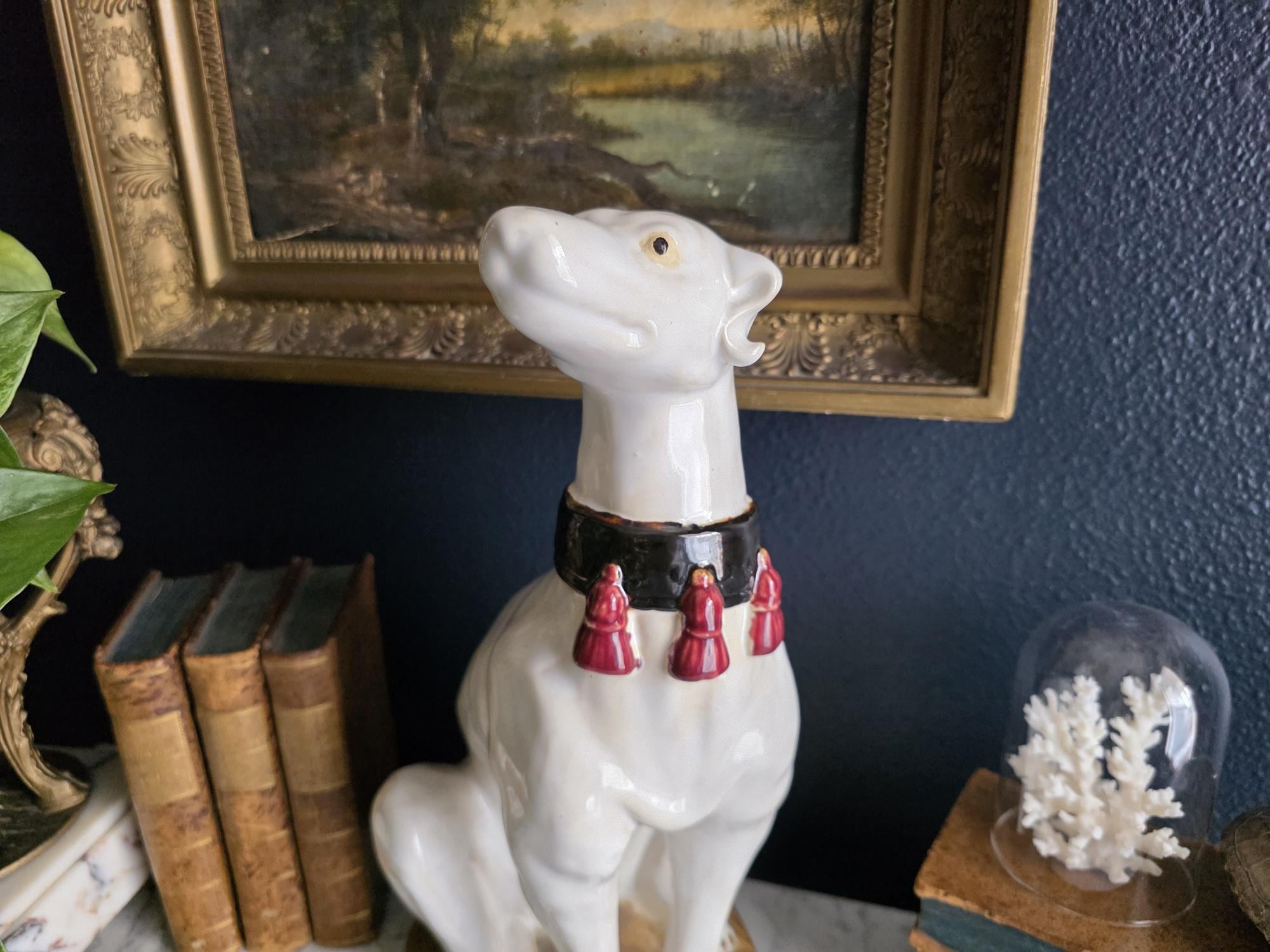 Capture the essence of mid-century Italian craftsmanship with this magnificent ceramic whippet statue, a hallmark of glamorous Hollywood Regency style. Exported from Italy during the 1950s or 1960s, this elegant hound is cast in a classic seated posture with an attentive gaze directed nobly upward. The glossy white glaze is beautifully contrasted by a bold black collar featuring three hand-painted maroon tassels—a signature flourish of vintage Italian pottery from this era. Authentic to its mid-century origins, the piece exhibits subtle, natural crazing throughout the glaze and gentle wear on the textured base, lending it a storied, authentic charm. Perfectly suited to anchor a dark or light academia library shelf or to add an opulent touch to a moody vintage vignette, this statuesque figurine makes a sophisticated statement in any curated interior. This ceramic statue bears natural crazing and wear consistent with vintage mid-century age, but bears no chips, cracks or breaks.