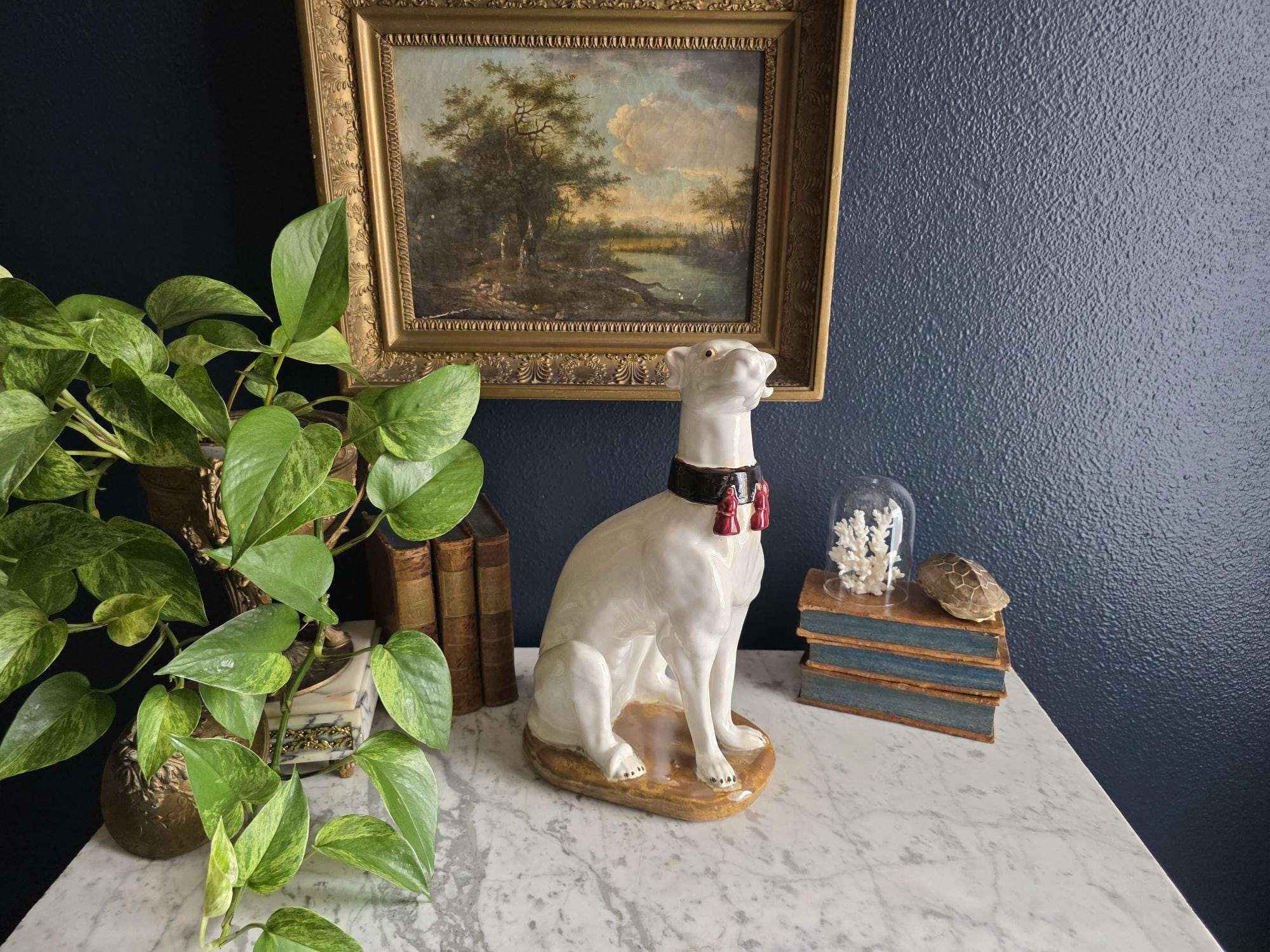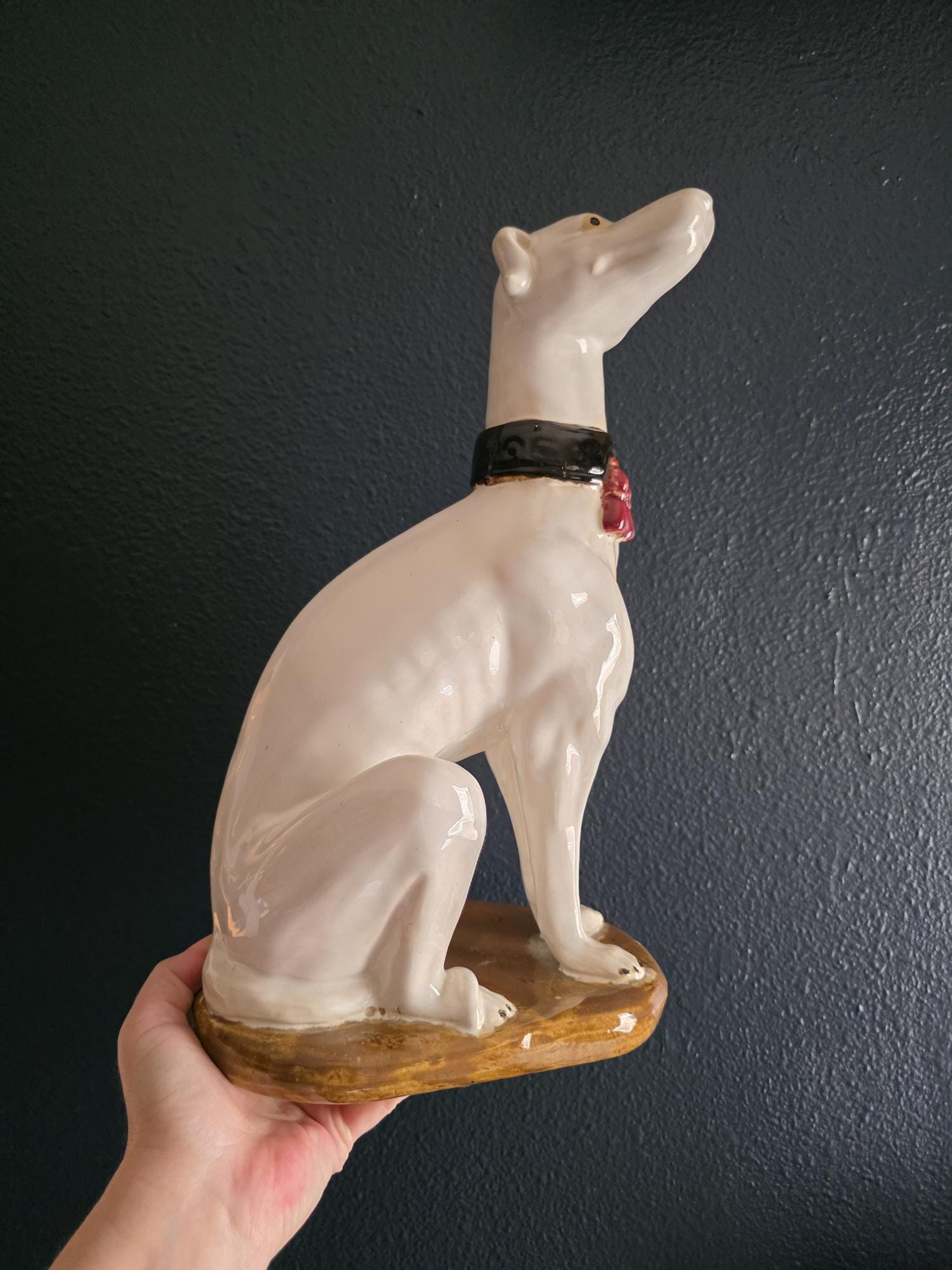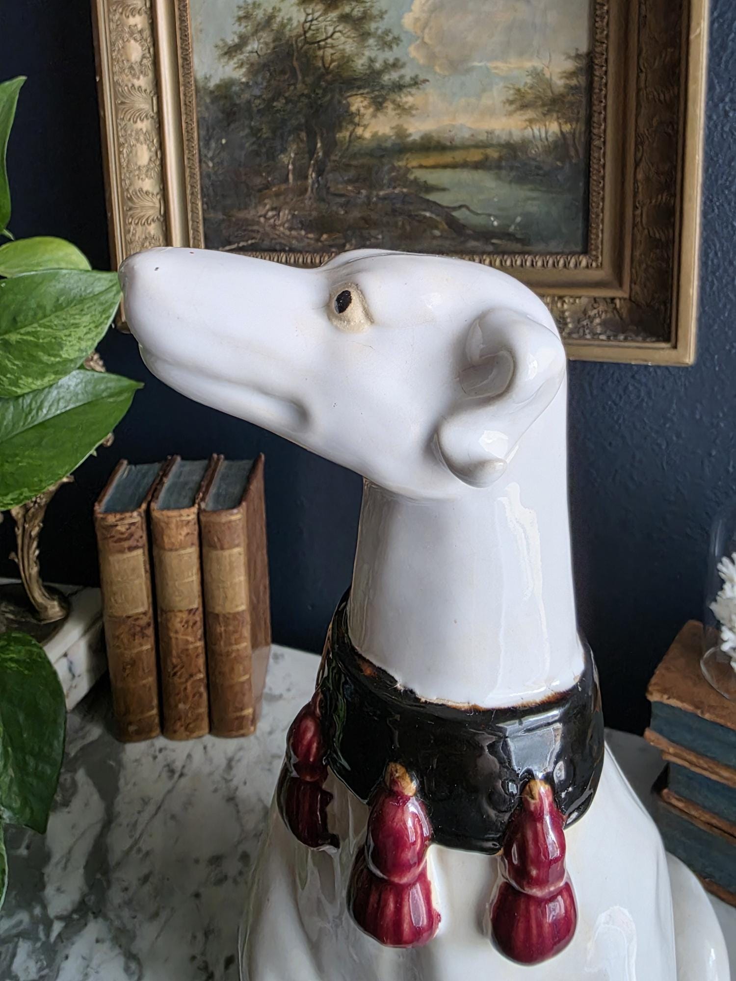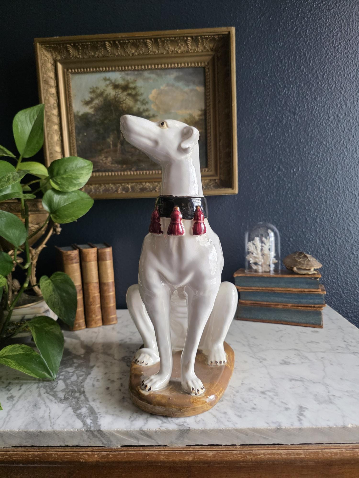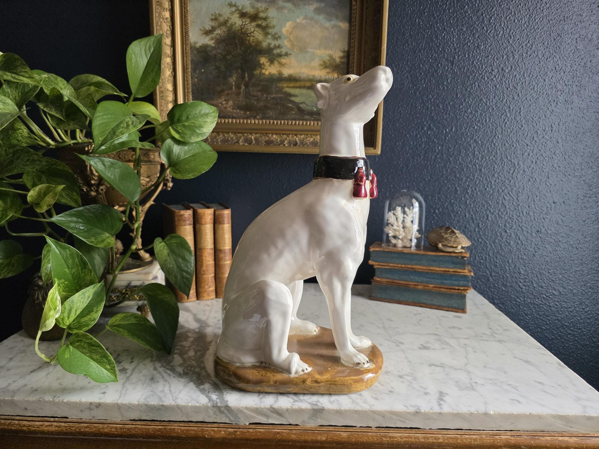 Capture the essence of mid-century Italian craftsmanship with this magnificent ceramic whippet statue, a hallmark of glamorous Hollywood Regency style. Exported from Italy during the 1950s or 1960s, this elegant hound is cast in a classic seated posture with an attentive gaze directed nobly upward. The glossy white glaze is beautifully contrasted by a bold black collar featuring three hand-painted maroon tassels—a signature flourish of vintage Italian pottery from this era. Authentic to its mid-century origins, the piece exhibits subtle, natural crazing throughout the glaze and gentle wear on the textured base, lending it a storied, authentic charm. Perfectly suited to anchor a dark or light academia library shelf or to add an opulent touch to a moody vintage vignette, this statuesque figurine makes a sophisticated statement in any curated interior. This ceramic statue bears natural crazing and wear consistent with vintage mid-century age, but bears no chips, cracks or breaks.