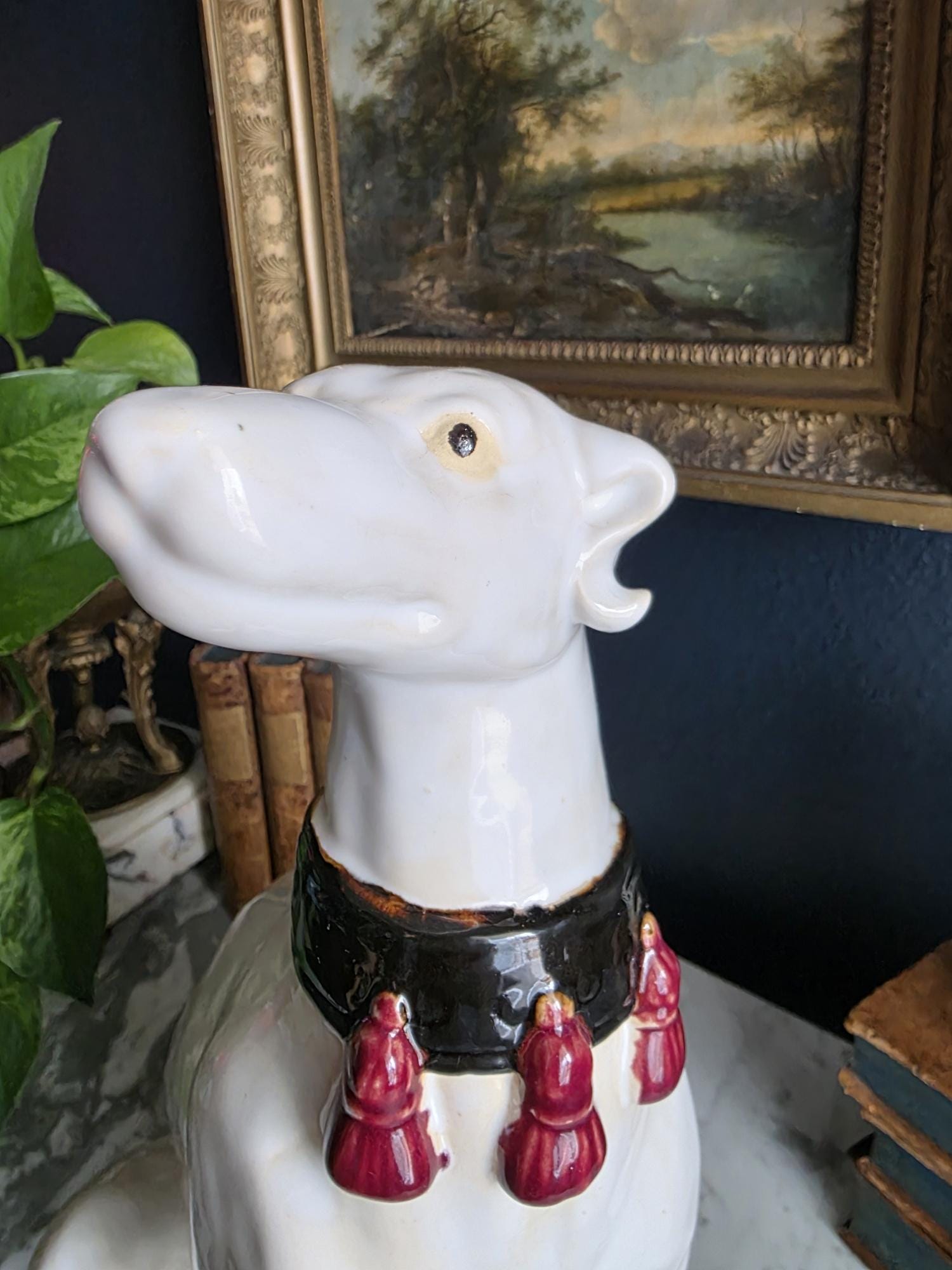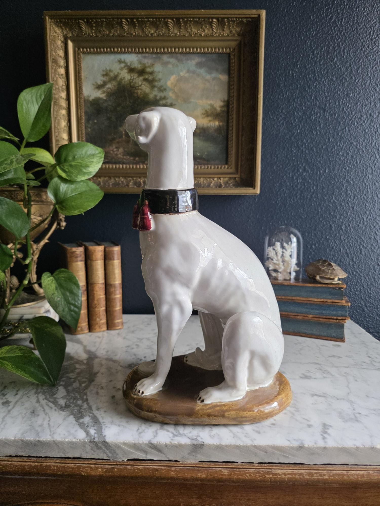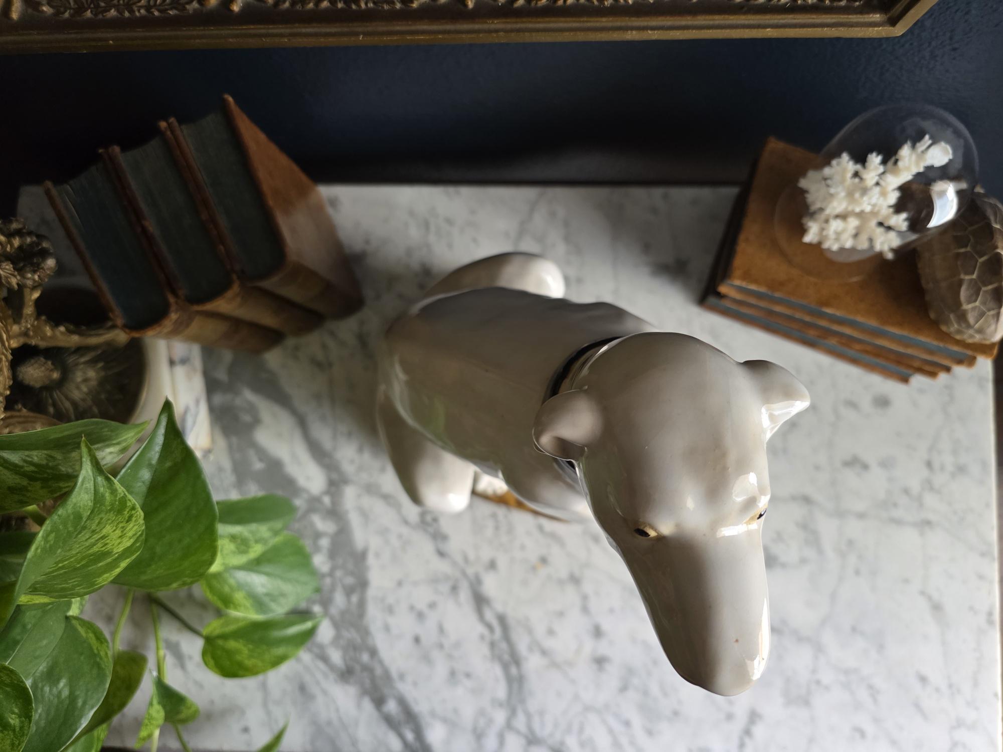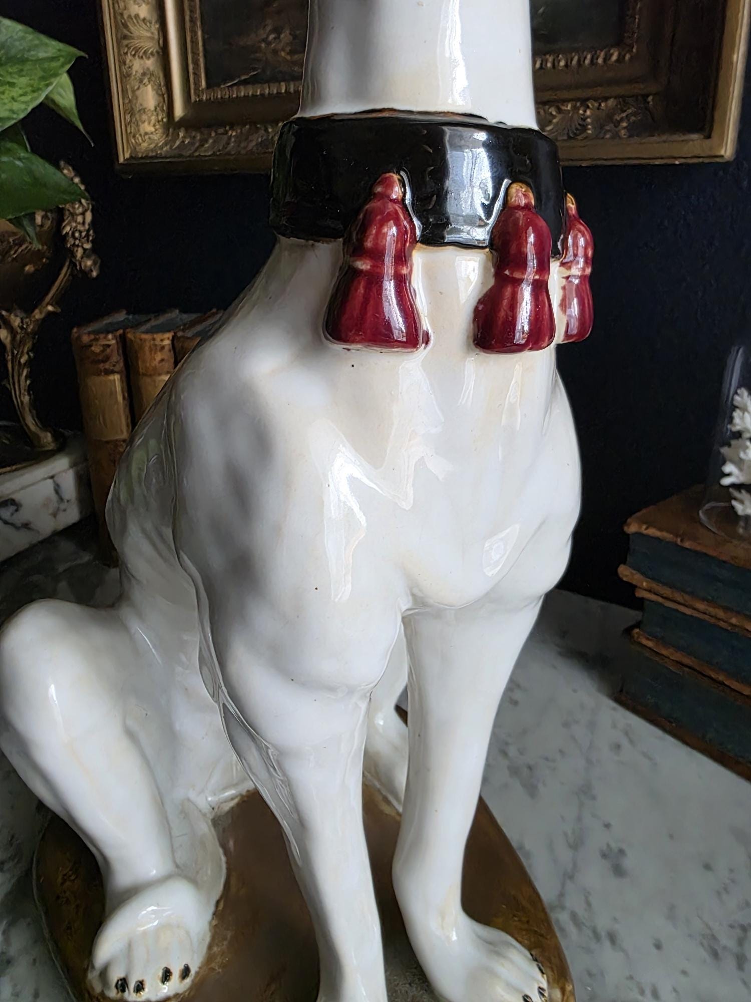 Capture the essence of mid-century Italian craftsmanship with this magnificent ceramic whippet statue, a hallmark of glamorous Hollywood Regency style. Exported from Italy during the 1950s or 1960s, this elegant hound is cast in a classic seated posture with an attentive gaze directed nobly upward. The glossy white glaze is beautifully contrasted by a bold black collar featuring three hand-painted maroon tassels—a signature flourish of vintage Italian pottery from this era. Authentic to its mid-century origins, the piece exhibits subtle, natural crazing throughout the glaze and gentle wear on the textured base, lending it a storied, authentic charm. Perfectly suited to anchor a dark or light academia library shelf or to add an opulent touch to a moody vintage vignette, this statuesque figurine makes a sophisticated statement in any curated interior. This ceramic statue bears natural crazing and wear consistent with vintage mid-century age, but bears no chips, cracks or breaks.