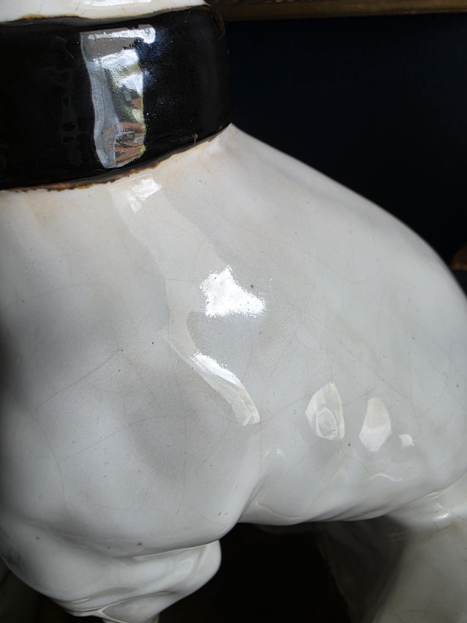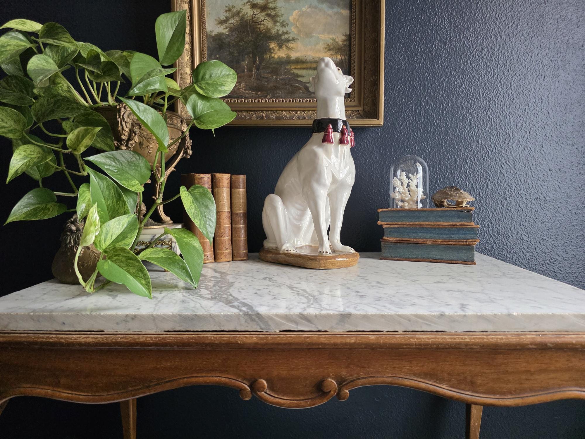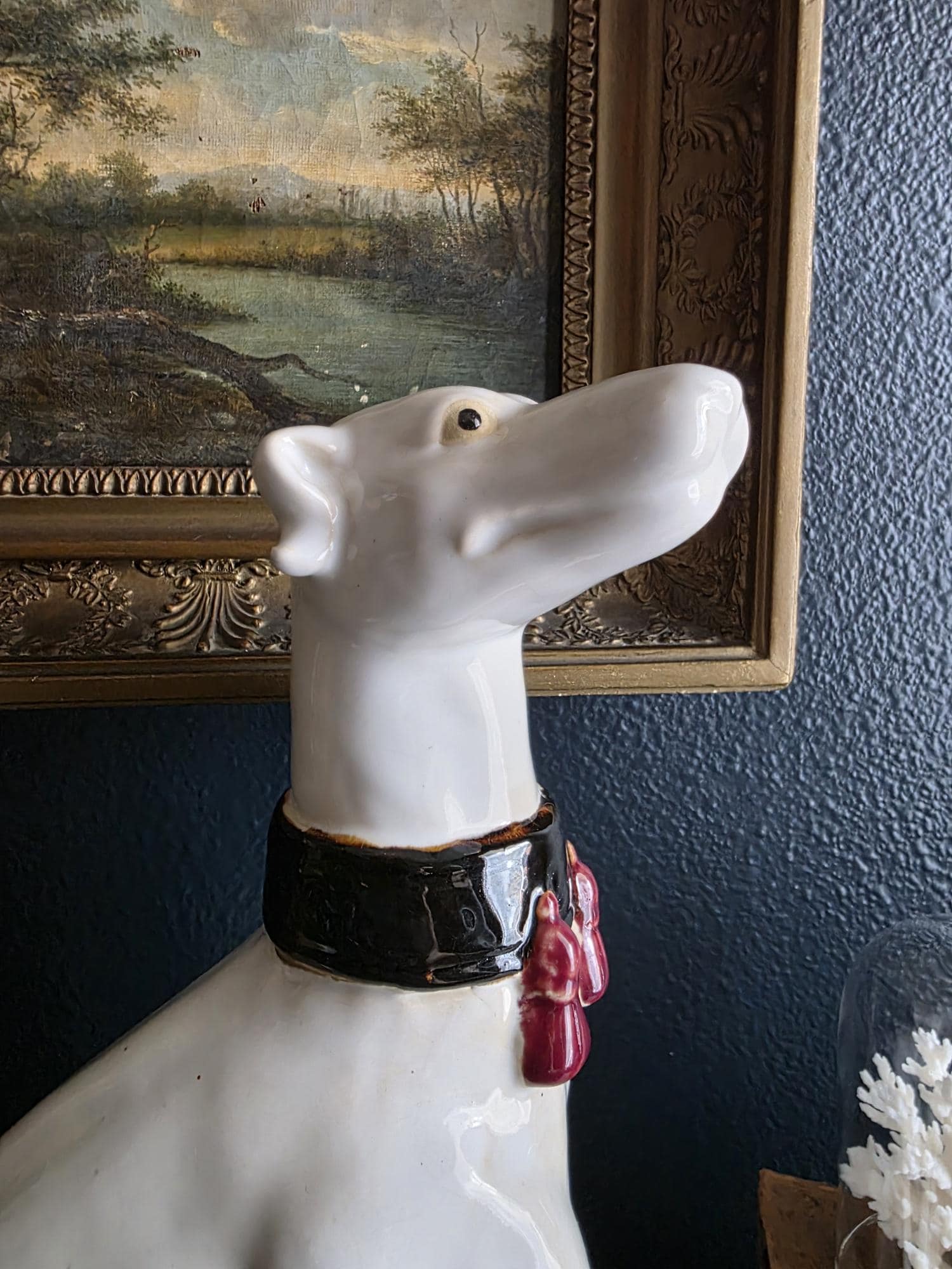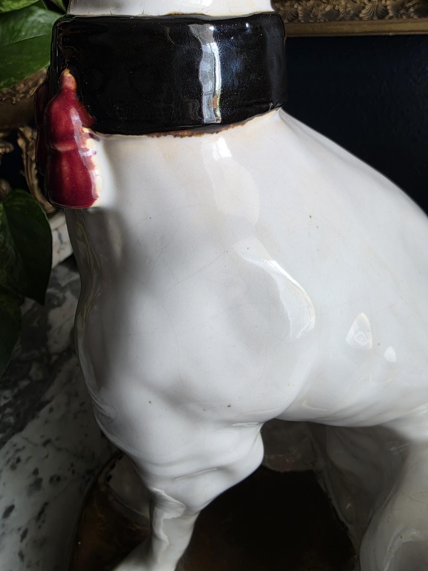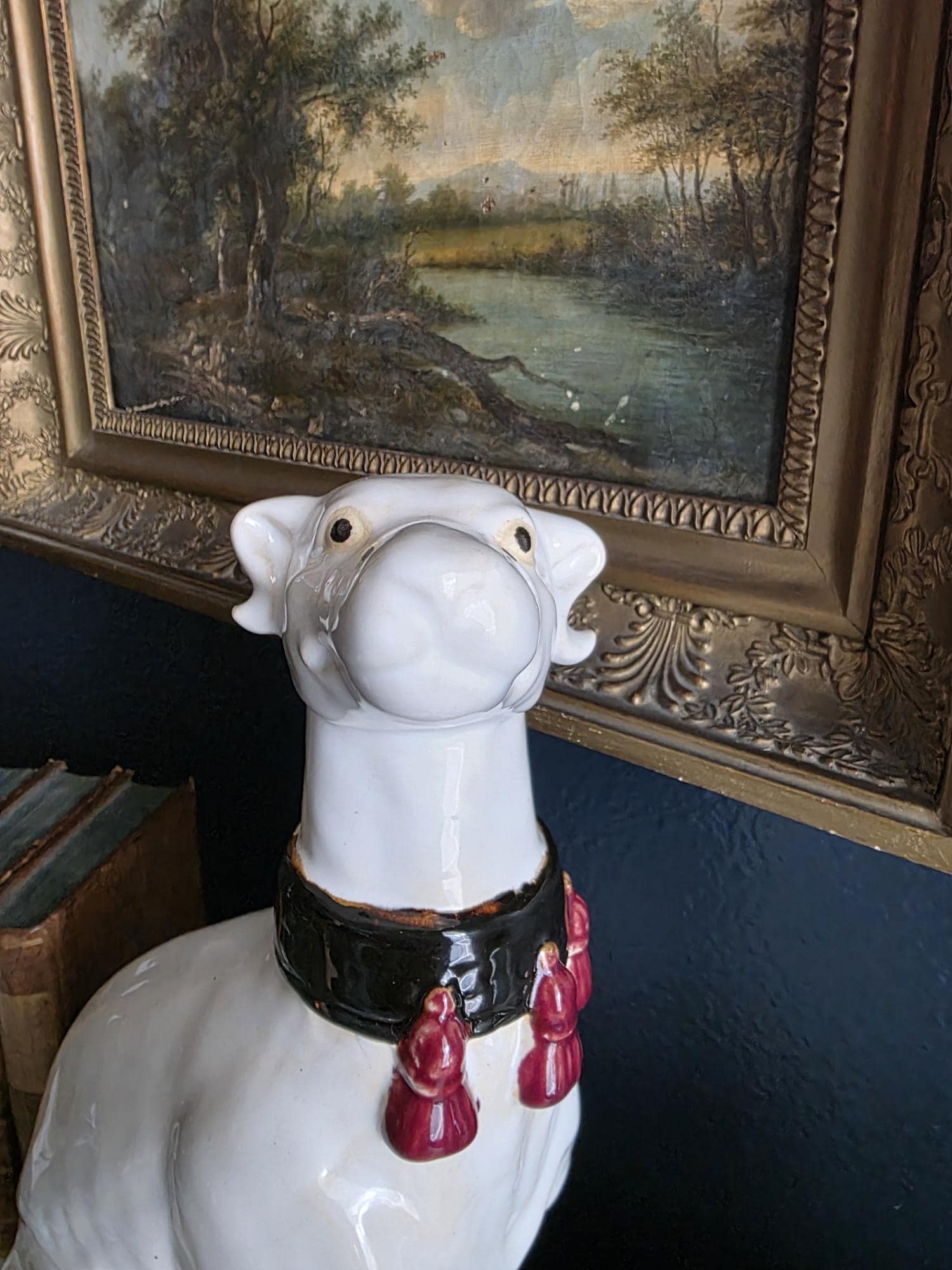 Capture the essence of mid-century Italian craftsmanship with this magnificent ceramic whippet statue, a hallmark of glamorous Hollywood Regency style. Exported from Italy during the 1950s or 1960s, this elegant hound is cast in a classic seated posture with an attentive gaze directed nobly upward. The glossy white glaze is beautifully contrasted by a bold black collar featuring three hand-painted maroon tassels—a signature flourish of vintage Italian pottery from this era. Authentic to its mid-century origins, the piece exhibits subtle, natural crazing throughout the glaze and gentle wear on the textured base, lending it a storied, authentic charm. Perfectly suited to anchor a dark or light academia library shelf or to add an opulent touch to a moody vintage vignette, this statuesque figurine makes a sophisticated statement in any curated interior. This ceramic statue bears natural crazing and wear consistent with vintage mid-century age, but bears no chips, cracks or breaks.