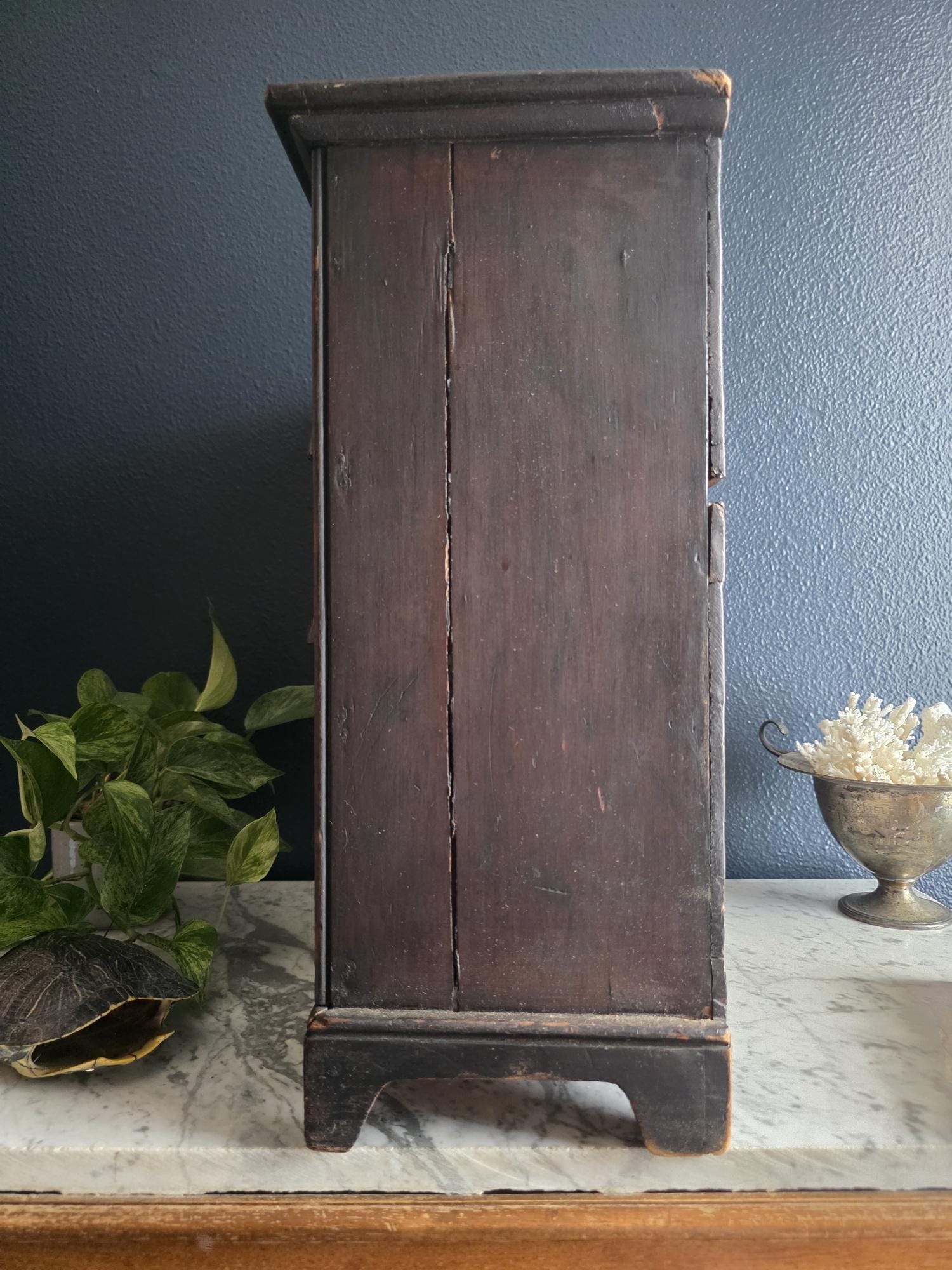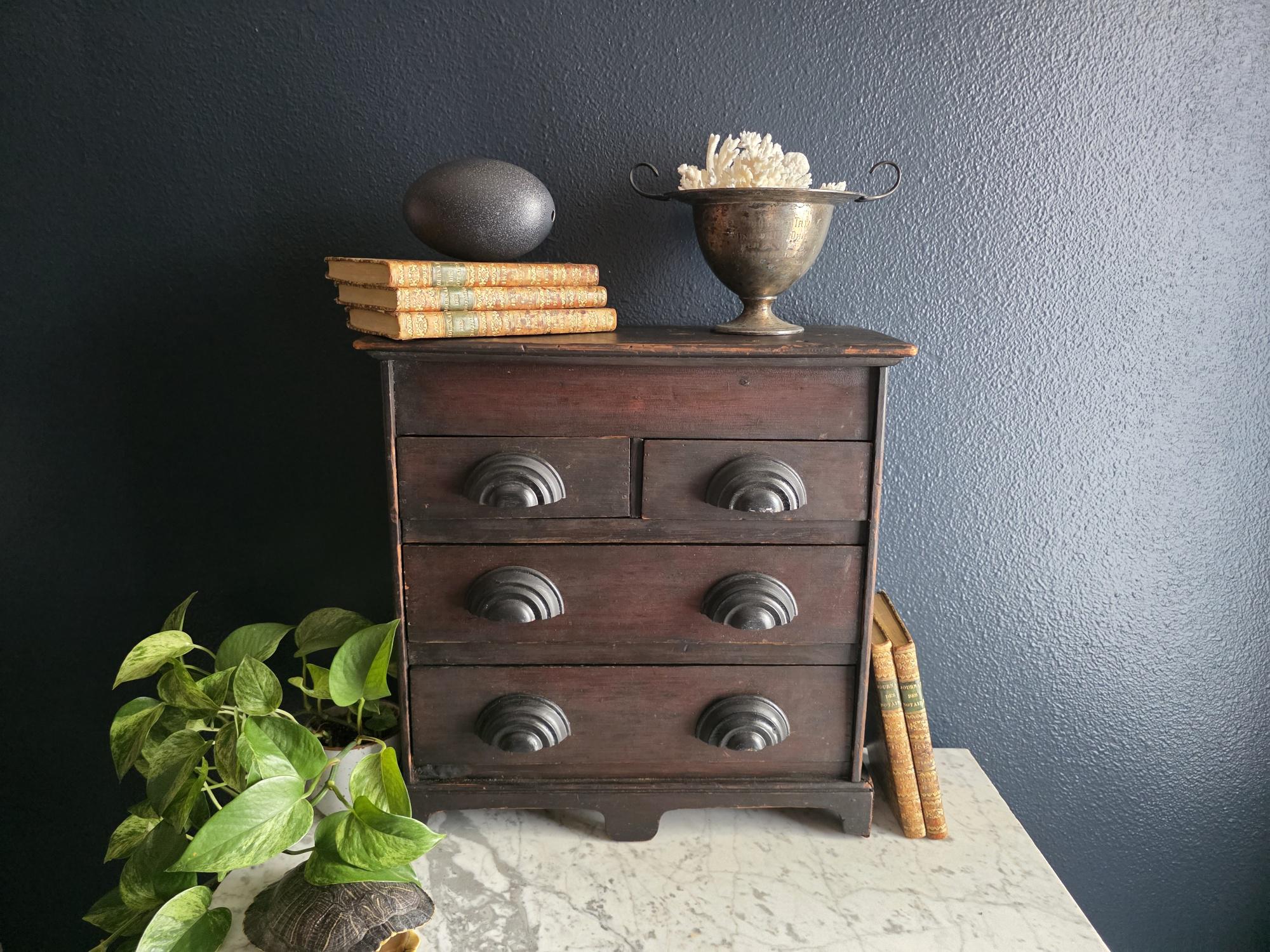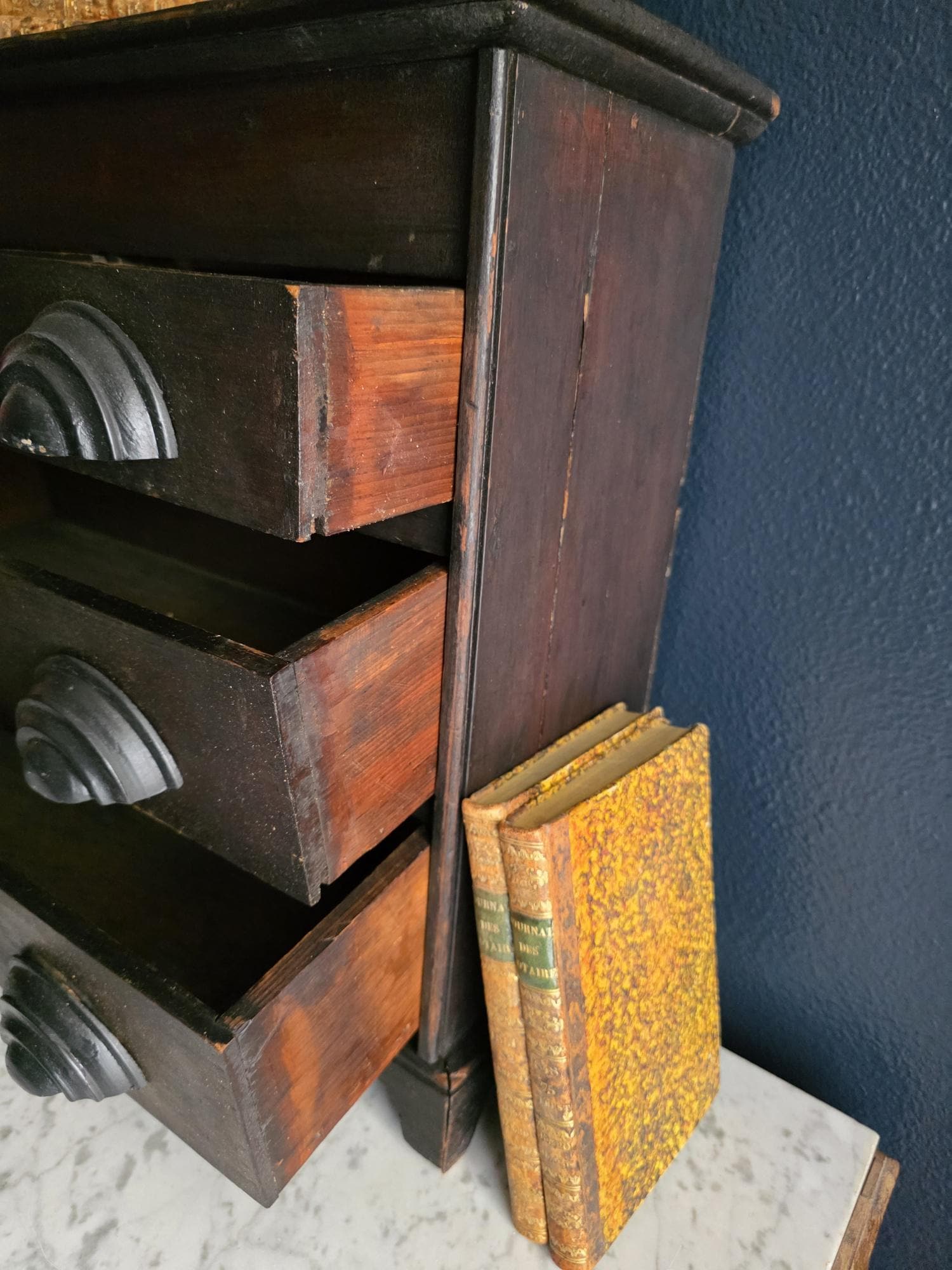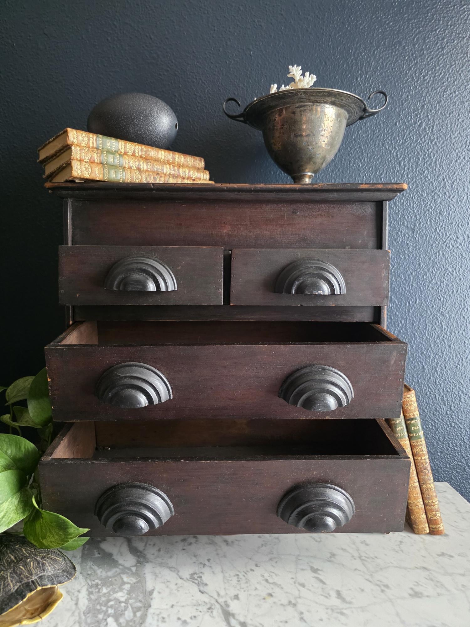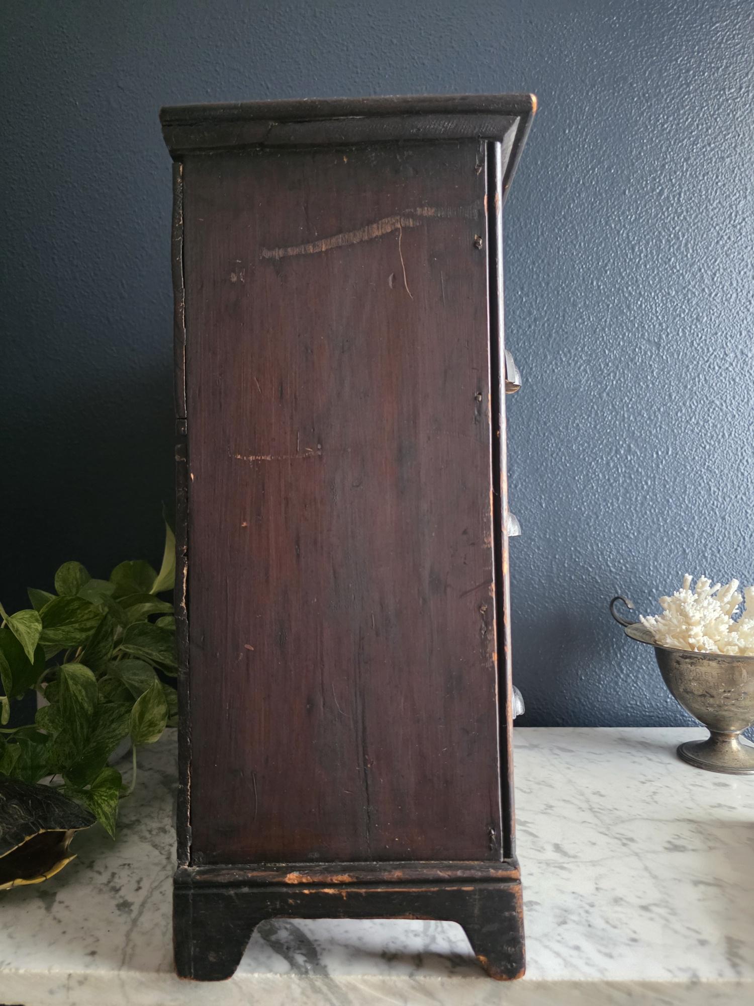 Presenting a charming and authentic 19th-century folk-built miniature chest of drawers, a piece that beautifully wears its long, utilitarian history. This diminutive three-tier cabinet features two small upper drawers and two full-width lower drawers, showcasing the wonderful imperfections and character inherent to handmade primitive furniture. The dark, deeply patinated wood exhibits authentic, weathered age, with worn edges, scuffed surfaces, and historical repairs—including a visible patched area on the lower front corner—that only add to its rustic narrative. The back paneling is constructed with traditional wide wooden planks secured by small antique hand forged nails. The piece has been updated in recent times with vintage replacement wood drawer pulls; these striking, ribbed semi-circular handles provide a structural, almost Art Deco-inspired contrast to the organic, primitive build. Rich with texture and history, this tabletop chest is perfectly suited for grounding a Moody Vintage aesthetic or enhancing a Dark Academia study, serving as both a compelling visual focal point and a practical storage solution for apothecary items, jewelry, or small curated curiosities. A one-of-a-kind statement piece that will add endless character to your personal space.