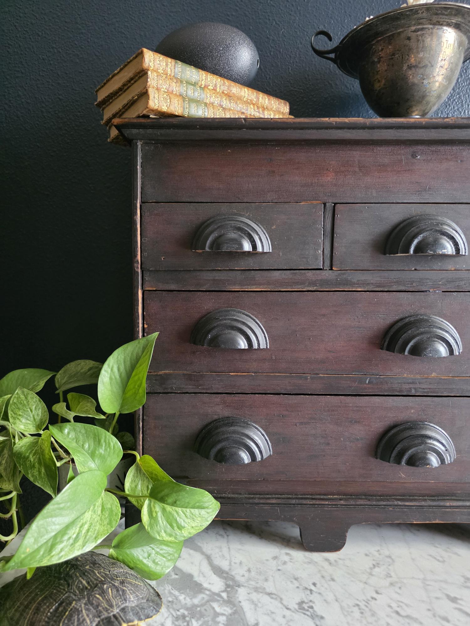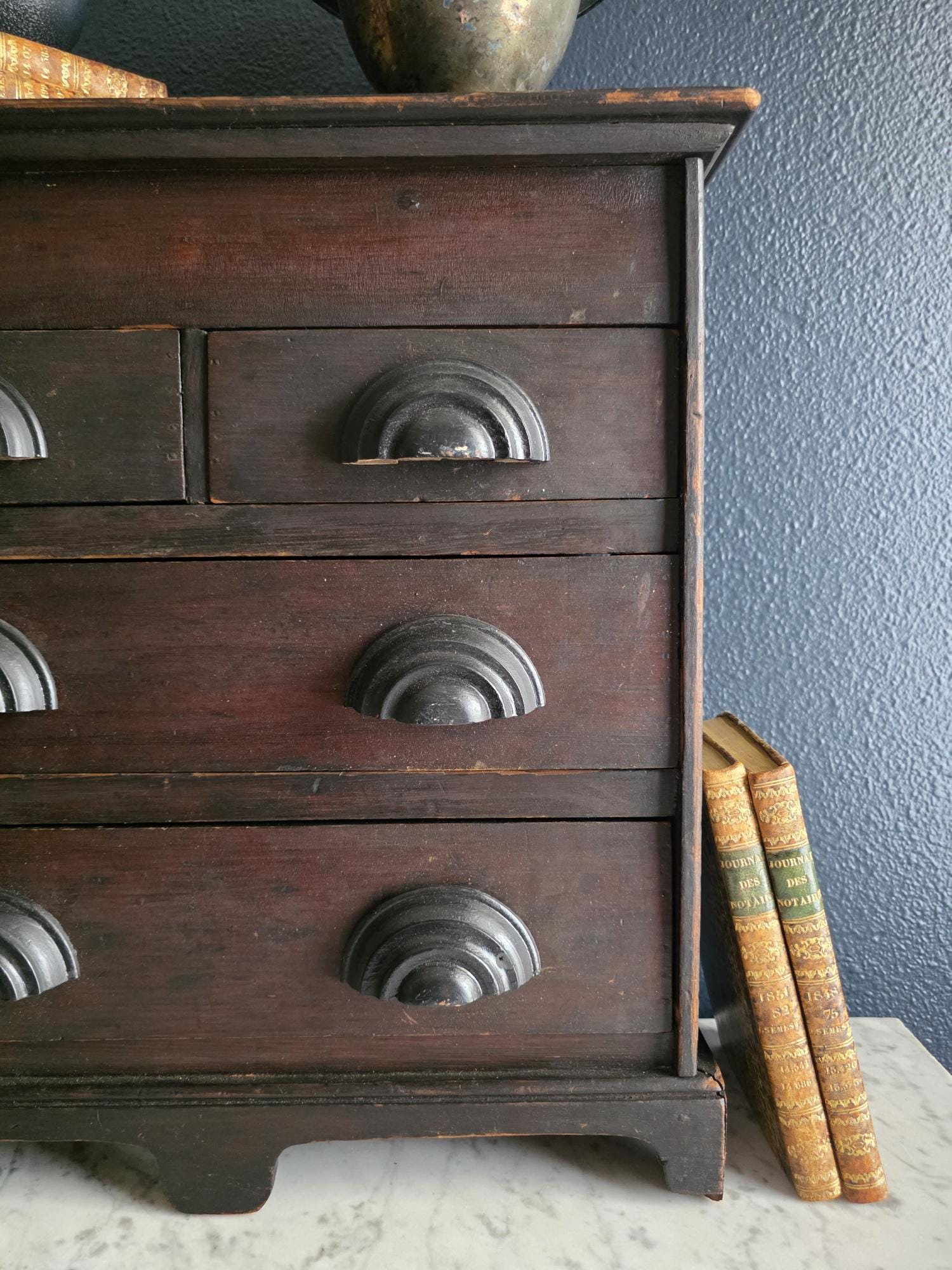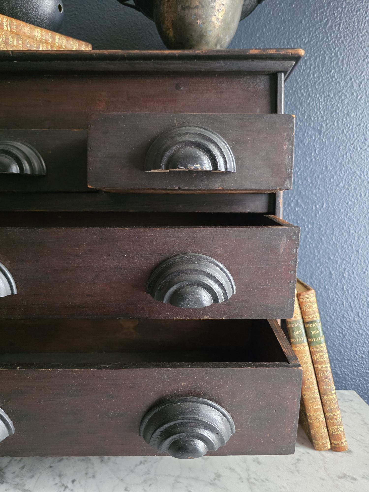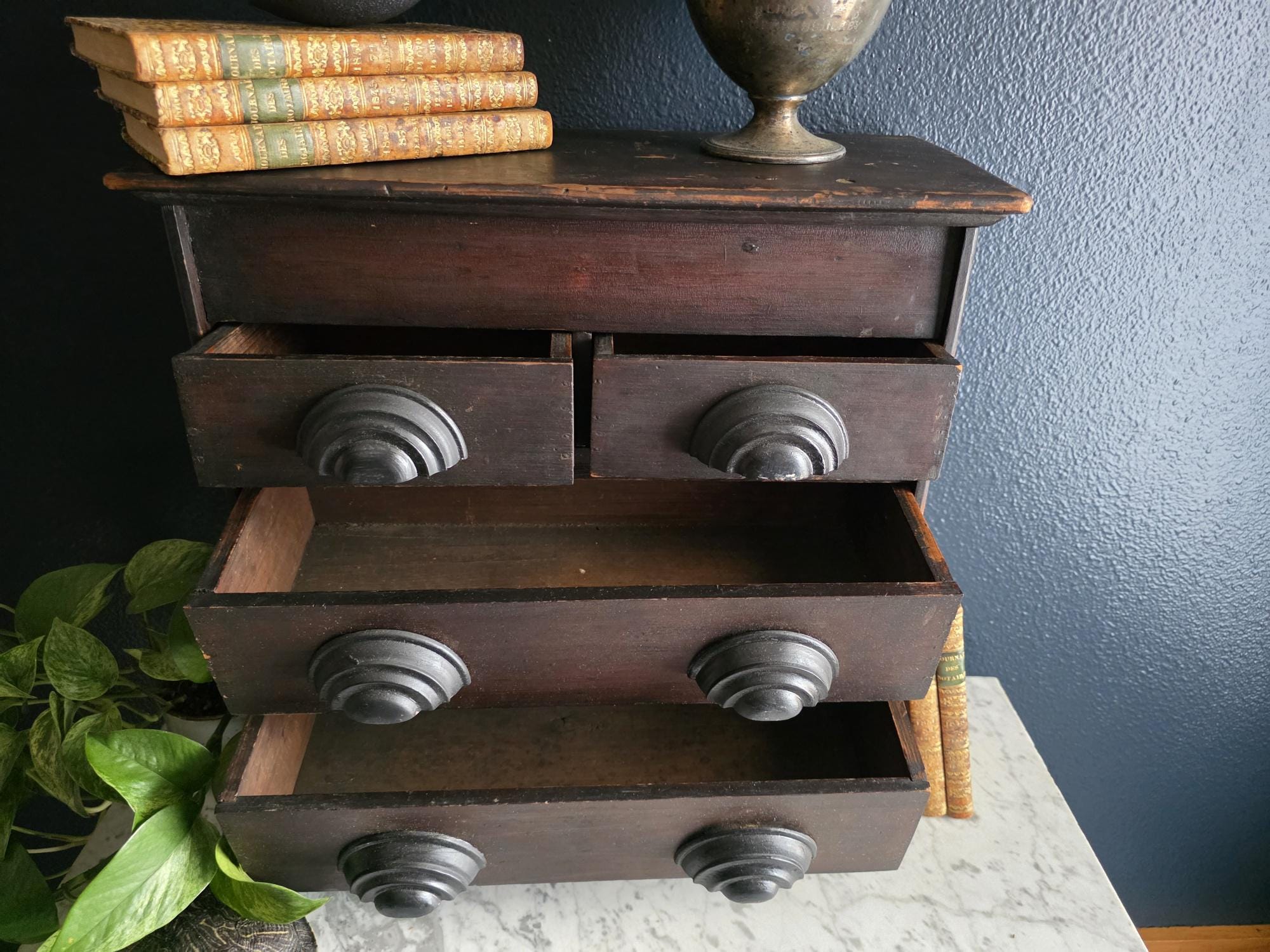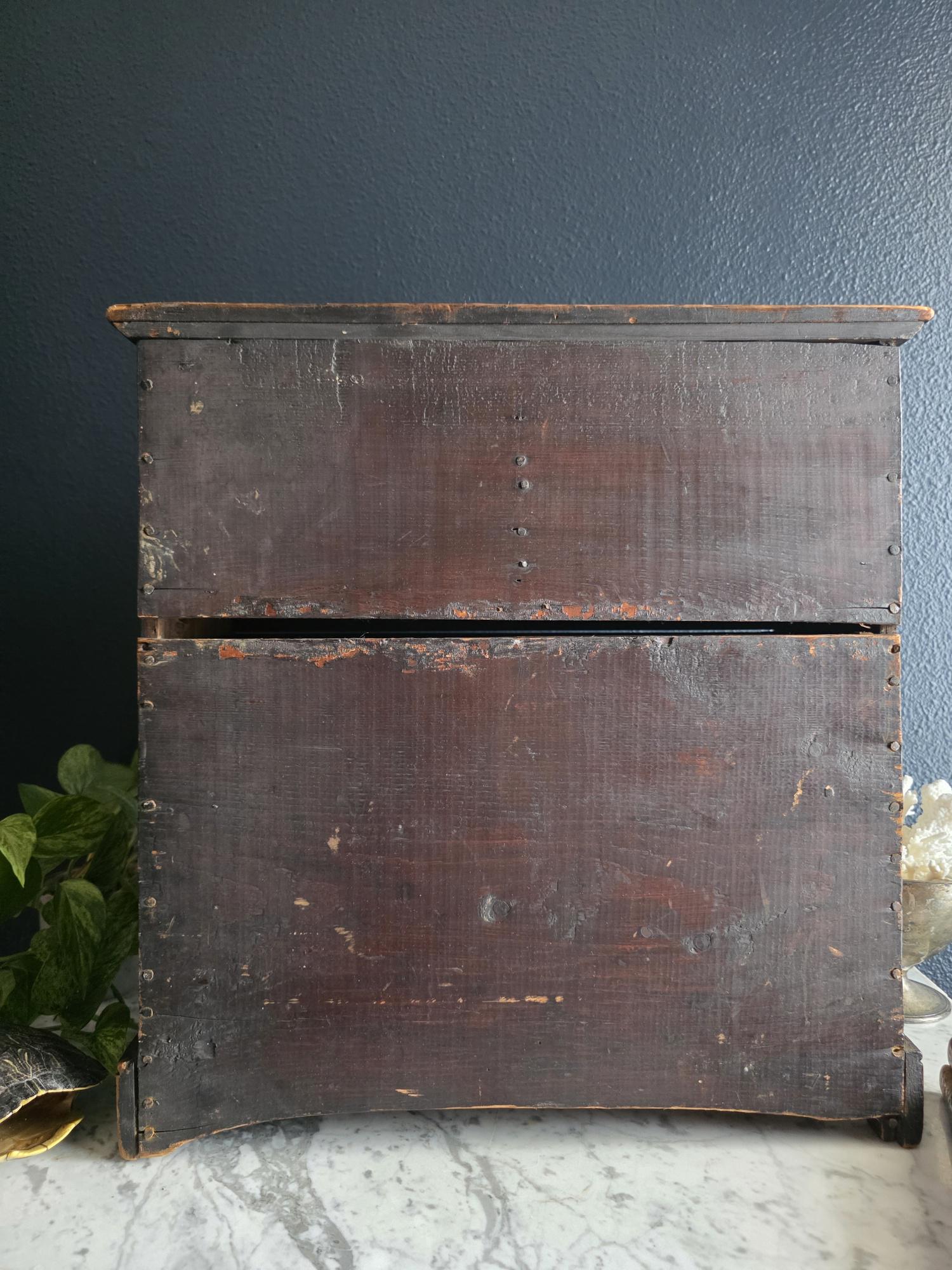 Presenting a charming and authentic 19th-century folk-built miniature chest of drawers, a piece that beautifully wears its long, utilitarian history. This diminutive three-tier cabinet features two small upper drawers and two full-width lower drawers, showcasing the wonderful imperfections and character inherent to handmade primitive furniture. The dark, deeply patinated wood exhibits authentic, weathered age, with worn edges, scuffed surfaces, and historical repairs—including a visible patched area on the lower front corner—that only add to its rustic narrative. The back paneling is constructed with traditional wide wooden planks secured by small antique hand forged nails. The piece has been updated in recent times with vintage replacement wood drawer pulls; these striking, ribbed semi-circular handles provide a structural, almost Art Deco-inspired contrast to the organic, primitive build. Rich with texture and history, this tabletop chest is perfectly suited for grounding a Moody Vintage aesthetic or enhancing a Dark Academia study, serving as both a compelling visual focal point and a practical storage solution for apothecary items, jewelry, or small curated curiosities. A one-of-a-kind statement piece that will add endless character to your personal space.