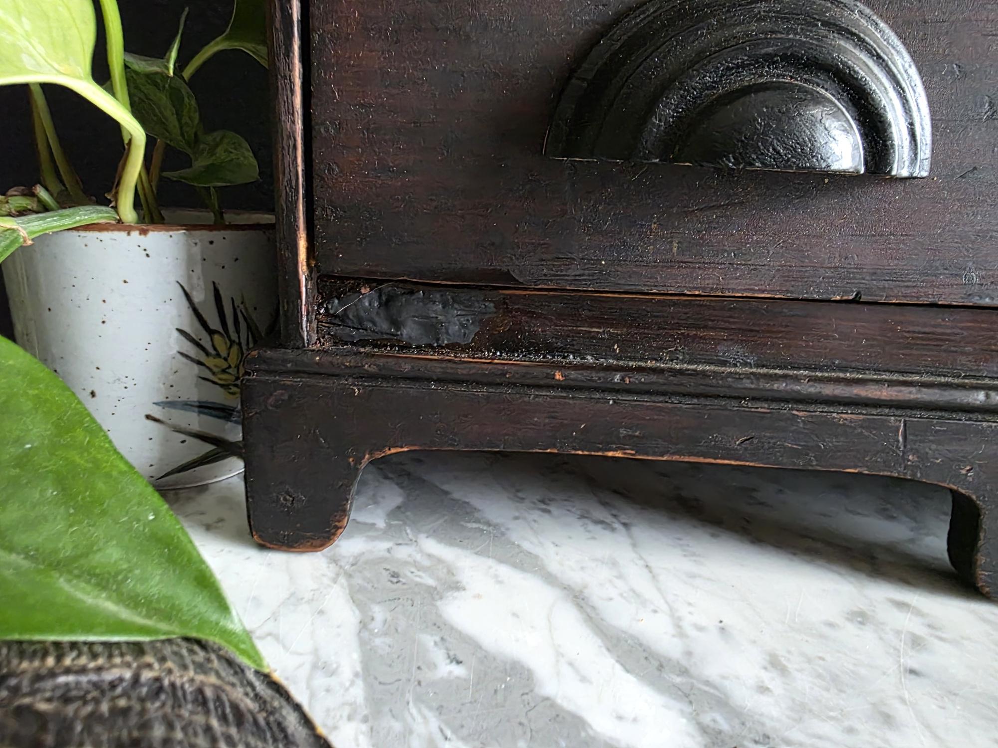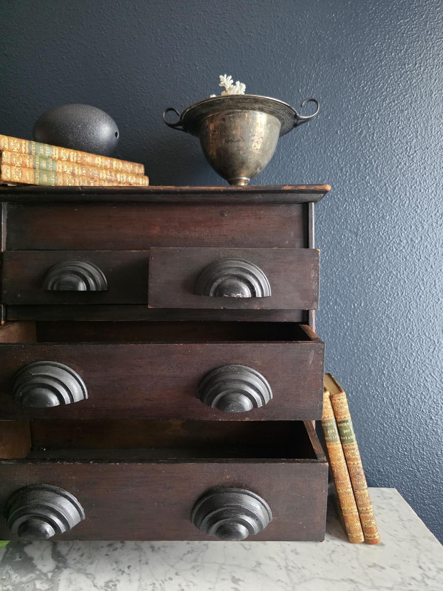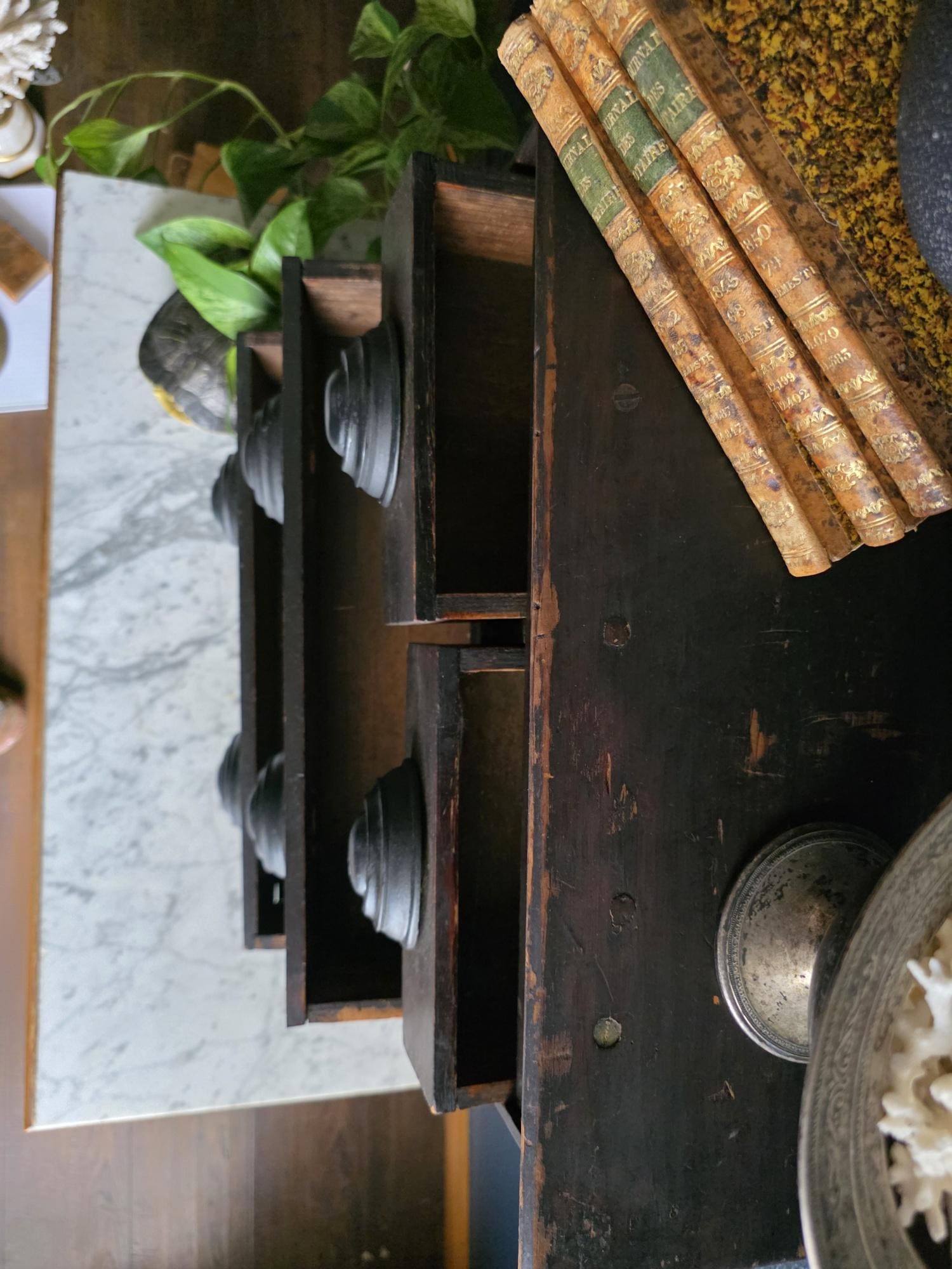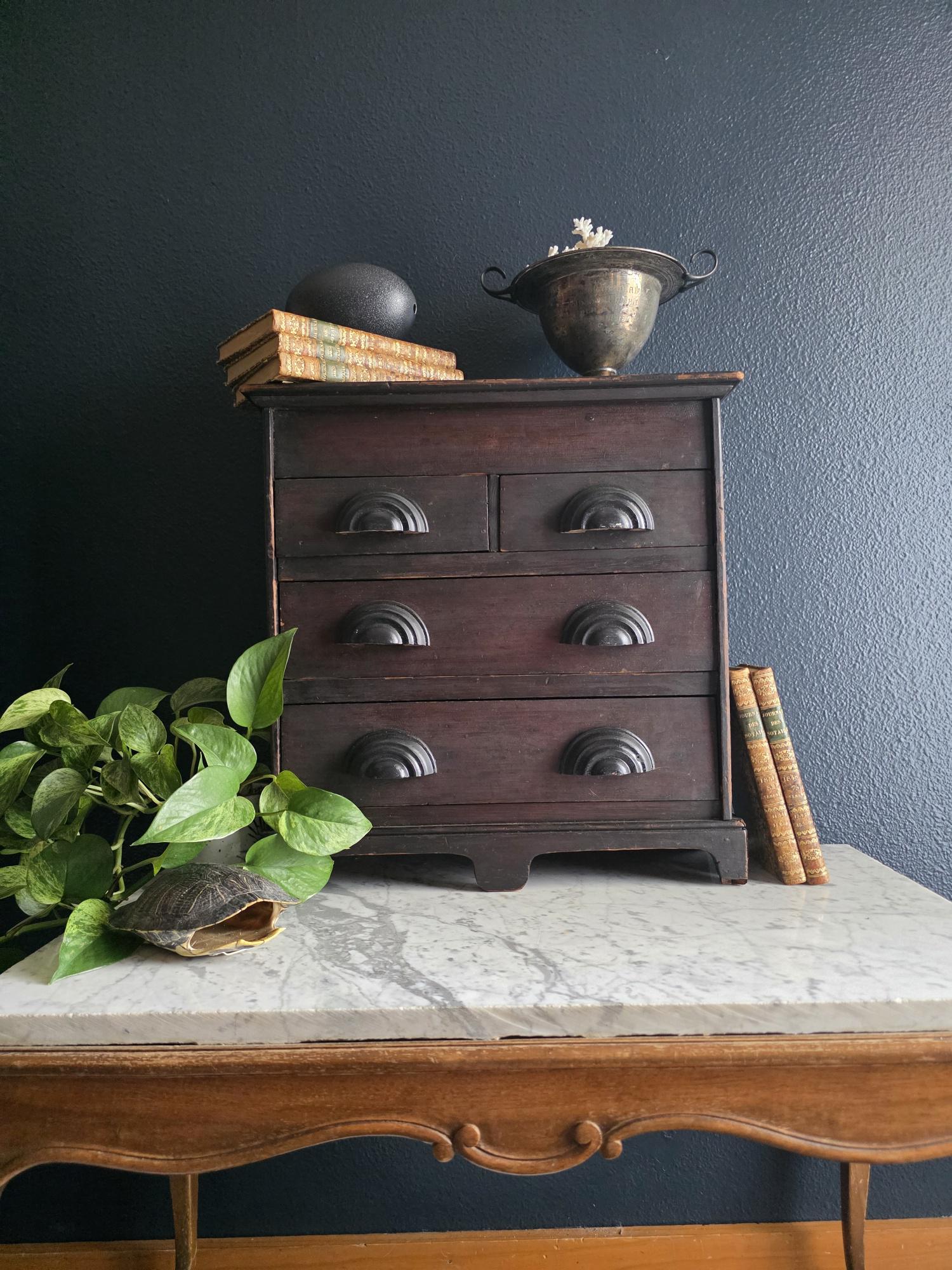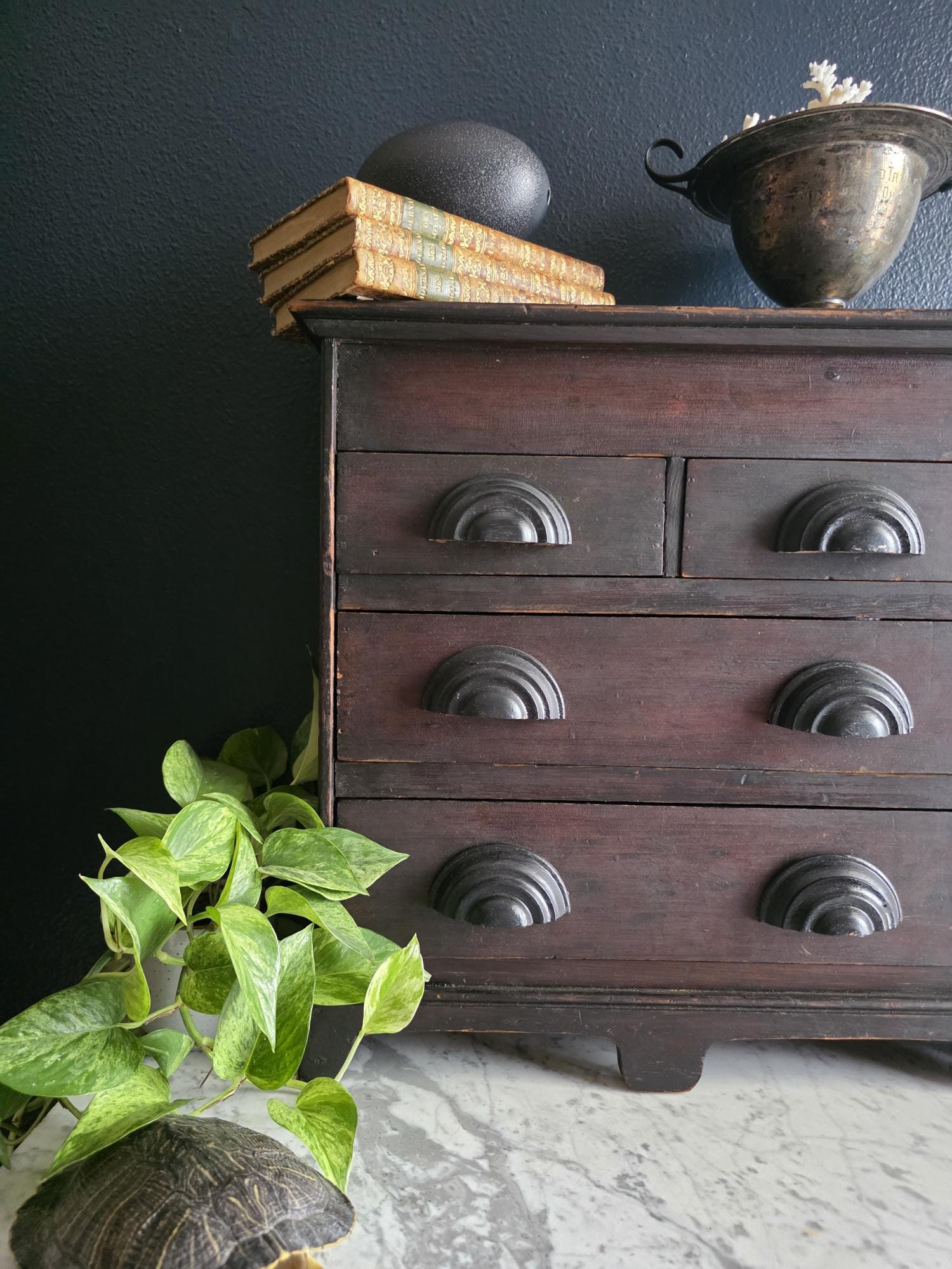 Presenting a charming and authentic 19th-century folk-built miniature chest of drawers, a piece that beautifully wears its long, utilitarian history. This diminutive three-tier cabinet features two small upper drawers and two full-width lower drawers, showcasing the wonderful imperfections and character inherent to handmade primitive furniture. The dark, deeply patinated wood exhibits authentic, weathered age, with worn edges, scuffed surfaces, and historical repairs—including a visible patched area on the lower front corner—that only add to its rustic narrative. The back paneling is constructed with traditional wide wooden planks secured by small antique hand forged nails. The piece has been updated in recent times with vintage replacement wood drawer pulls; these striking, ribbed semi-circular handles provide a structural, almost Art Deco-inspired contrast to the organic, primitive build. Rich with texture and history, this tabletop chest is perfectly suited for grounding a Moody Vintage aesthetic or enhancing a Dark Academia study, serving as both a compelling visual focal point and a practical storage solution for apothecary items, jewelry, or small curated curiosities. A one-of-a-kind statement piece that will add endless character to your personal space.
