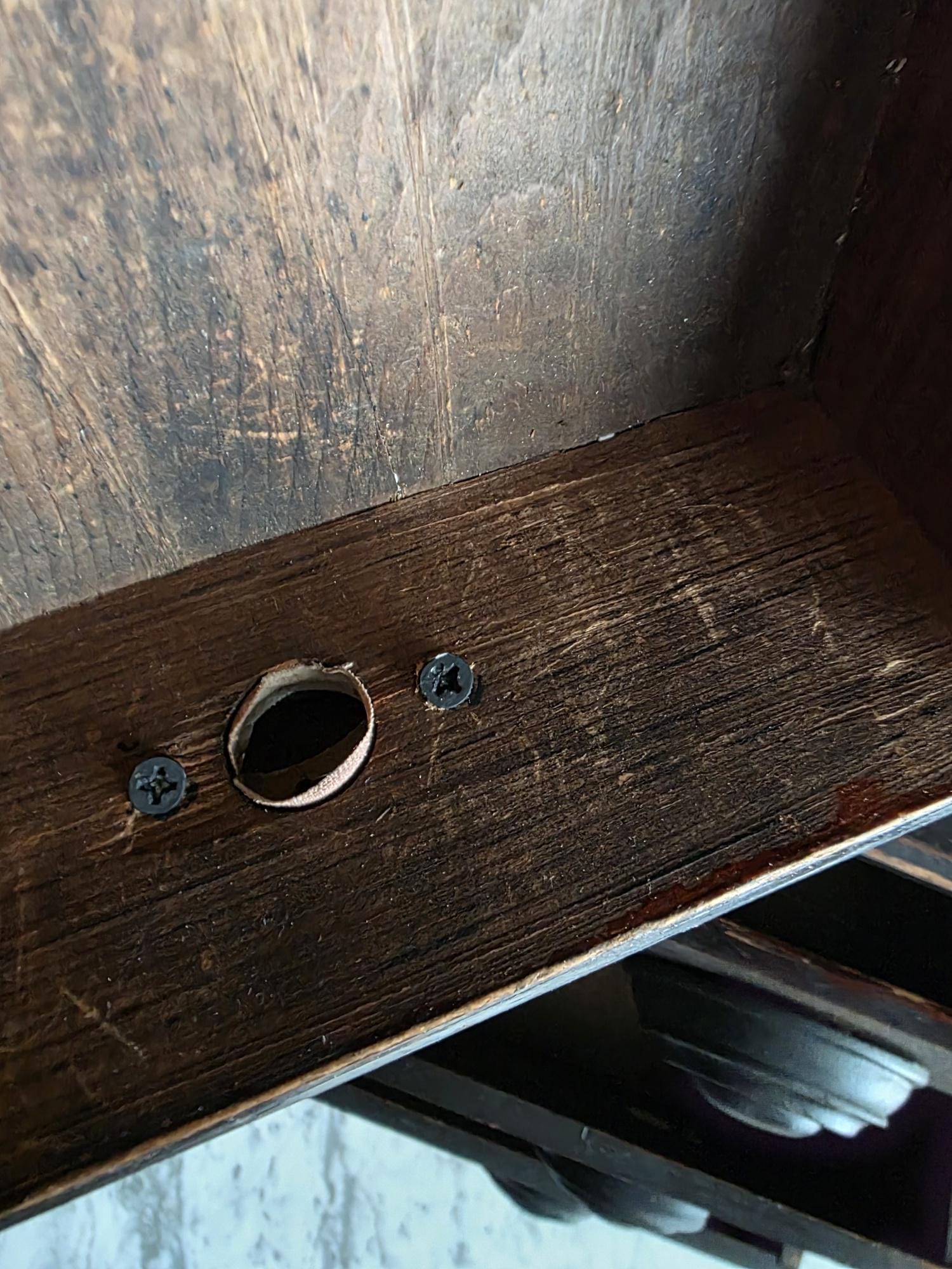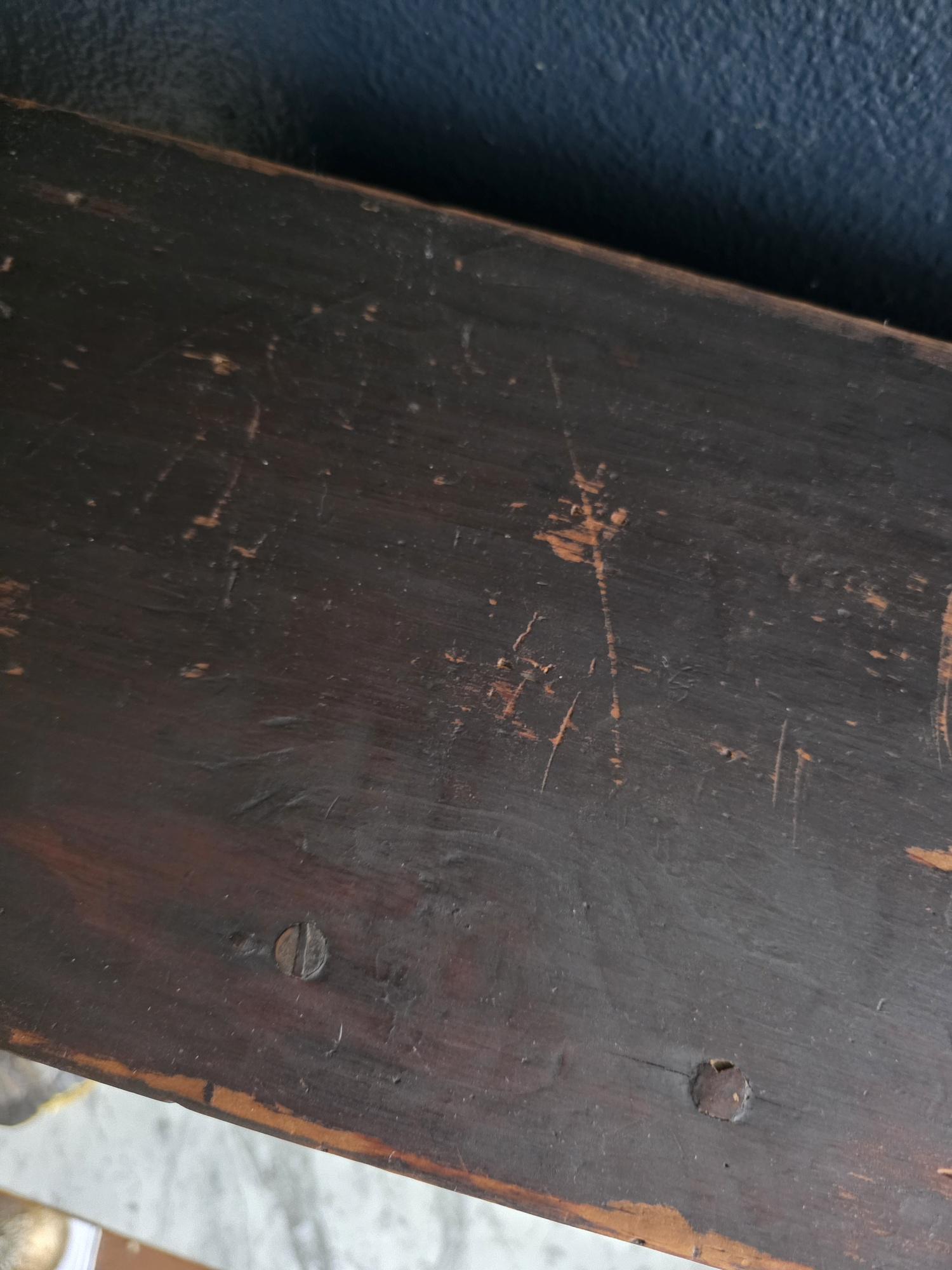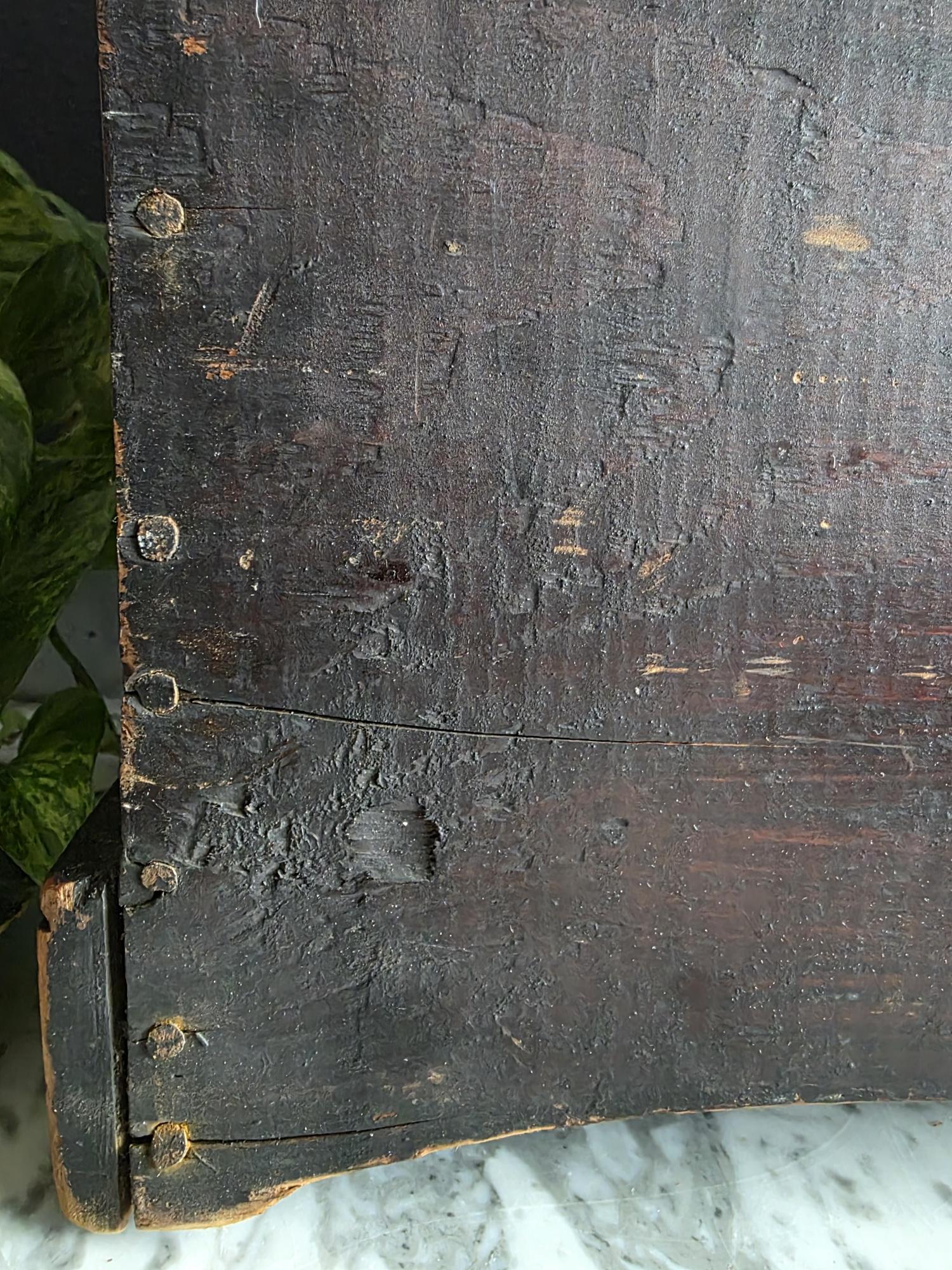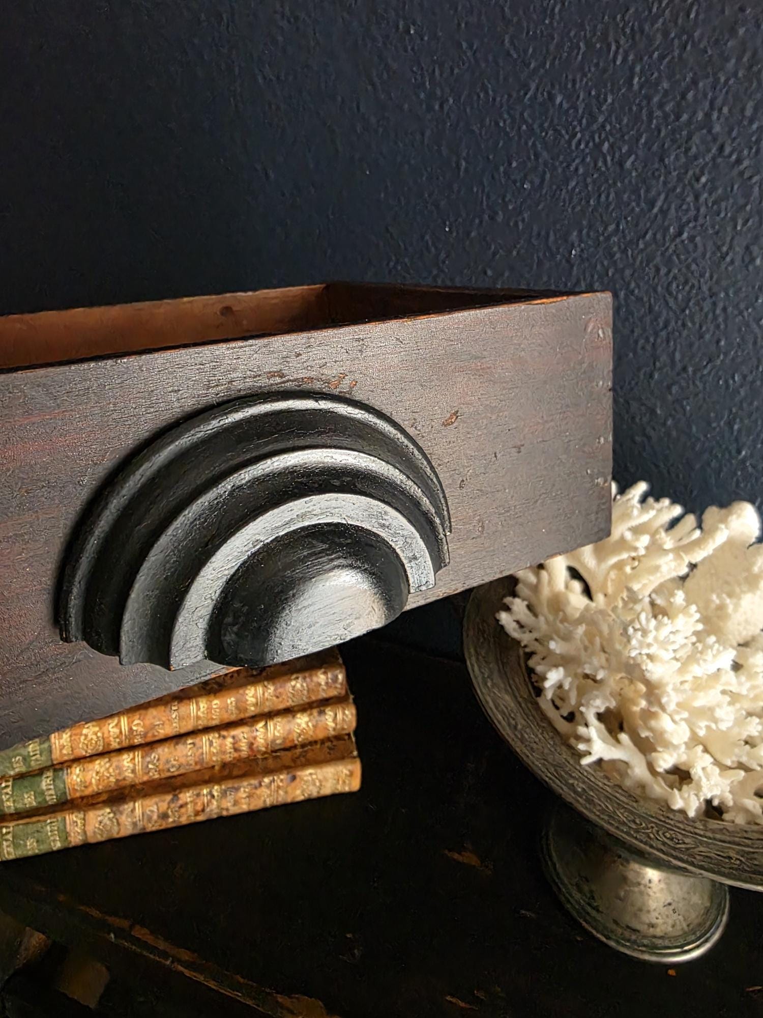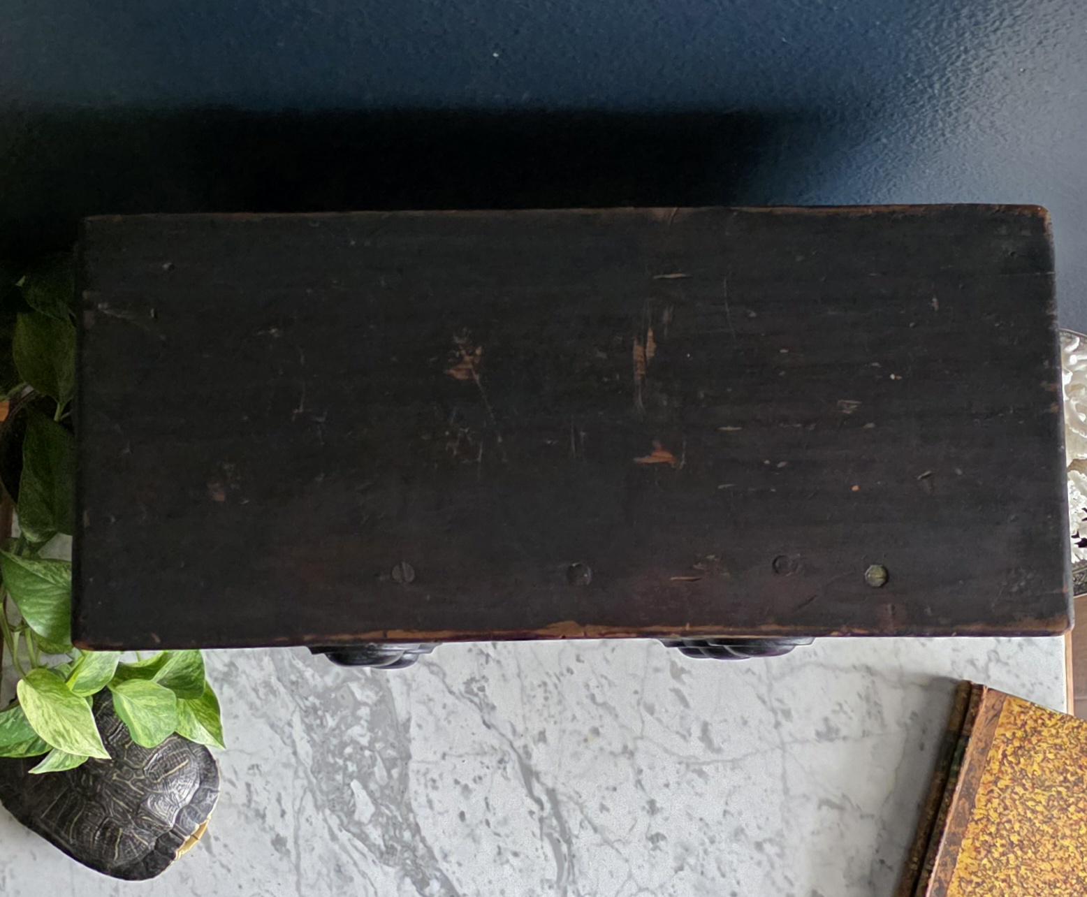 Presenting a charming and authentic 19th-century folk-built miniature chest of drawers, a piece that beautifully wears its long, utilitarian history. This diminutive three-tier cabinet features two small upper drawers and two full-width lower drawers, showcasing the wonderful imperfections and character inherent to handmade primitive furniture. The dark, deeply patinated wood exhibits authentic, weathered age, with worn edges, scuffed surfaces, and historical repairs—including a visible patched area on the lower front corner—that only add to its rustic narrative. The back paneling is constructed with traditional wide wooden planks secured by small antique hand forged nails. The piece has been updated in recent times with vintage replacement wood drawer pulls; these striking, ribbed semi-circular handles provide a structural, almost Art Deco-inspired contrast to the organic, primitive build. Rich with texture and history, this tabletop chest is perfectly suited for grounding a Moody Vintage aesthetic or enhancing a Dark Academia study, serving as both a compelling visual focal point and a practical storage solution for apothecary items, jewelry, or small curated curiosities. A one-of-a-kind statement piece that will add endless character to your personal space.
