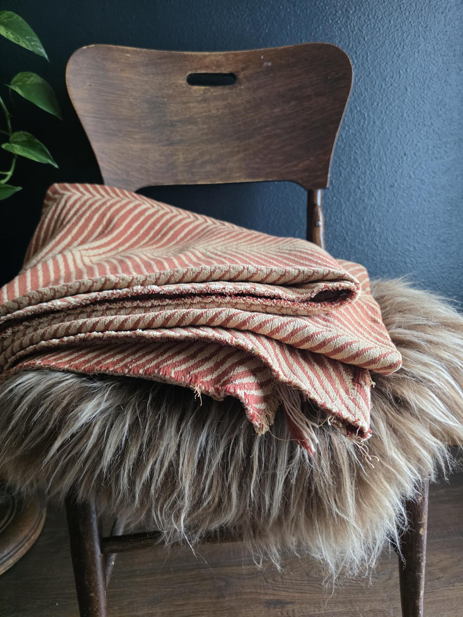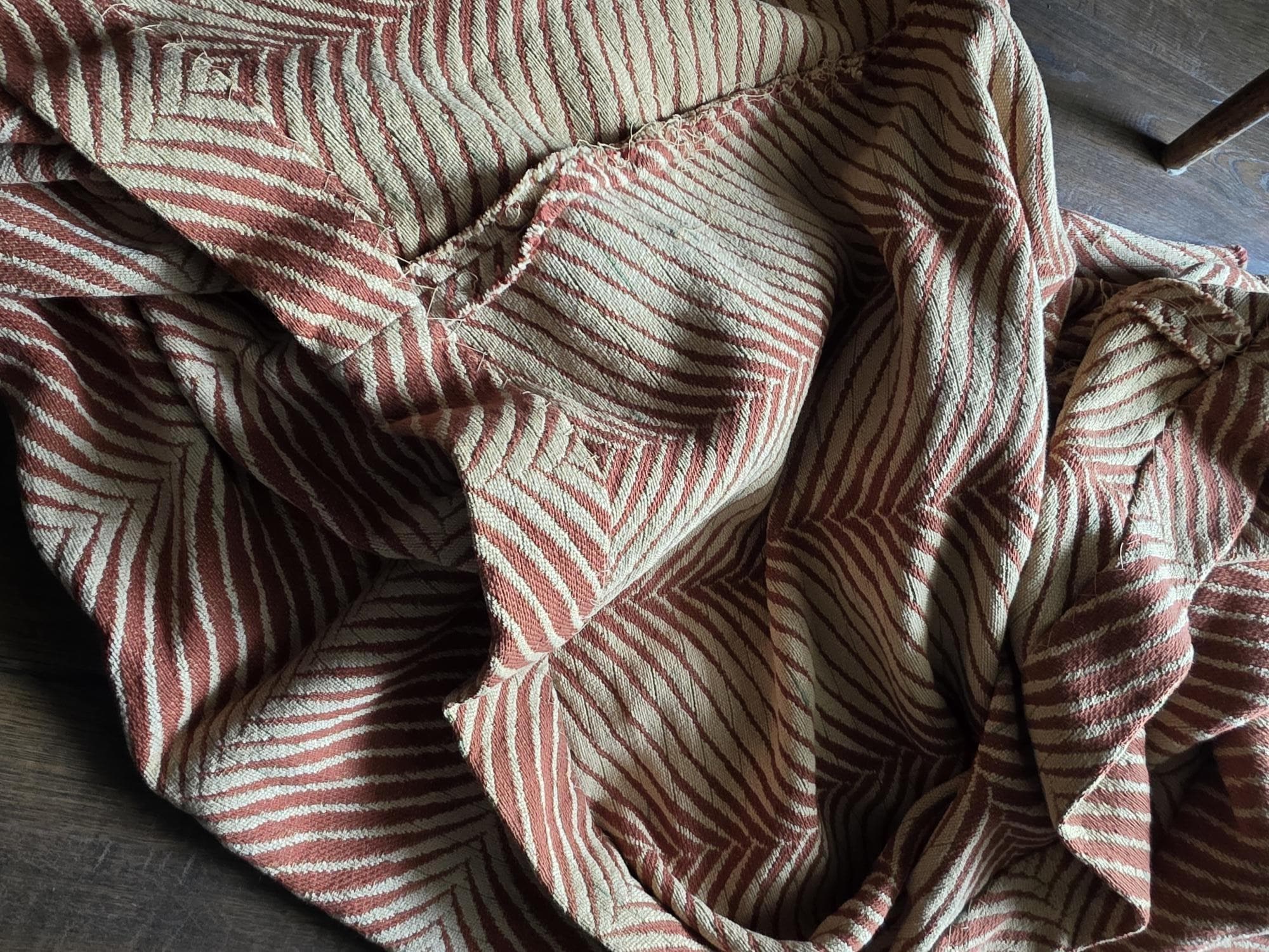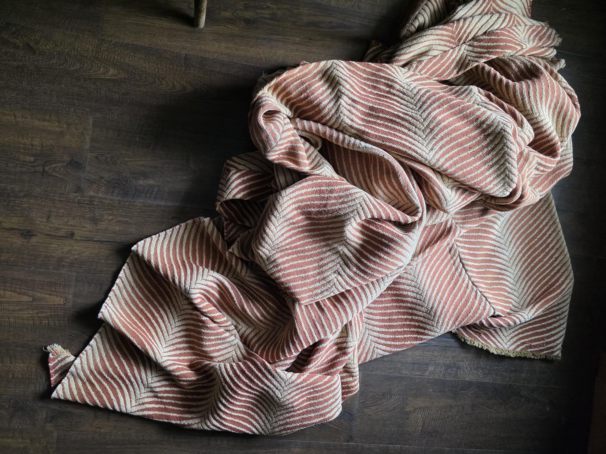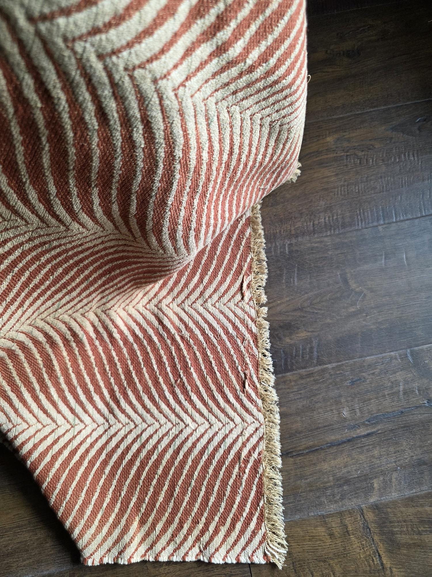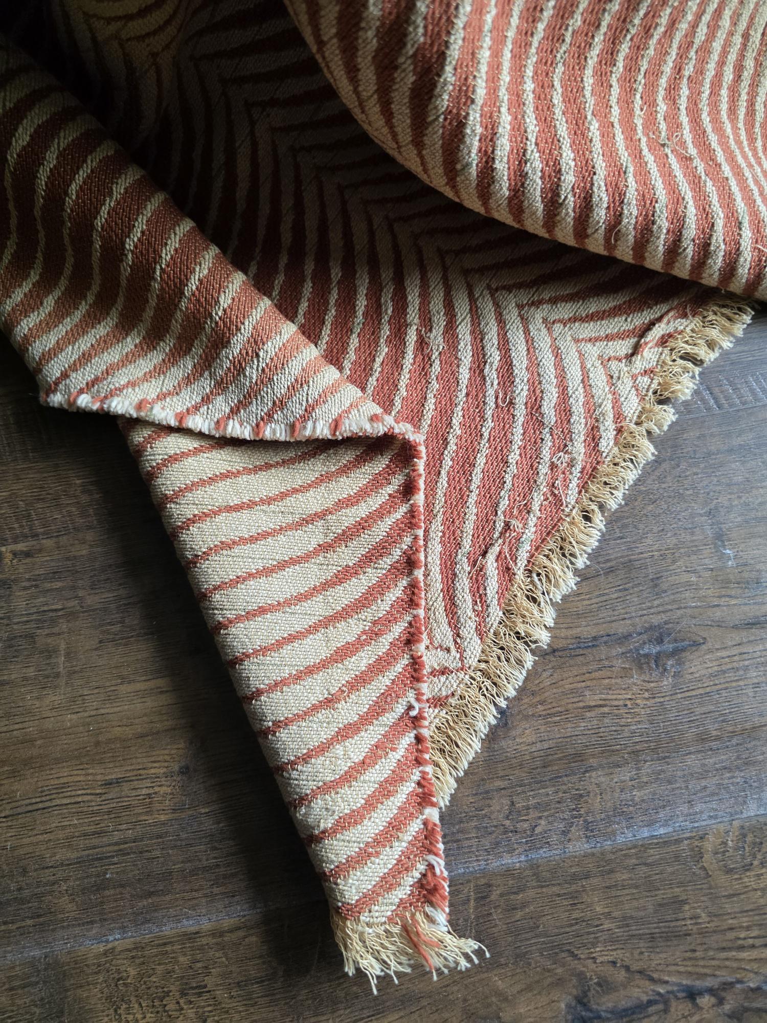 Presenting a substantial and highly textural vintage woven textile, offering a generous 108 by 70 inches of heavy-duty fabric. This striking piece features a warm, earthy palette of rust and natural cream, tightly woven into an eye-catching, undulating chevron or wavy striped pattern. Constructed from distinct panels traditionally seamed together down the center, the fabric boasts a thick, durable hand-feel and beautifully frayed, fringed edges that highlight its authentic, aged character. While its weathered condition, loose threads, and minor wear speak to its long history as a utilitarian textile, the sheer scale and robust weight make it an exceptional cutter piece for creative repurposing. Whether casually draped to soften an Industrial space, or repurposed into bespoke floor cushions and sturdy upholstery to anchor a Moody Vintage interior, this versatile scrap provides abundant yardage and rich, tactile depth for your next curated design project.