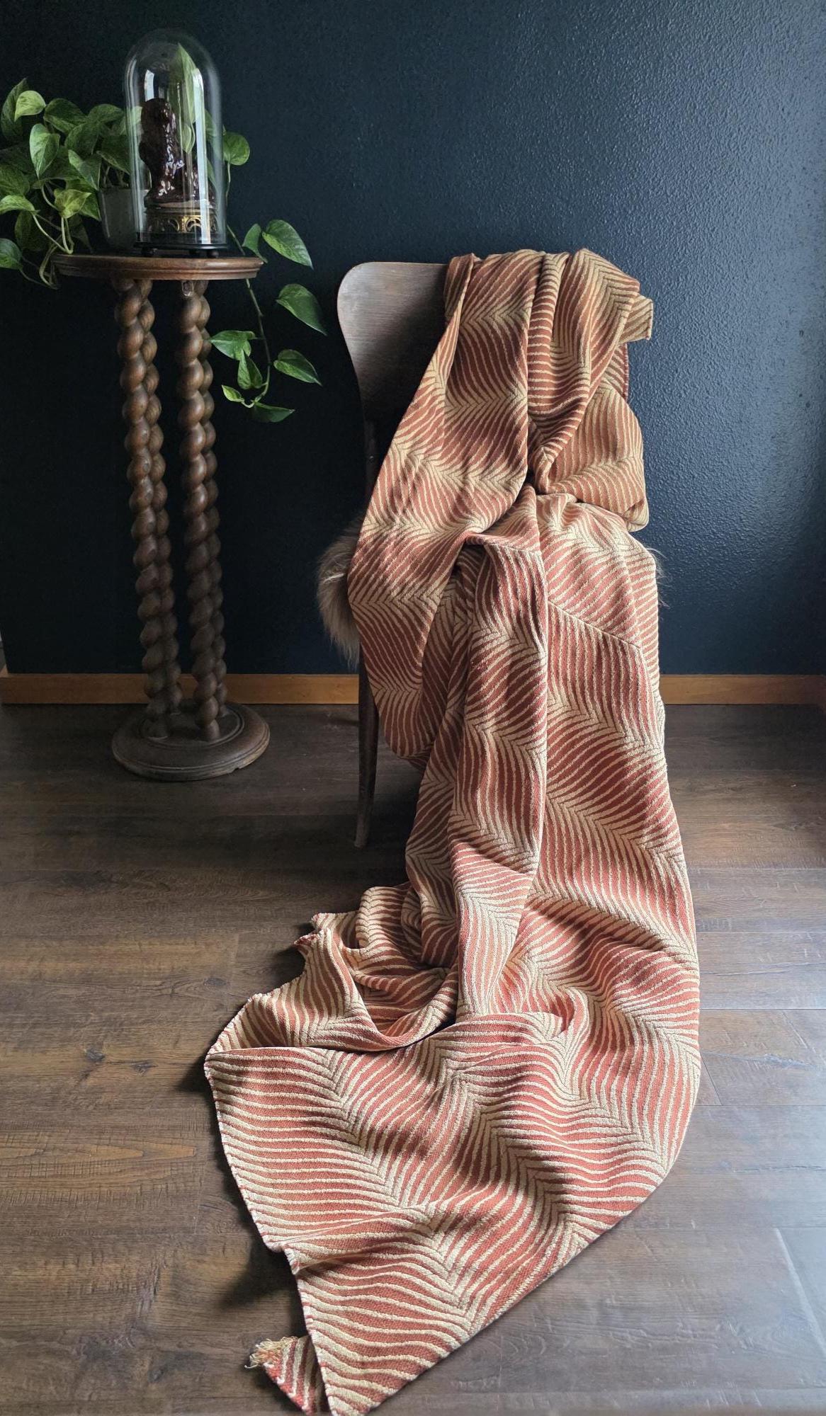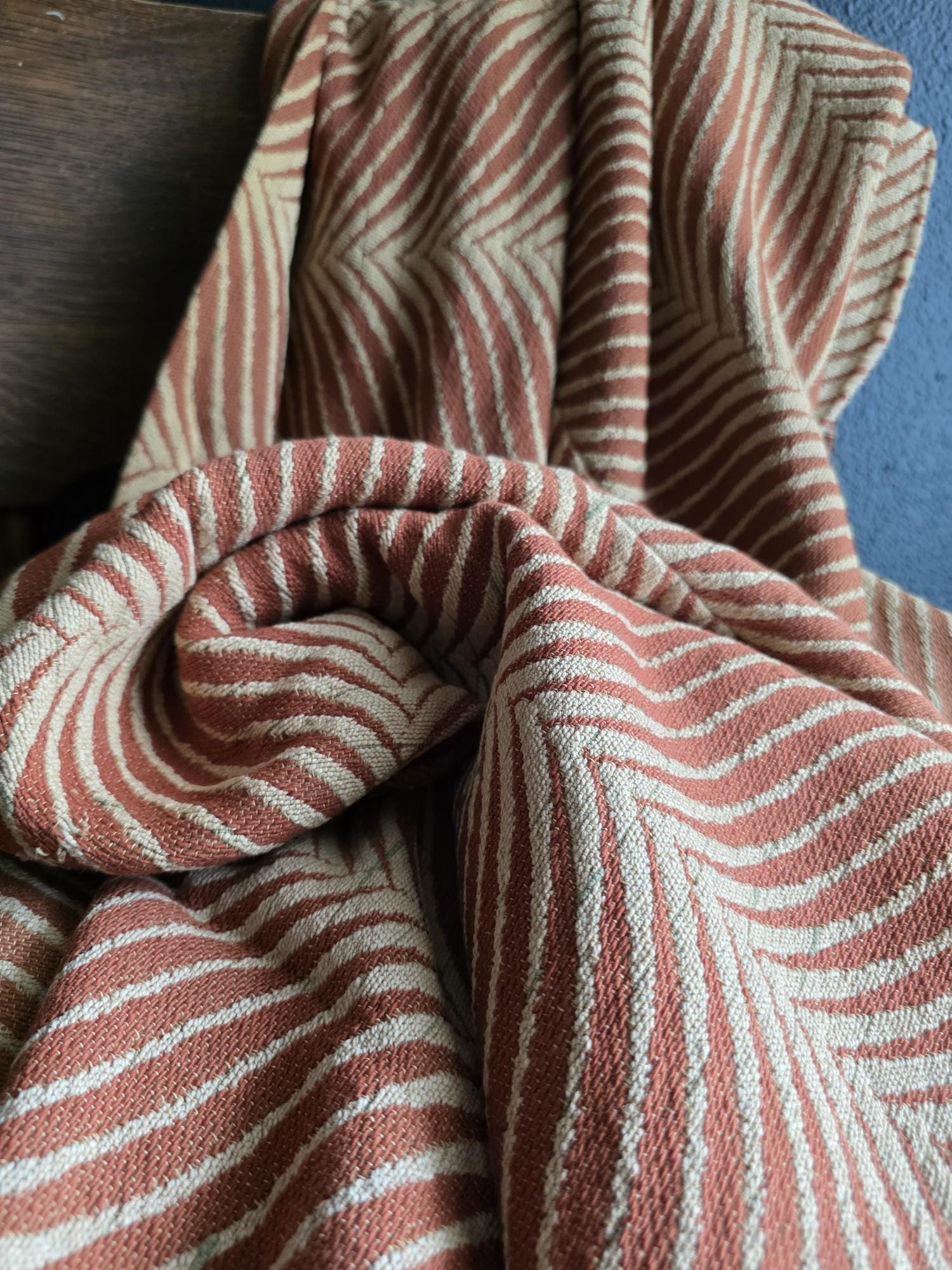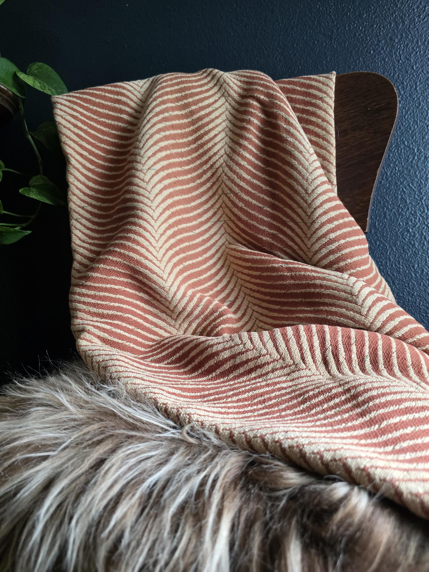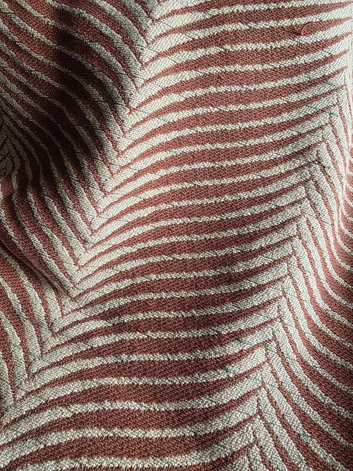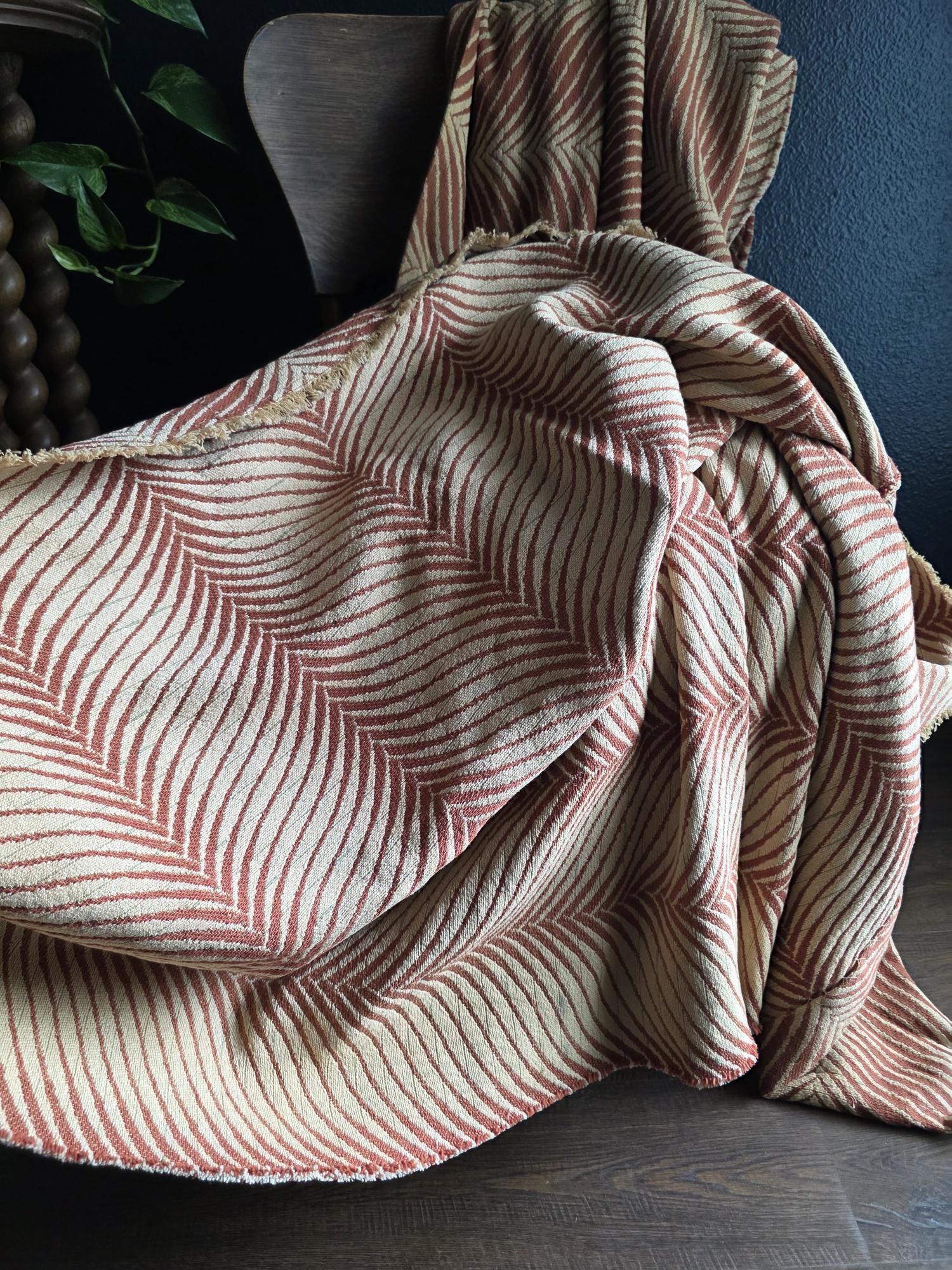 Presenting a substantial and highly textural vintage woven textile, offering a generous 108 by 70 inches of heavy-duty fabric. This striking piece features a warm, earthy palette of rust and natural cream, tightly woven into an eye-catching, undulating chevron or wavy striped pattern. Constructed from distinct panels traditionally seamed together down the center, the fabric boasts a thick, durable hand-feel and beautifully frayed, fringed edges that highlight its authentic, aged character. While its weathered condition, loose threads, and minor wear speak to its long history as a utilitarian textile, the sheer scale and robust weight make it an exceptional cutter piece for creative repurposing. Whether casually draped to soften an Industrial space, or repurposed into bespoke floor cushions and sturdy upholstery to anchor a Moody Vintage interior, this versatile scrap provides abundant yardage and rich, tactile depth for your next curated design project.