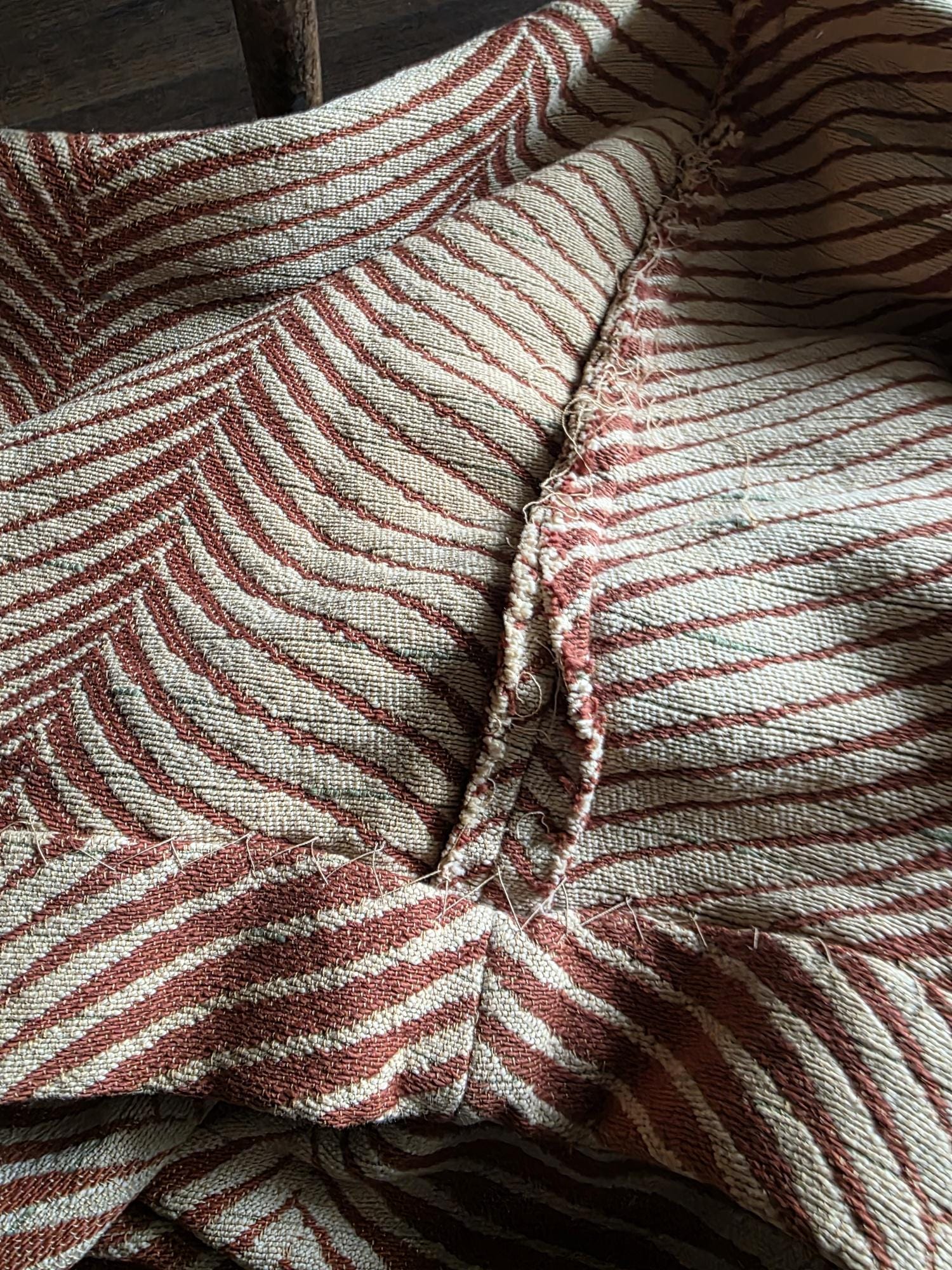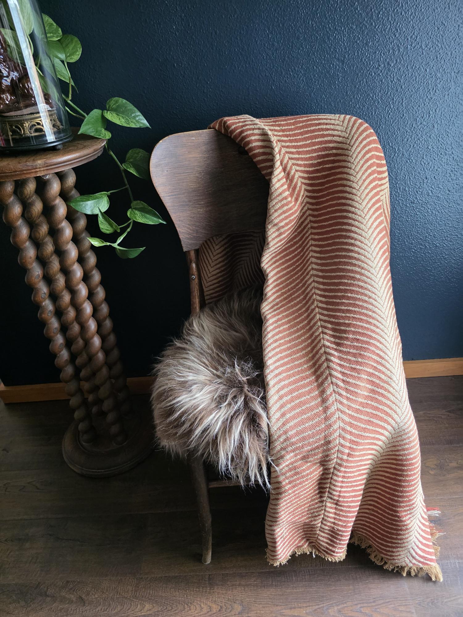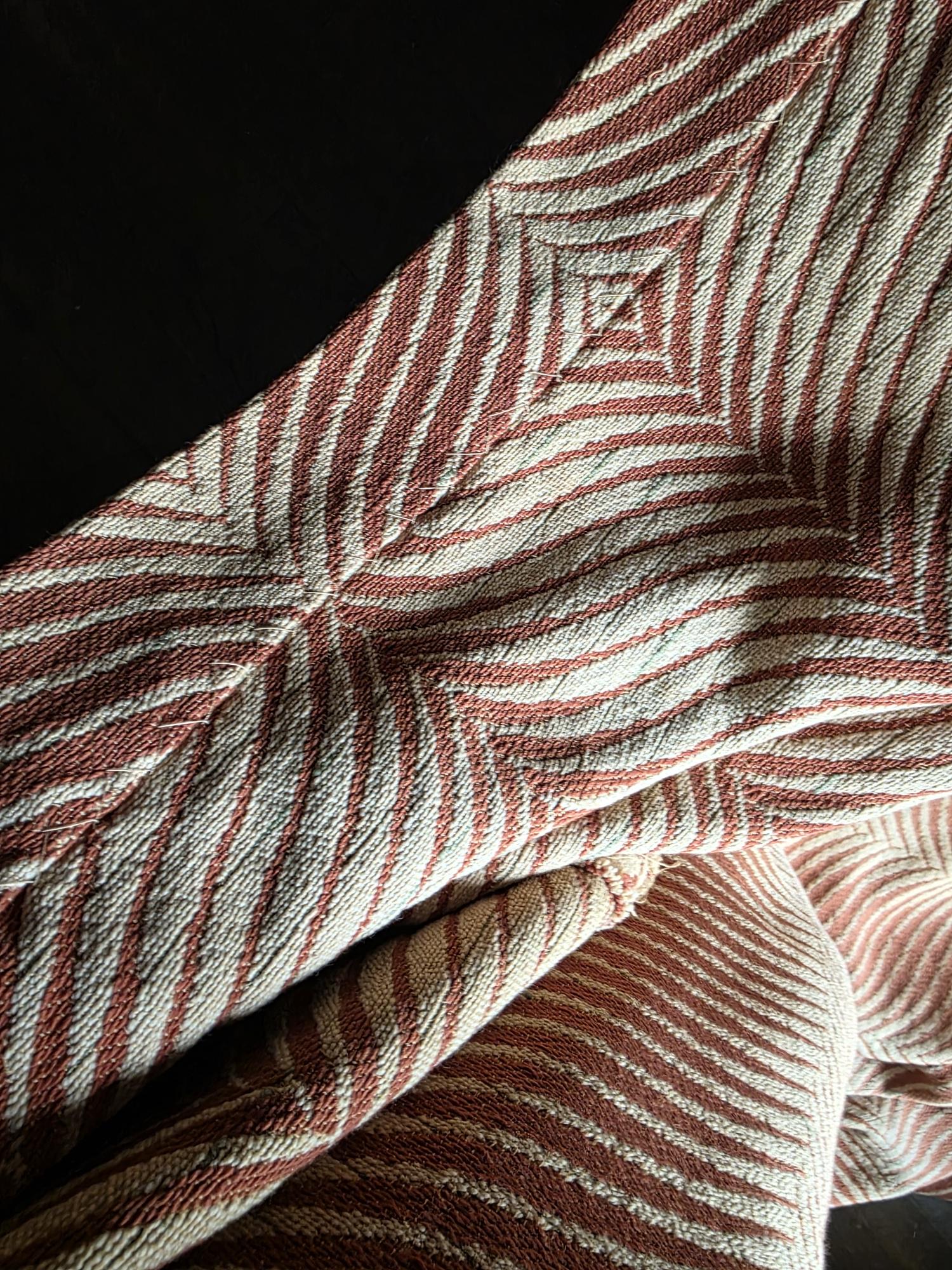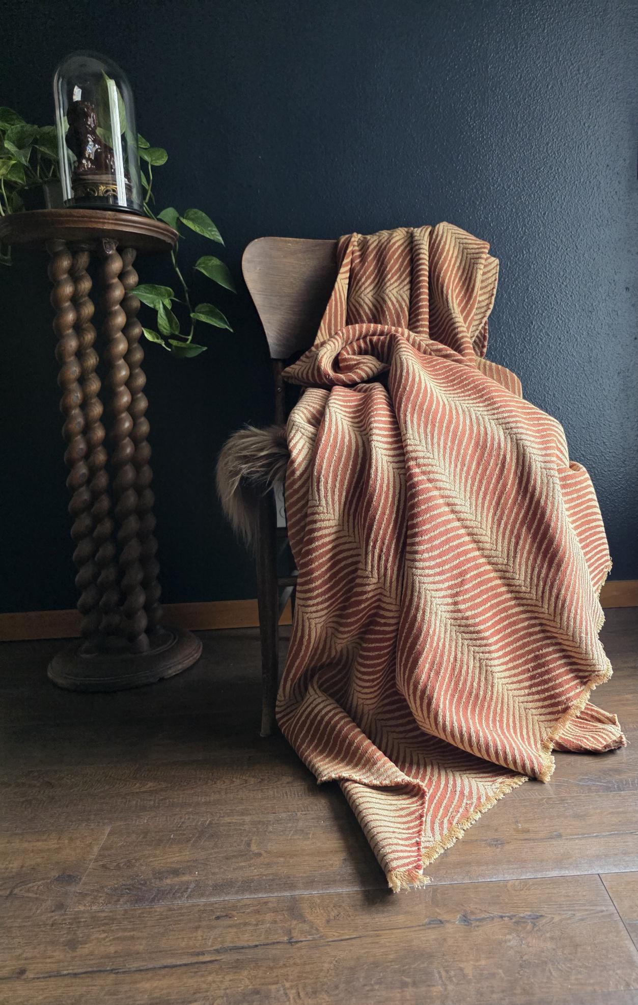 Presenting a substantial and highly textural vintage woven textile, offering a generous 108 by 70 inches of heavy-duty fabric. This striking piece features a warm, earthy palette of rust and natural cream, tightly woven into an eye-catching, undulating chevron or wavy striped pattern. Constructed from distinct panels traditionally seamed together down the center, the fabric boasts a thick, durable hand-feel and beautifully frayed, fringed edges that highlight its authentic, aged character. While its weathered condition, loose threads, and minor wear speak to its long history as a utilitarian textile, the sheer scale and robust weight make it an exceptional cutter piece for creative repurposing. Whether casually draped to soften an Industrial space, or repurposed into bespoke floor cushions and sturdy upholstery to anchor a Moody Vintage interior, this versatile scrap provides abundant yardage and rich, tactile depth for your next curated design project.