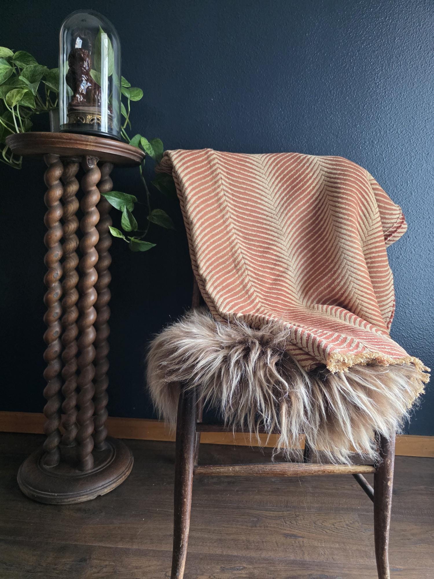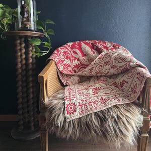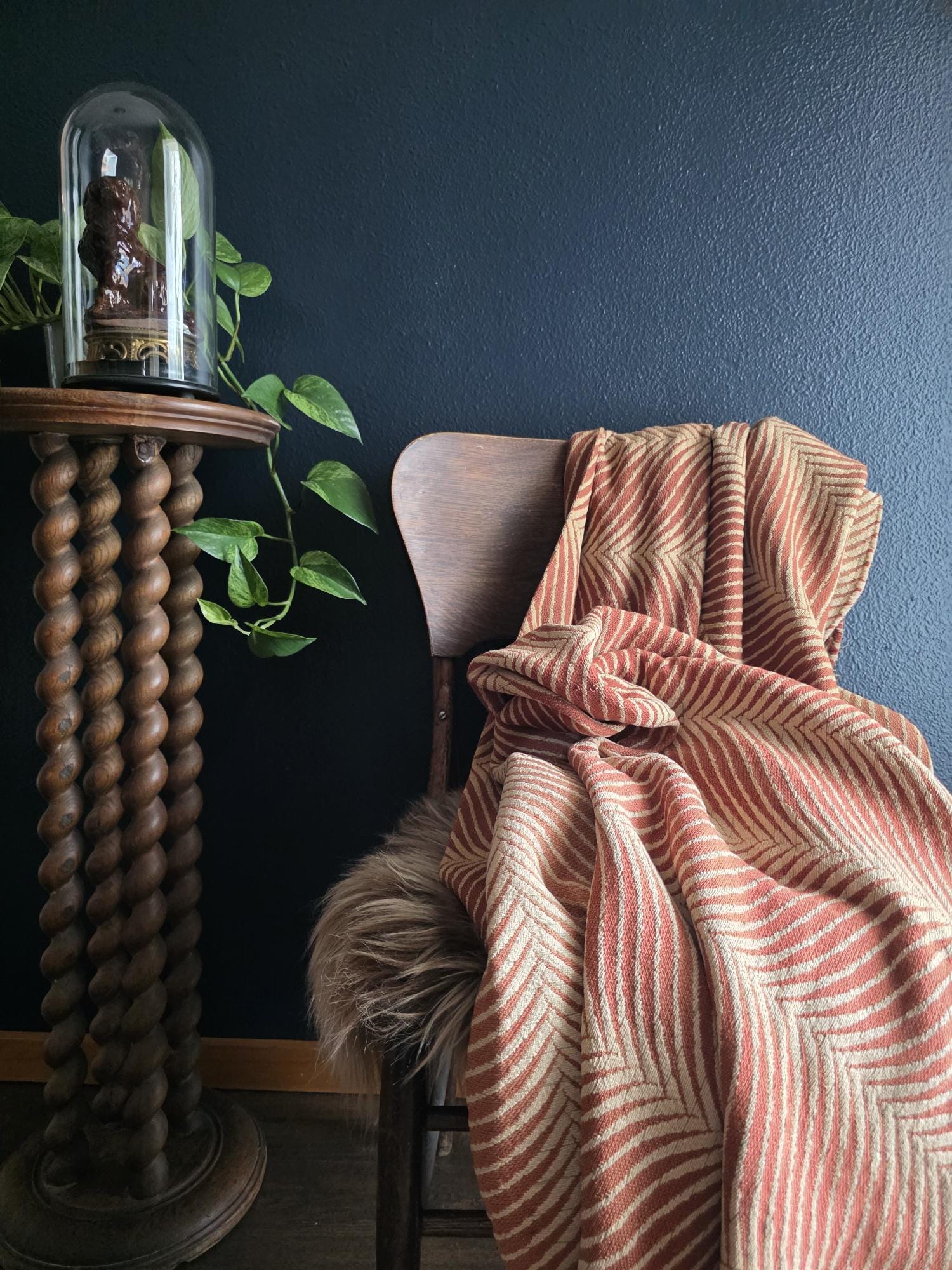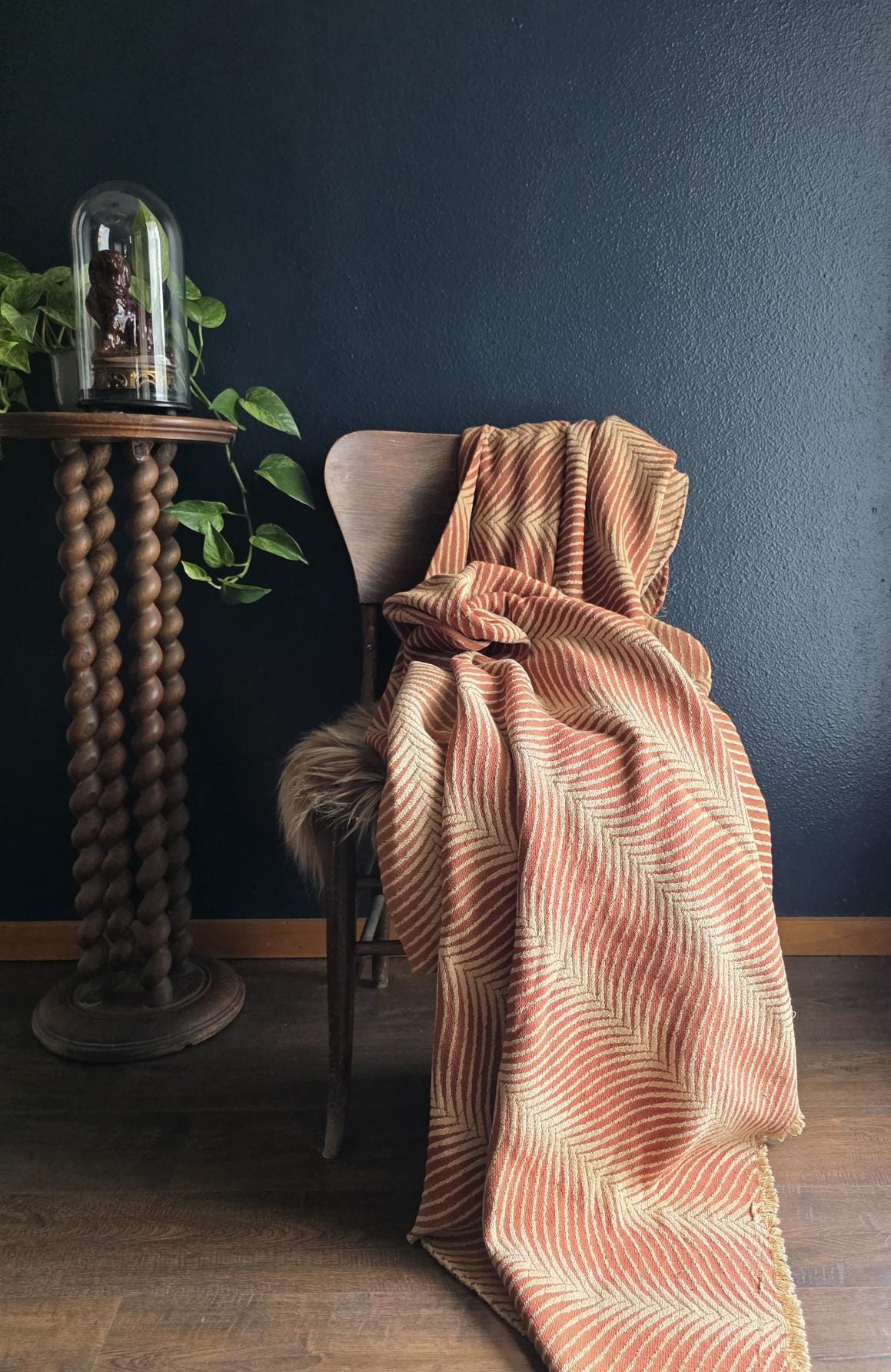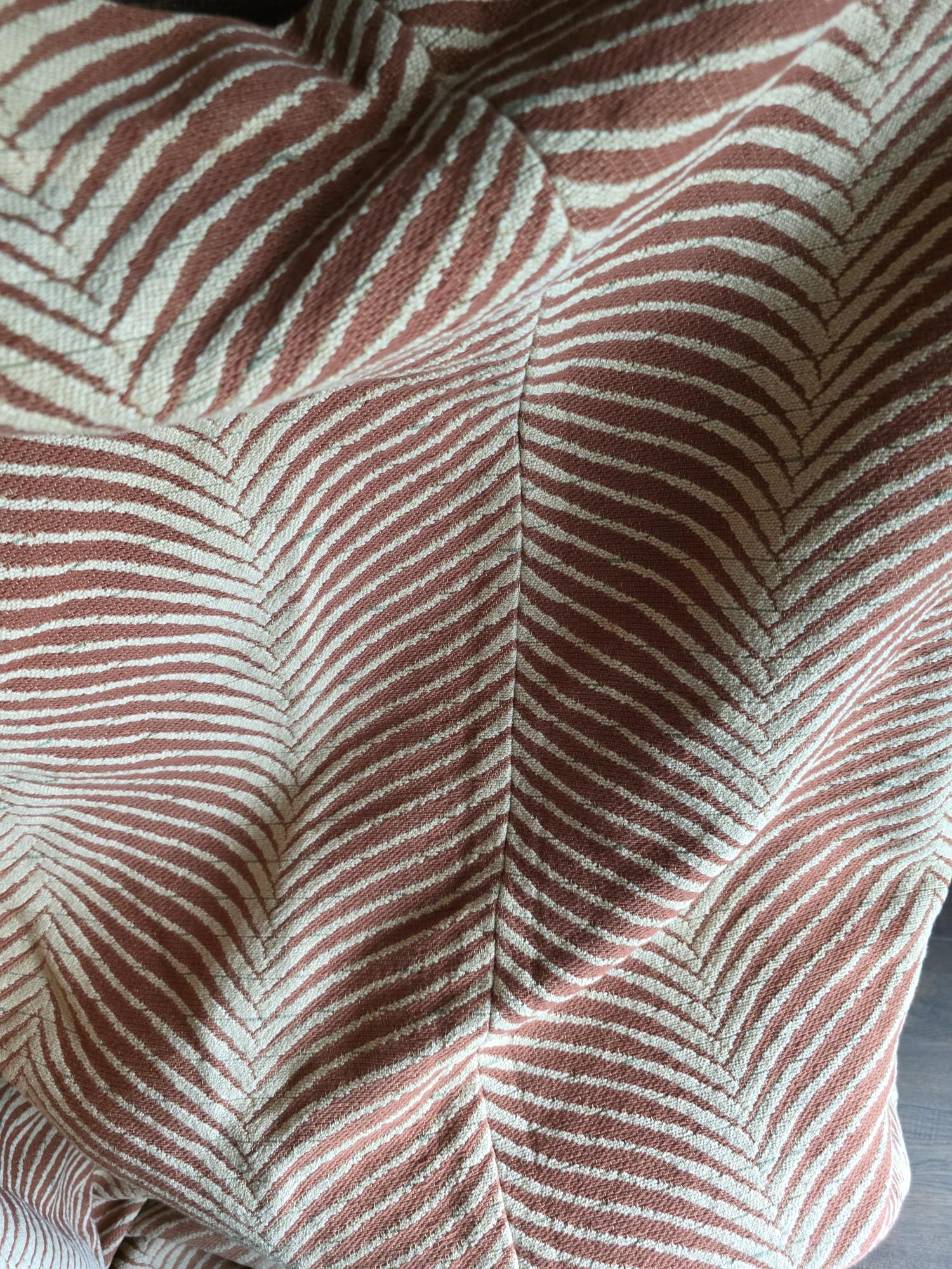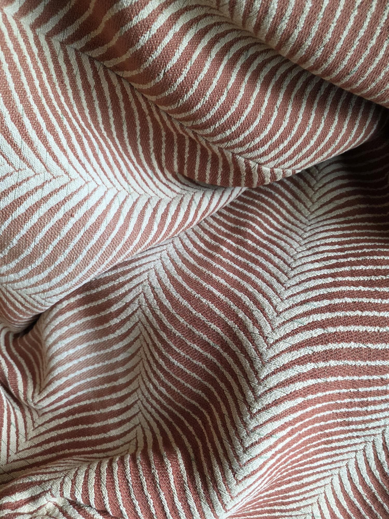 Presenting a substantial and highly textural vintage woven textile, offering a generous 108 by 70 inches of heavy-duty fabric. This striking piece features a warm, earthy palette of rust and natural cream, tightly woven into an eye-catching, undulating chevron or wavy striped pattern. Constructed from distinct panels traditionally seamed together down the center, the fabric boasts a thick, durable hand-feel and beautifully frayed, fringed edges that highlight its authentic, aged character. While its weathered condition, loose threads, and minor wear speak to its long history as a utilitarian textile, the sheer scale and robust weight make it an exceptional cutter piece for creative repurposing. Whether casually draped to soften an Industrial space, or repurposed into bespoke floor cushions and sturdy upholstery to anchor a Moody Vintage interior, this versatile scrap provides abundant yardage and rich, tactile depth for your next curated design project.
