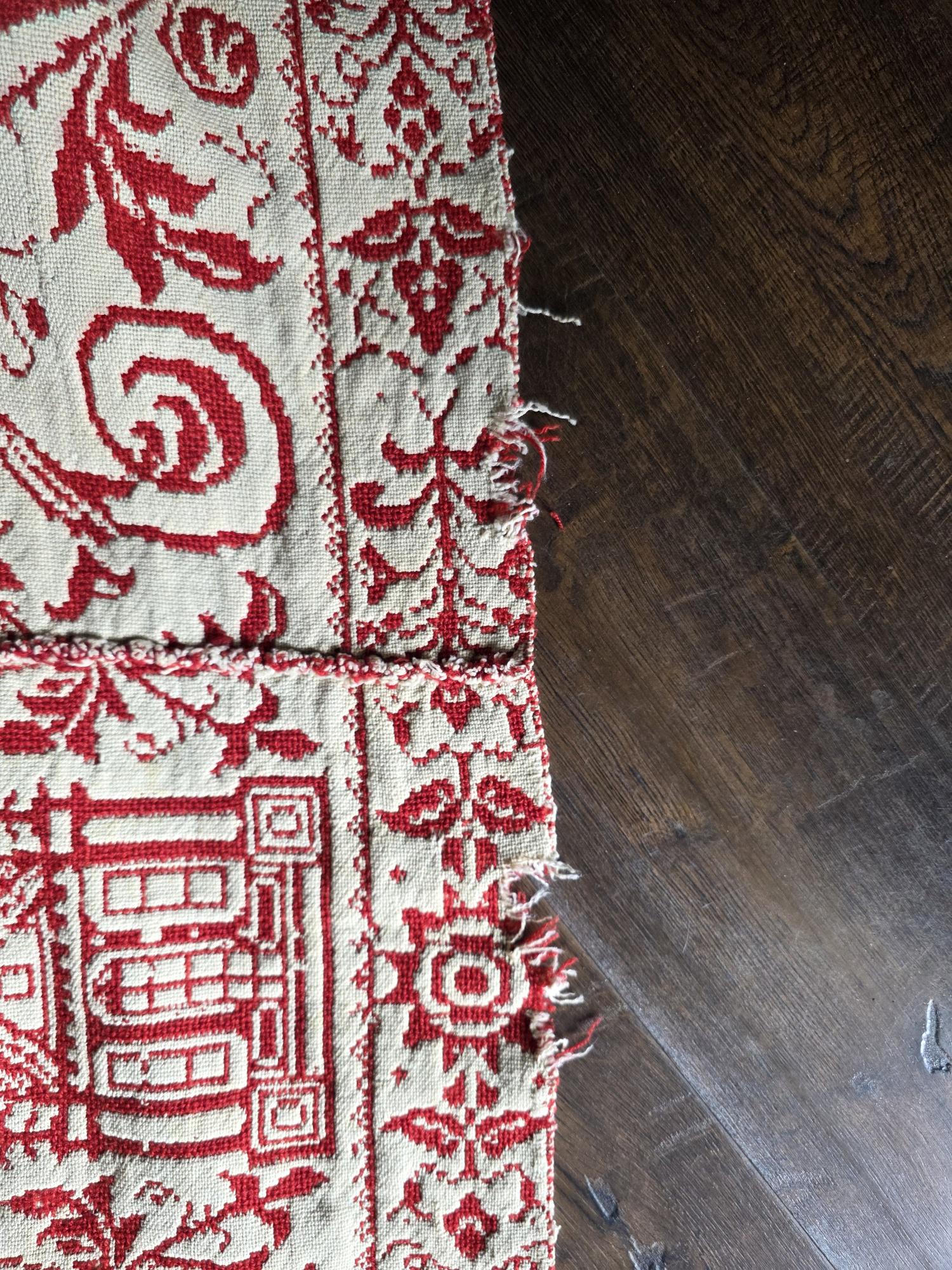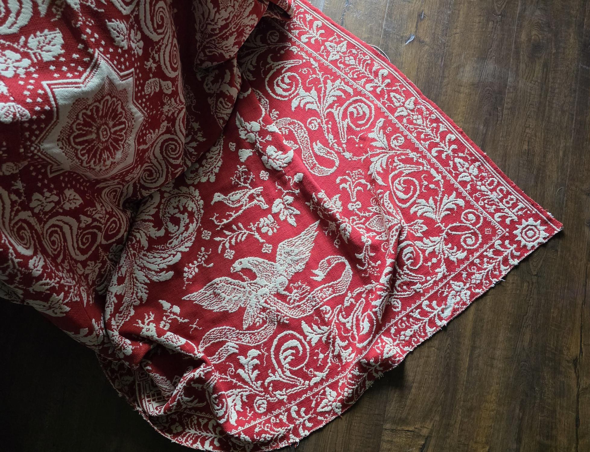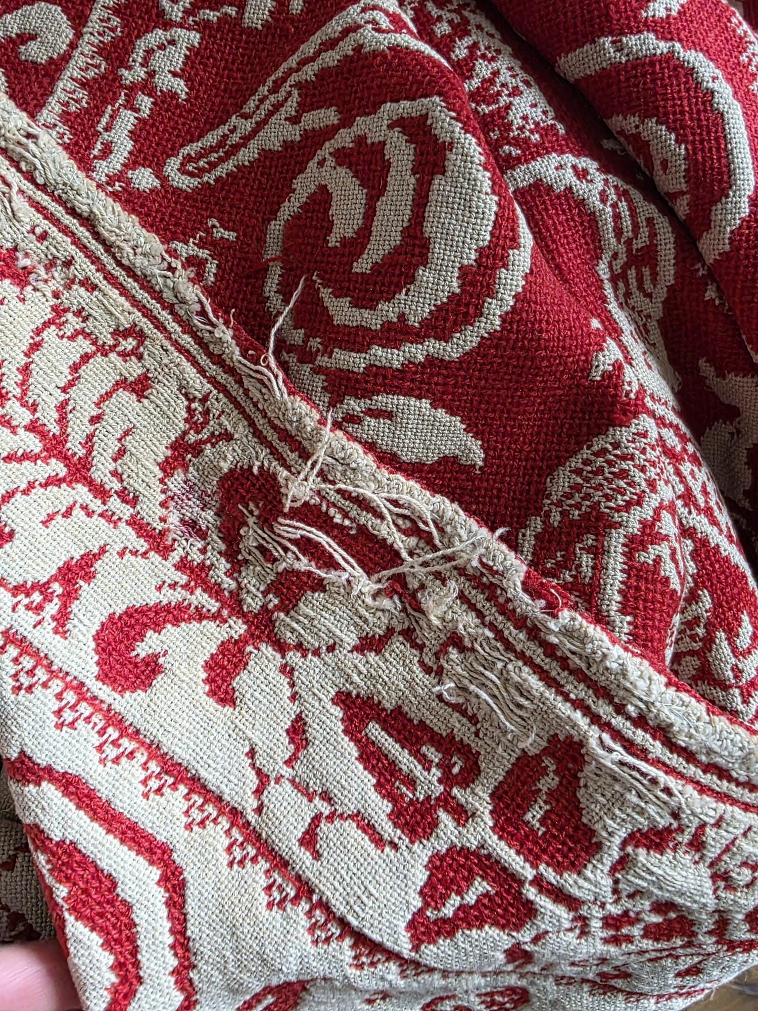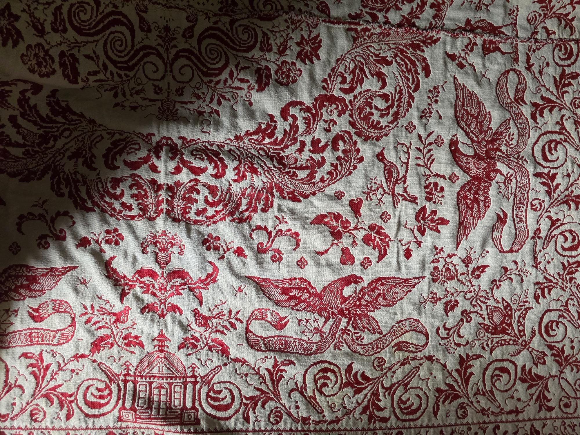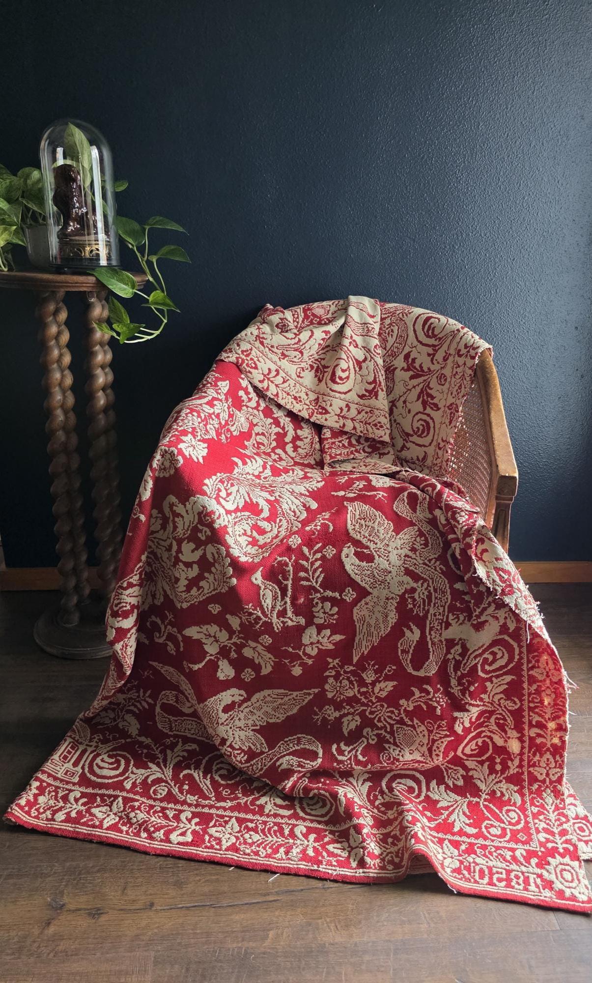 Presenting a remarkable antique reversible Jacquard woven coverlet, a stunning piece of textile history proudly bearing the woven date of 1850 in its corner blocks. Crafted in a graphic two-tone palette of deep crimson red and natural cream, this traditional center-seamed textile (woven in two panel and hand stitched together) features a rich array of classic Americana motifs. The elaborate design includes prominent eagles with banners, charming churches or meetinghouses, stylized deer, birds, and intricate foliate scrollwork. This piece wears its 170-plus years of history openly, presented in a beautifully worn and distressed antique condition. With frayed edges, visible thinning, and scattered small holes, this delicate textile is no longer suitable for daily use or prolonged wear. However, it serves as an exceptional foundational display piece. Whether artfully draped over a quilt ladder in a rustic Farmhouse setting, carefully folded inside a glass display cabinet, or utilized as a textural, historic backdrop for a Moody Vintage or Dark Academia vignette, its authentic character and striking reversible pattern remain a captivating focal point.