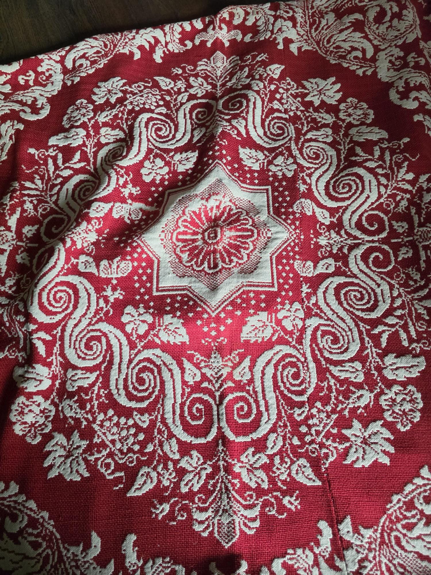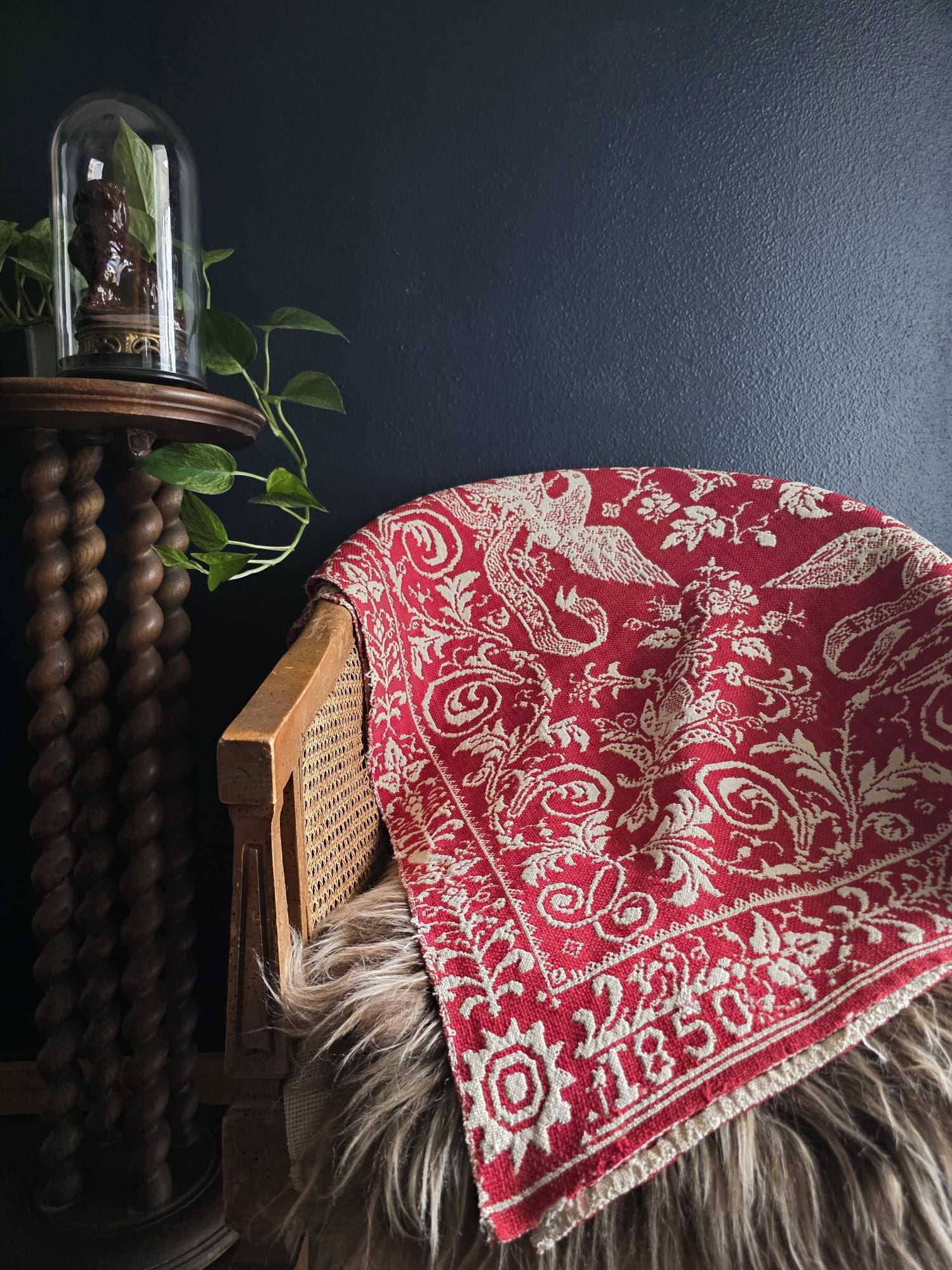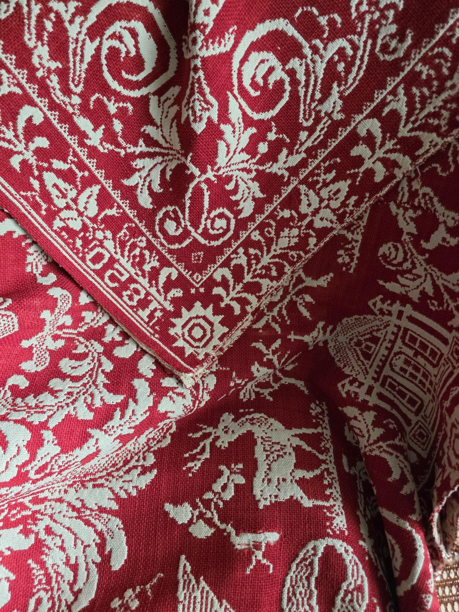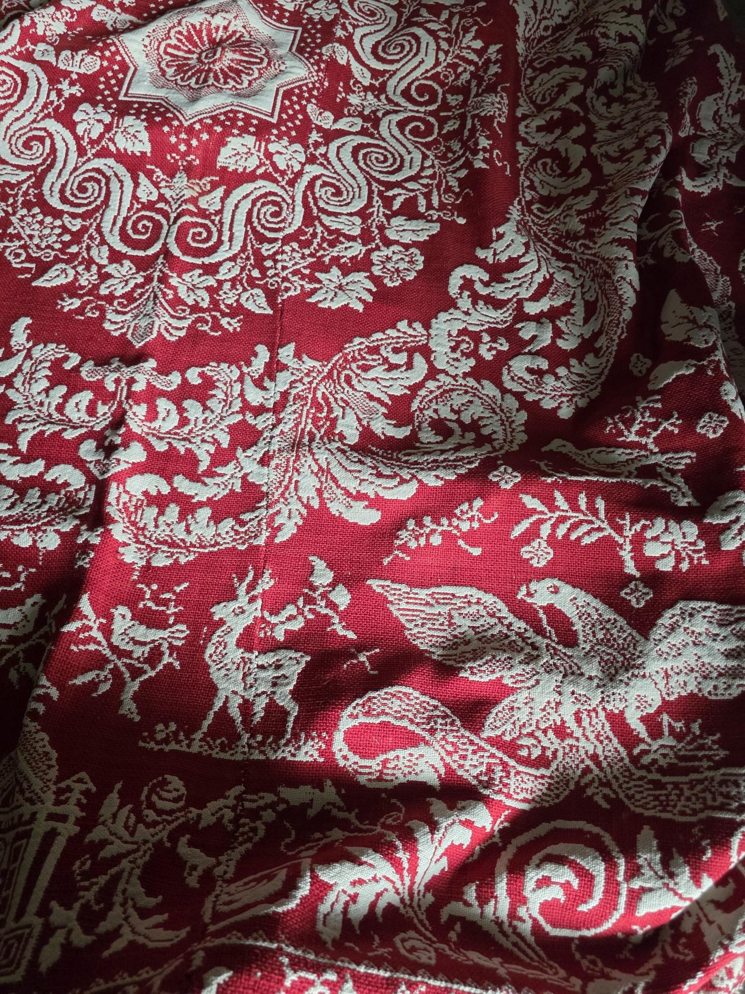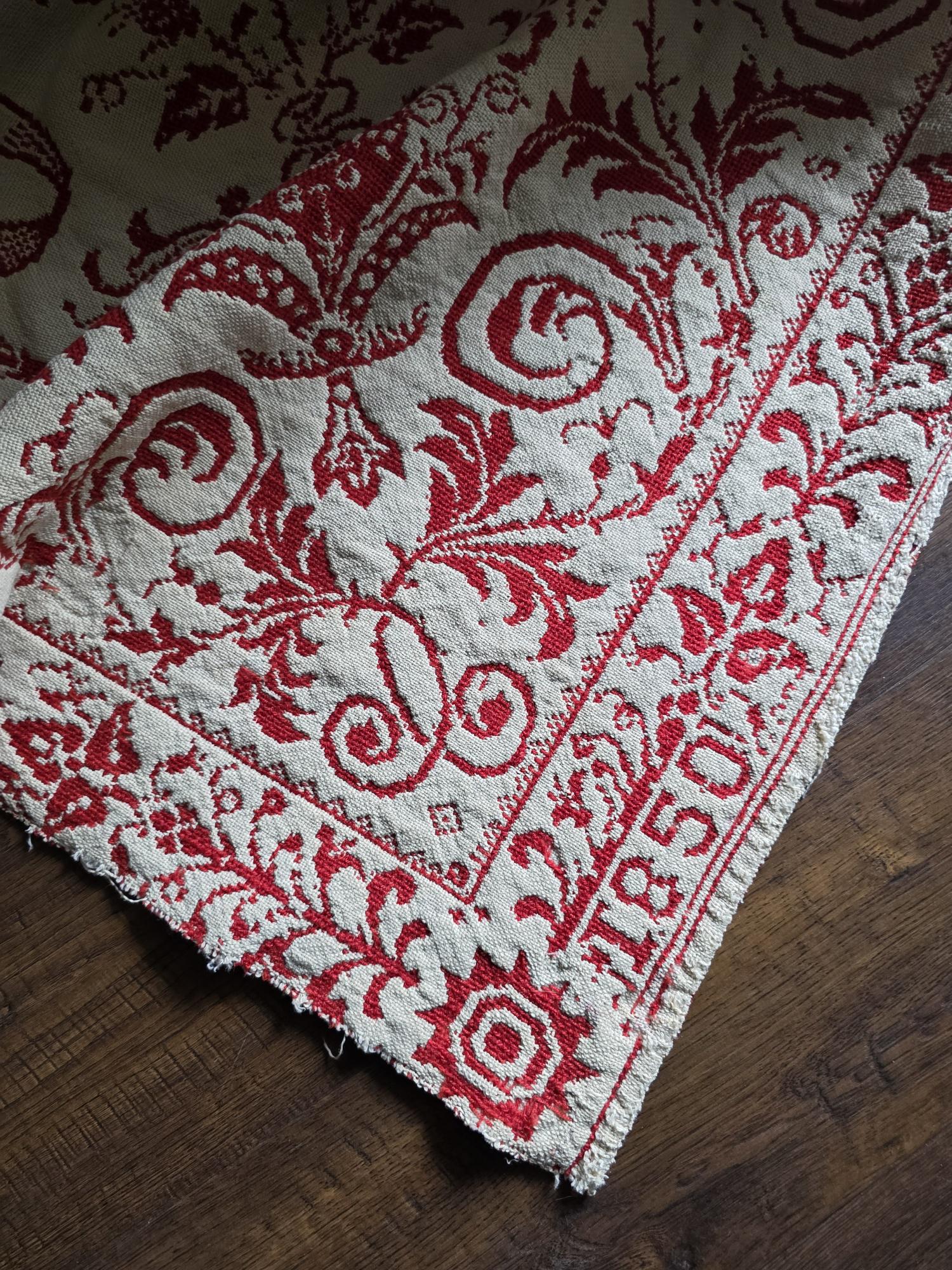 Presenting a remarkable antique reversible Jacquard woven coverlet, a stunning piece of textile history proudly bearing the woven date of 1850 in its corner blocks. Crafted in a graphic two-tone palette of deep crimson red and natural cream, this traditional center-seamed textile (woven in two panel and hand stitched together) features a rich array of classic Americana motifs. The elaborate design includes prominent eagles with banners, charming churches or meetinghouses, stylized deer, birds, and intricate foliate scrollwork. This piece wears its 170-plus years of history openly, presented in a beautifully worn and distressed antique condition. With frayed edges, visible thinning, and scattered small holes, this delicate textile is no longer suitable for daily use or prolonged wear. However, it serves as an exceptional foundational display piece. Whether artfully draped over a quilt ladder in a rustic Farmhouse setting, carefully folded inside a glass display cabinet, or utilized as a textural, historic backdrop for a Moody Vintage or Dark Academia vignette, its authentic character and striking reversible pattern remain a captivating focal point.