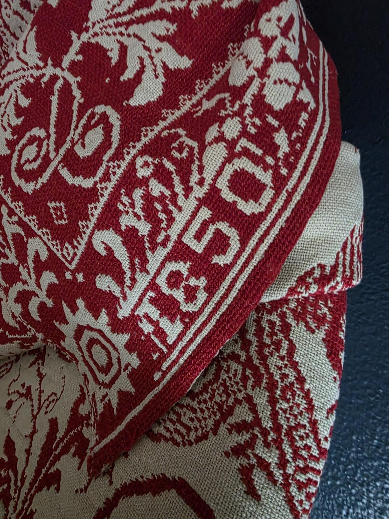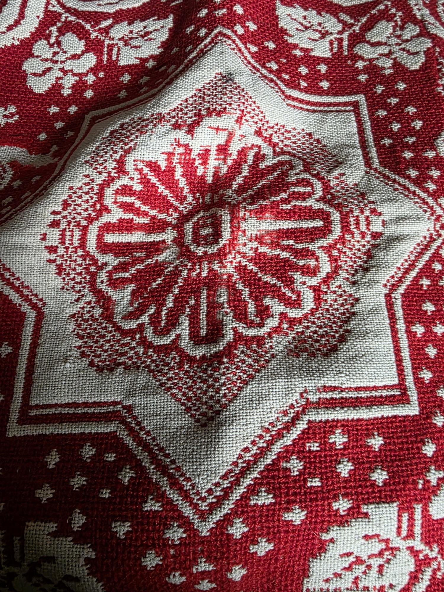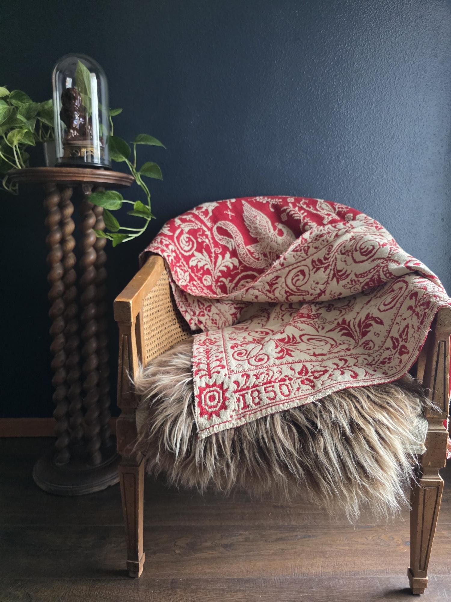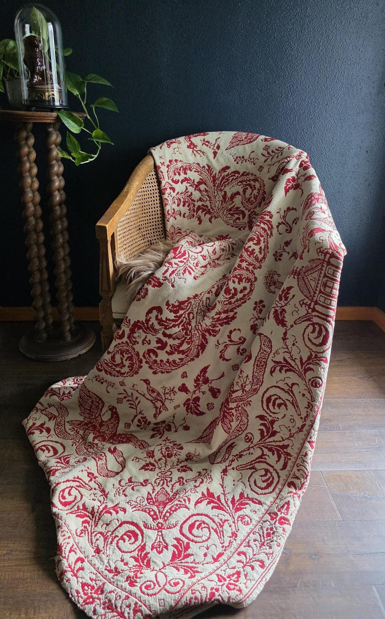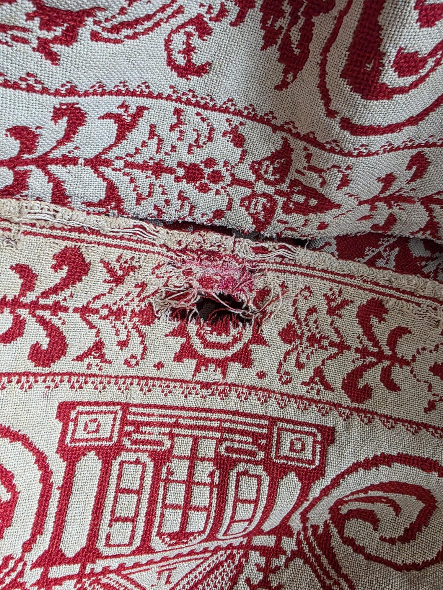 Presenting a remarkable antique reversible Jacquard woven coverlet, a stunning piece of textile history proudly bearing the woven date of 1850 in its corner blocks. Crafted in a graphic two-tone palette of deep crimson red and natural cream, this traditional center-seamed textile (woven in two panel and hand stitched together) features a rich array of classic Americana motifs. The elaborate design includes prominent eagles with banners, charming churches or meetinghouses, stylized deer, birds, and intricate foliate scrollwork. This piece wears its 170-plus years of history openly, presented in a beautifully worn and distressed antique condition. With frayed edges, visible thinning, and scattered small holes, this delicate textile is no longer suitable for daily use or prolonged wear. However, it serves as an exceptional foundational display piece. Whether artfully draped over a quilt ladder in a rustic Farmhouse setting, carefully folded inside a glass display cabinet, or utilized as a textural, historic backdrop for a Moody Vintage or Dark Academia vignette, its authentic character and striking reversible pattern remain a captivating focal point.
