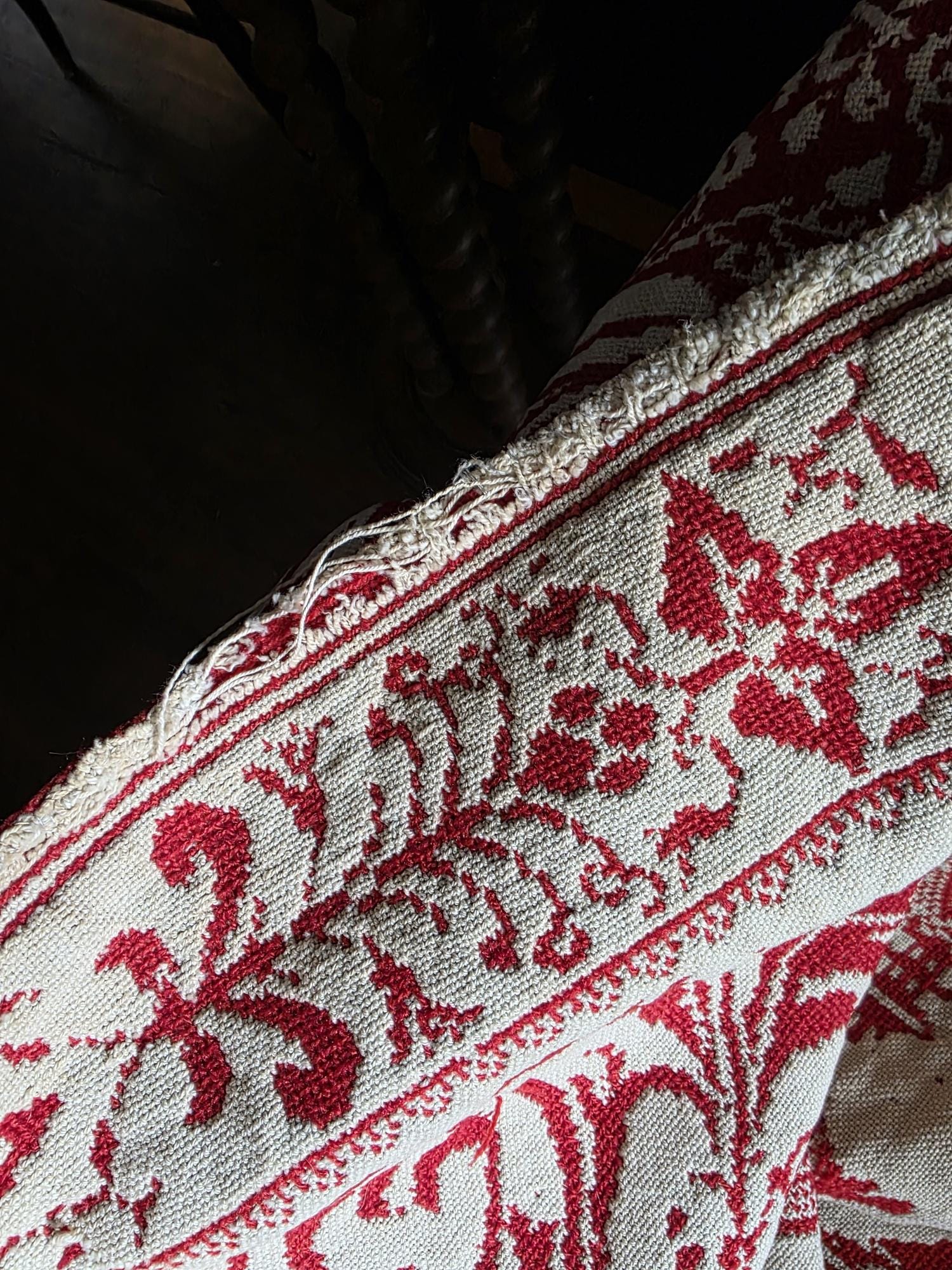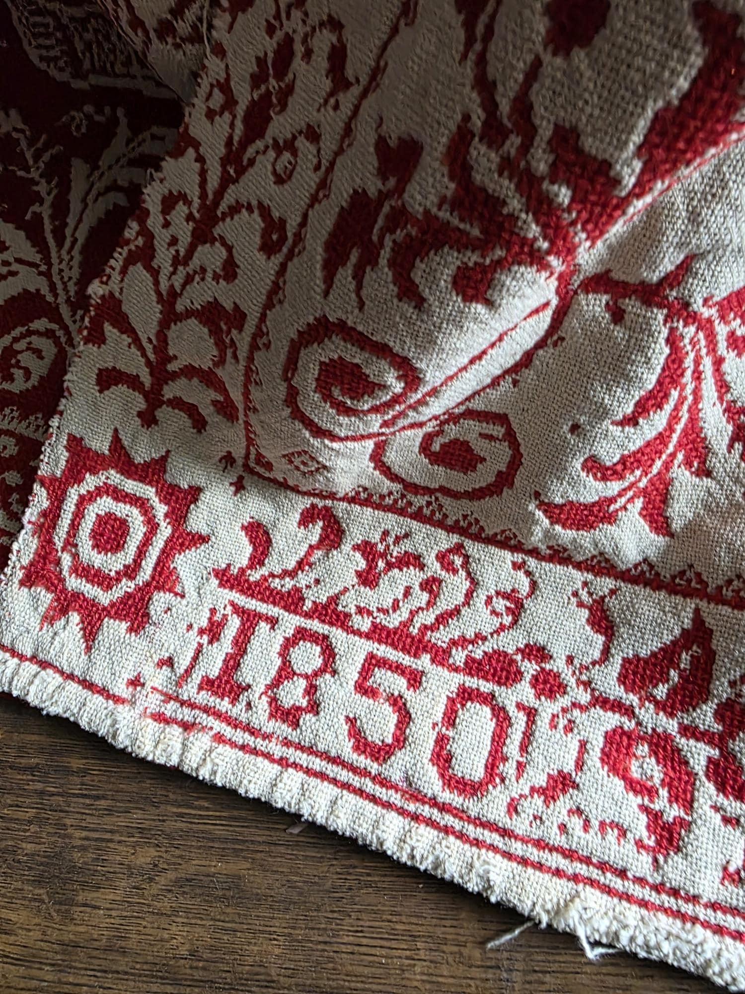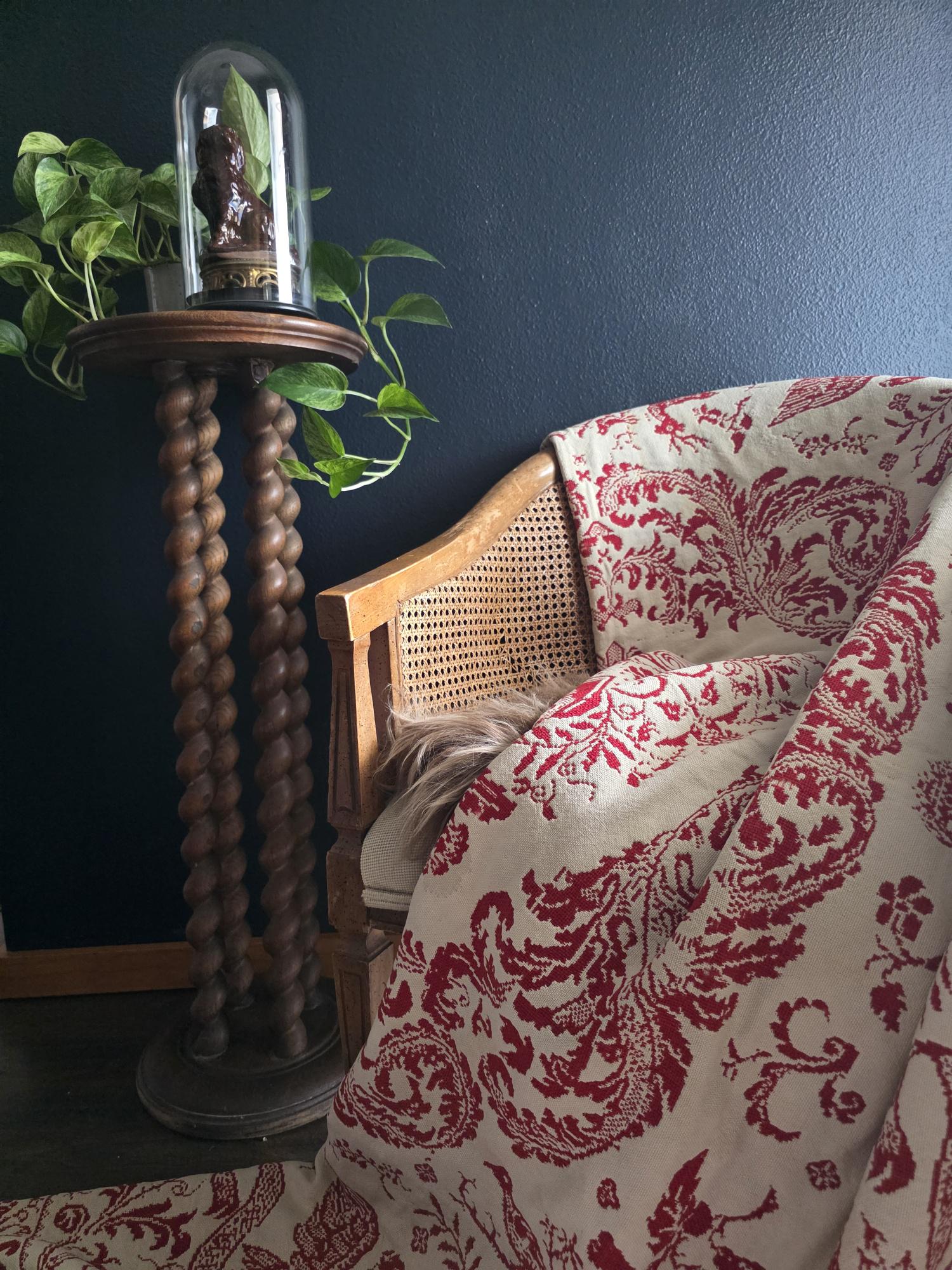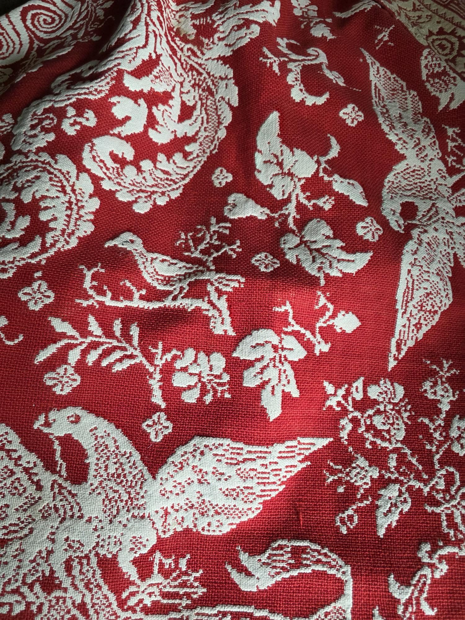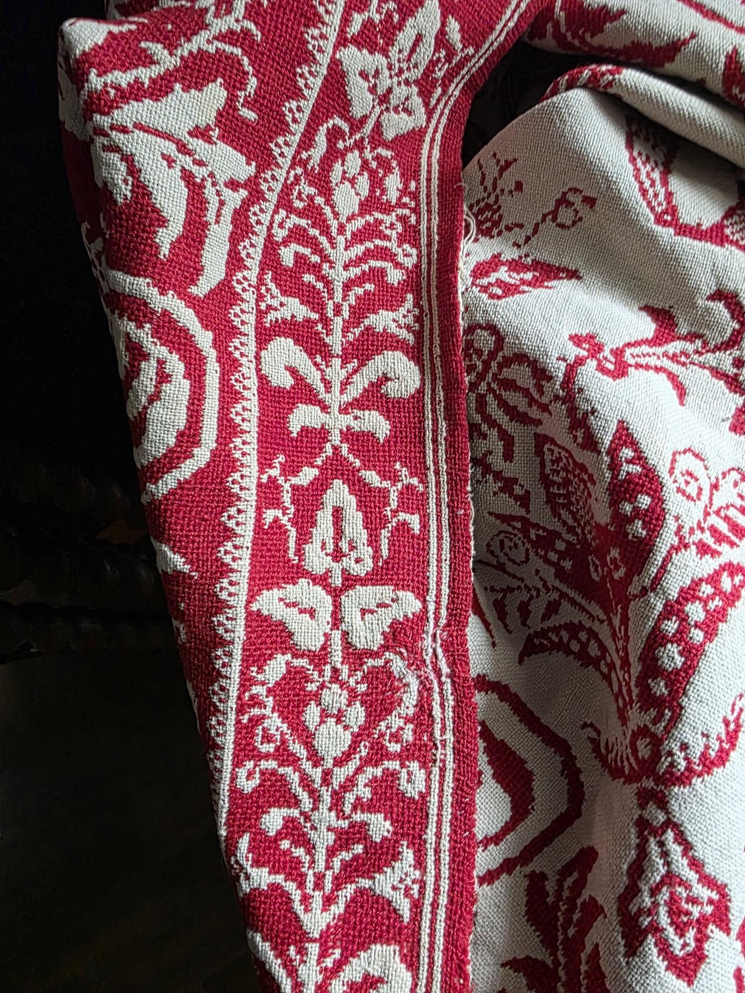 Presenting a remarkable antique reversible Jacquard woven coverlet, a stunning piece of textile history proudly bearing the woven date of 1850 in its corner blocks. Crafted in a graphic two-tone palette of deep crimson red and natural cream, this traditional center-seamed textile (woven in two panel and hand stitched together) features a rich array of classic Americana motifs. The elaborate design includes prominent eagles with banners, charming churches or meetinghouses, stylized deer, birds, and intricate foliate scrollwork. This piece wears its 170-plus years of history openly, presented in a beautifully worn and distressed antique condition. With frayed edges, visible thinning, and scattered small holes, this delicate textile is no longer suitable for daily use or prolonged wear. However, it serves as an exceptional foundational display piece. Whether artfully draped over a quilt ladder in a rustic Farmhouse setting, carefully folded inside a glass display cabinet, or utilized as a textural, historic backdrop for a Moody Vintage or Dark Academia vignette, its authentic character and striking reversible pattern remain a captivating focal point.